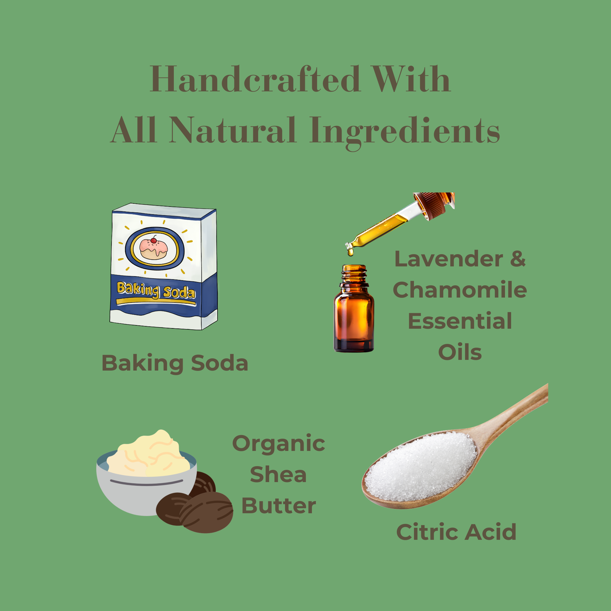 Ingredients: Sodium Bicarbonate, Citric Acid, Organic Shea Butter, Polysorbate 80, Pure Lavender Essential Oil, Pure Chamomile Essential Oil, Cosmetic Grade Mica