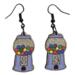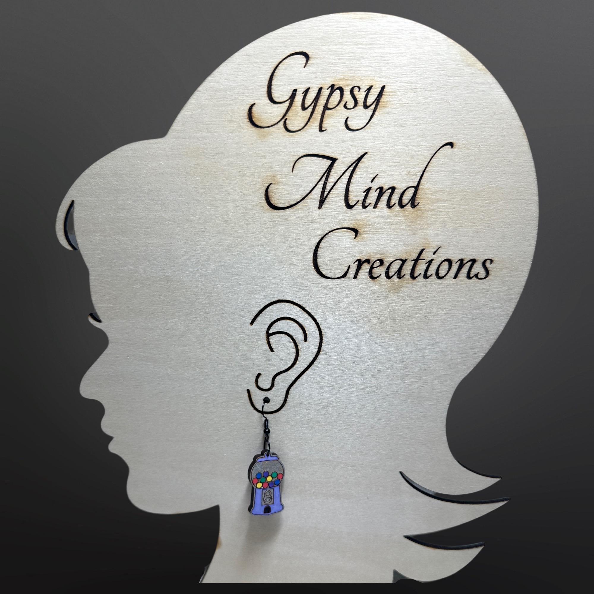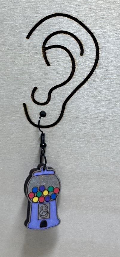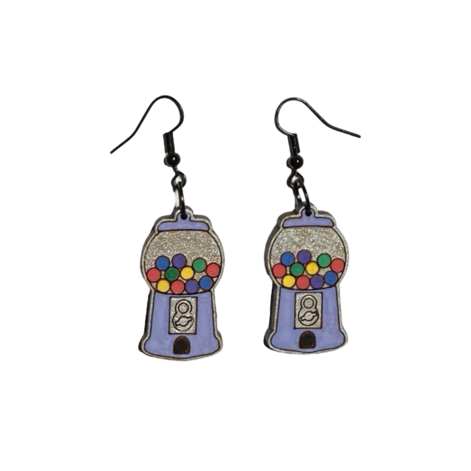 These are a pair of laser cut lightweight lavender gumball machine hand painted wood dangle earrings. They are made from 1/8 in thick medium draftboard and are painted with acrylic paint. The back is also painted but there is no design on it. They are not sealed with any clear coat or anything. They are on ear wires. All metal components are silver, gold, or brass plated, or black alloy, nickel & lead free, and hypoallergenic. They are approx. 1" in long. Backs not included but available upon request.