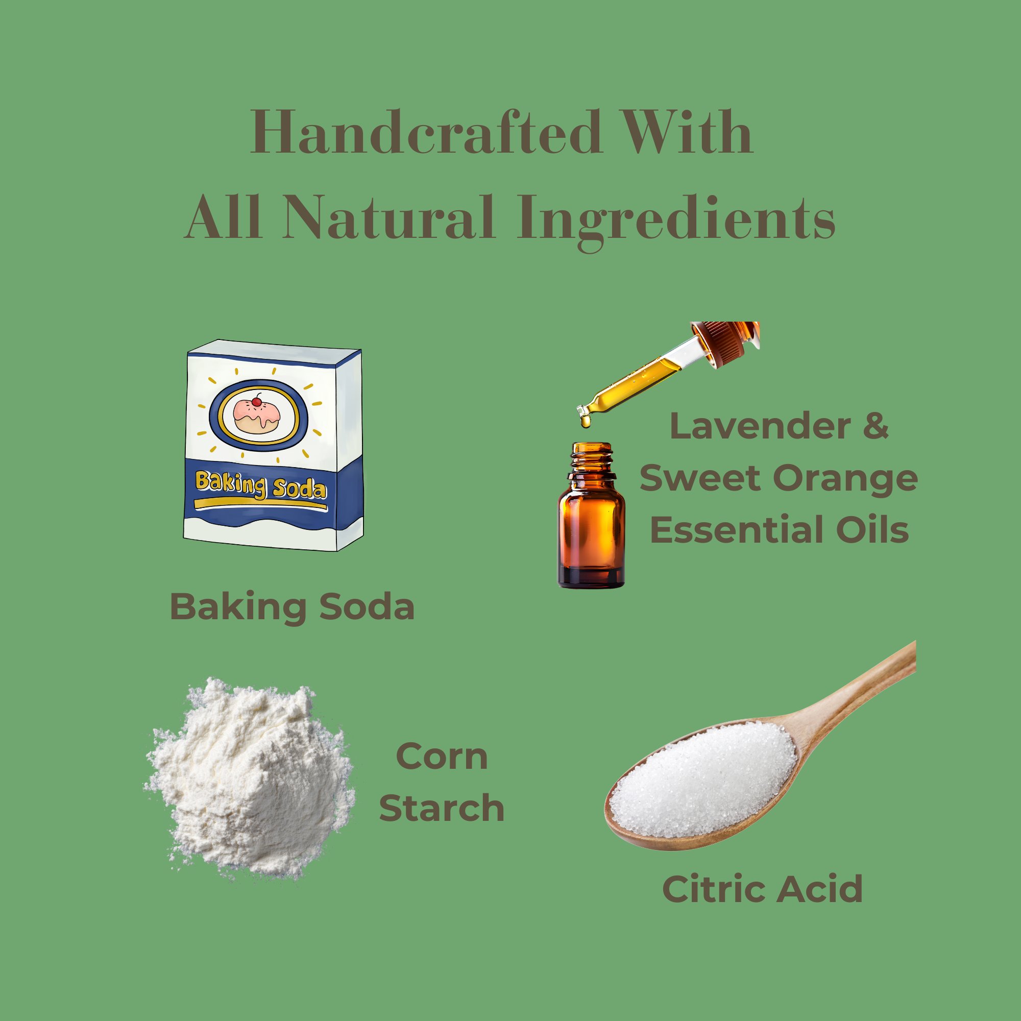 Ingredients: Baking Soda, Citric Acid, Corn Starch, Cosmetic Grade Mica, Lavender Essential Oil, Sweet Orange Essential Oil