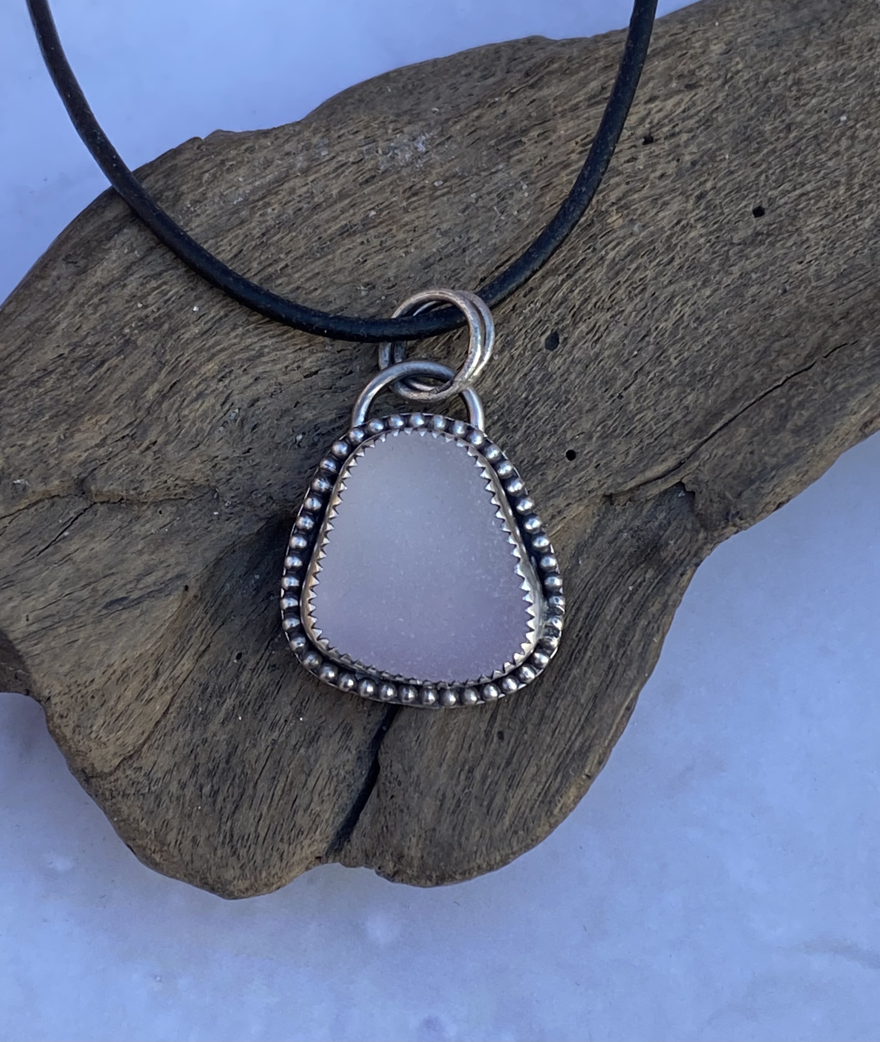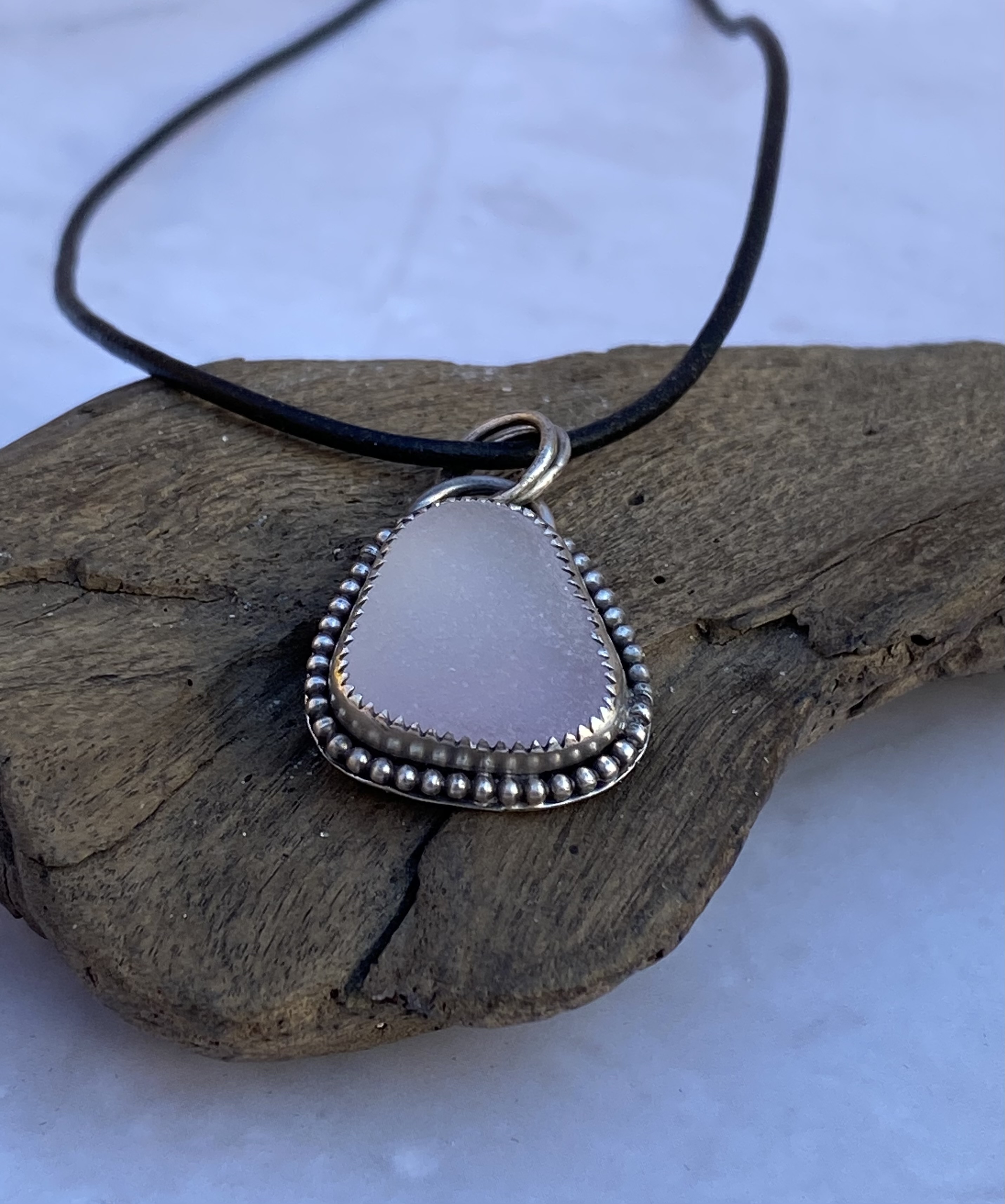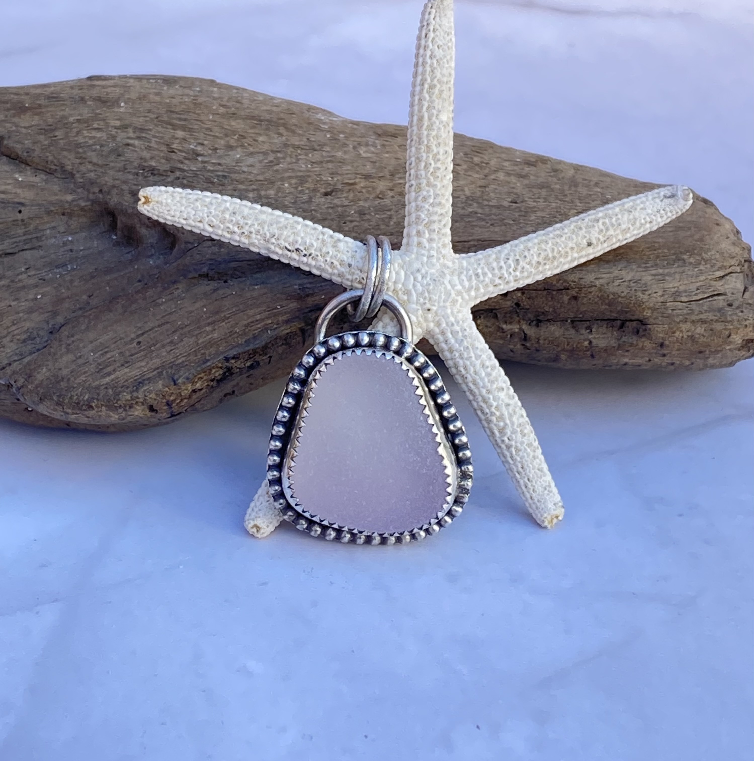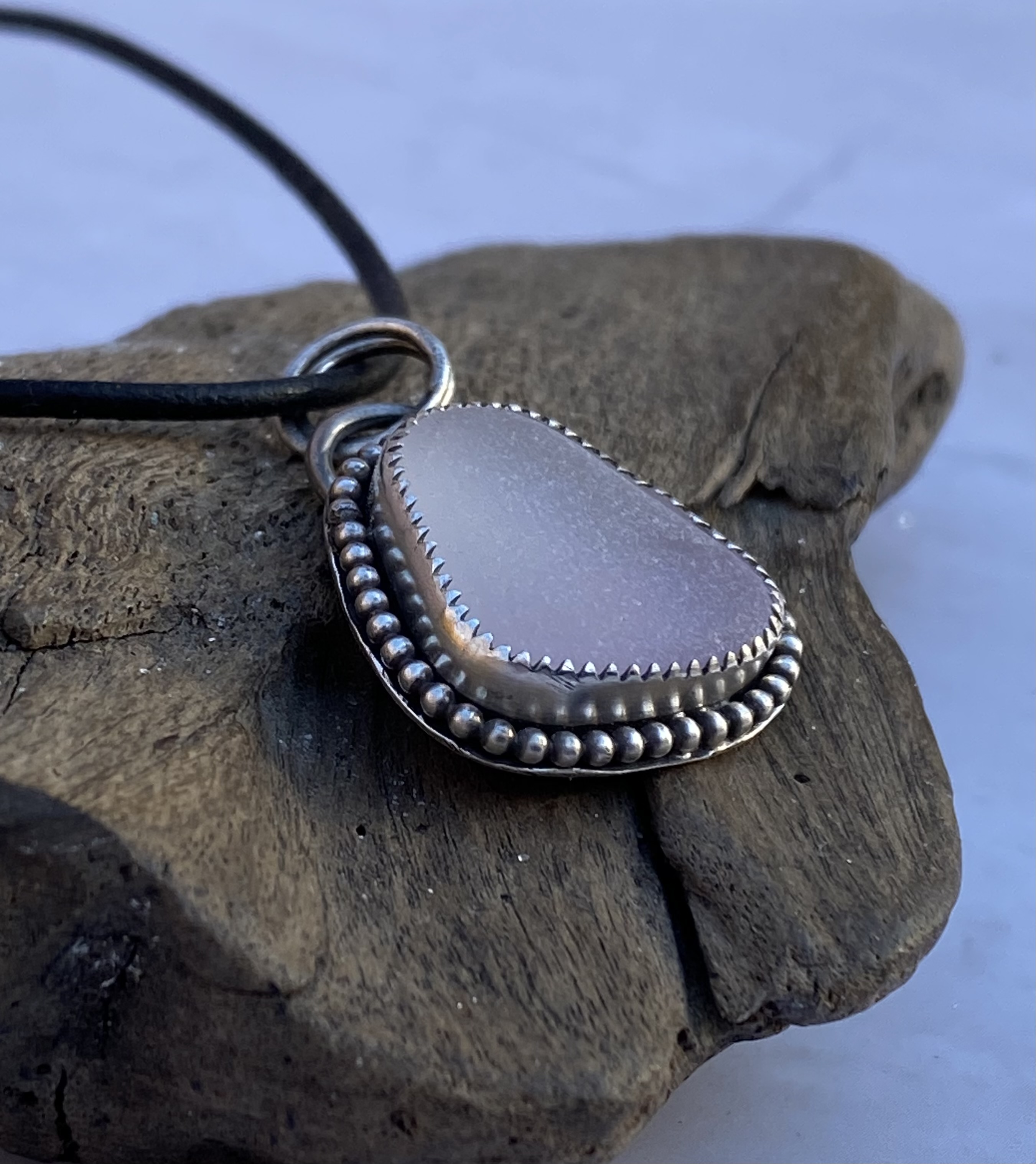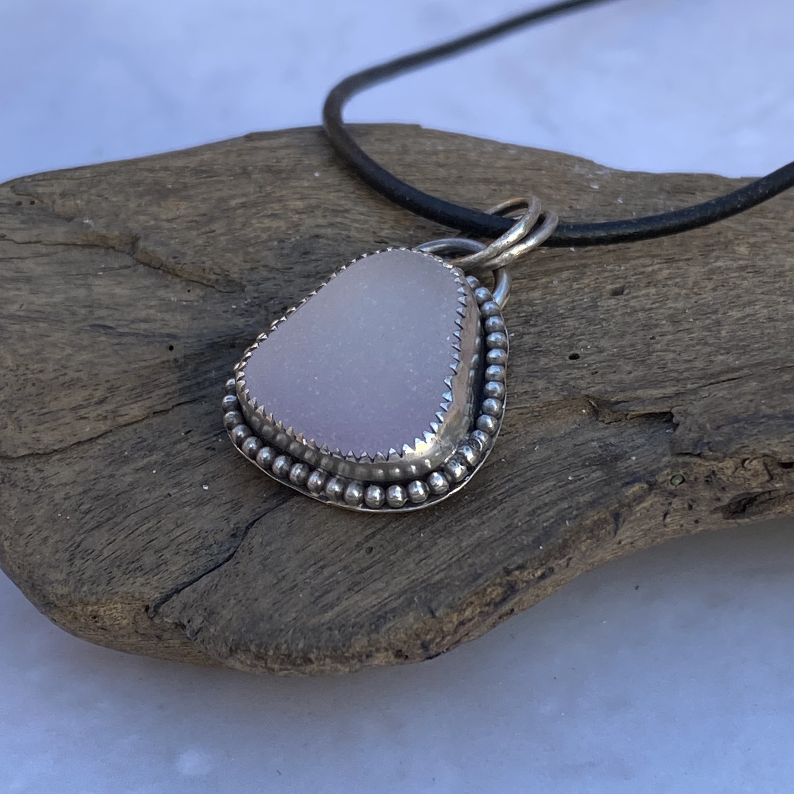 This lavender sea glass color is so soft & pretty! It is from Puerto Rico & I can see why the sea glass hunter held onto it for so long! I set it in .925 sterling silver with a serrated-edge bezel & framed it with a beaded wire. Antiquing the silver allows the color to really be the star & it certainly is in this piece. Healing properties are listed below. The measurement is approximately 1-1/4"x3/4". This price is for the pendant only. If you would like a chain or cord, please message me for pricing.