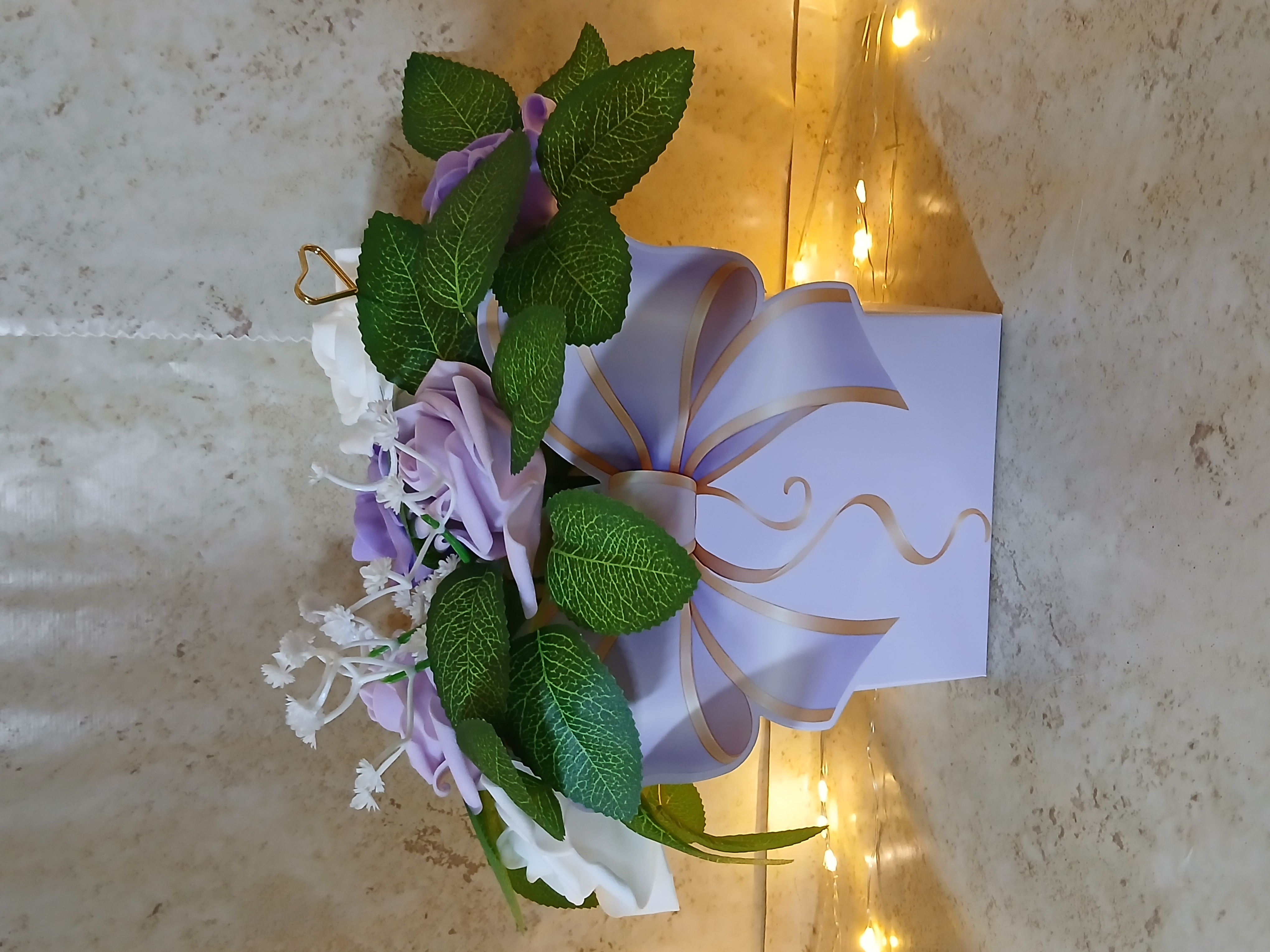 Lavender with gold trim bow box measures 4x4 and has purple and white foam roses look just like there real thing great for Valentine's day or mothers day