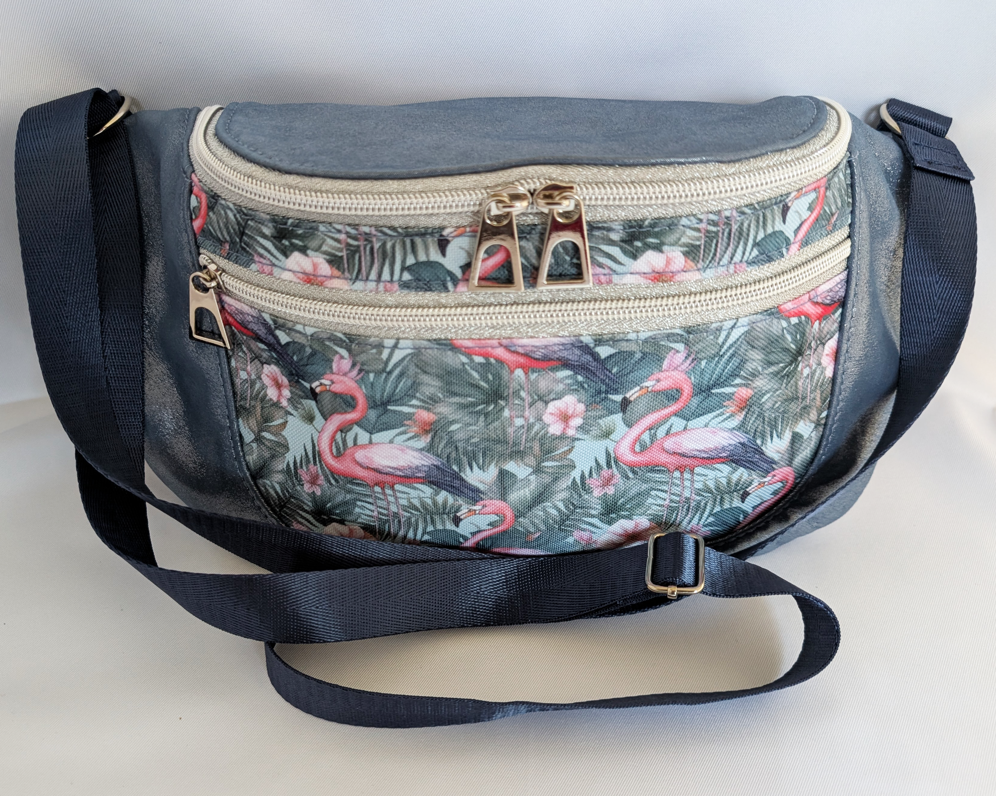 This cute bag is made from light blue leather that has a sparkle finish and a Flamingo print waterproof canvas front zipper panel. Inside there are six credit cards slots with a zipper pocket above and plenty of room for a phone, wallet, keys, and other valuables. On the back is another large zipper pocket. The strap is durable navy blue nylon webbing and adjusts from "31 to 58". Wear it as a crossbody to have your hands free. The bag measures 14" wide by 8" tall and 4.5" deep at it's widest point. It's fully lined with durable waterproof canvas and has silver hardware.