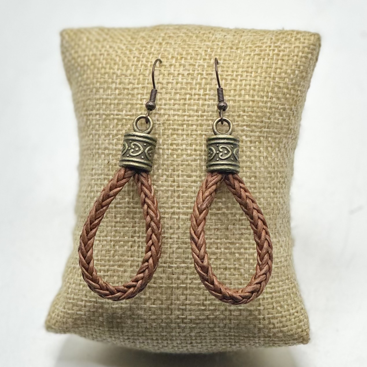 These handcrafted earrings feature a Tan braided leather formed into a soft loop and finished with an ornate brass-tone cap. Lightweight yet bold, they strike the perfect balance between rustic charm and refined detail. the textured leather adds an earthy edge, while the intricate metalwork brings a touch of bohemian sophistication. Ideal for everyday wear with a little wild spirit.