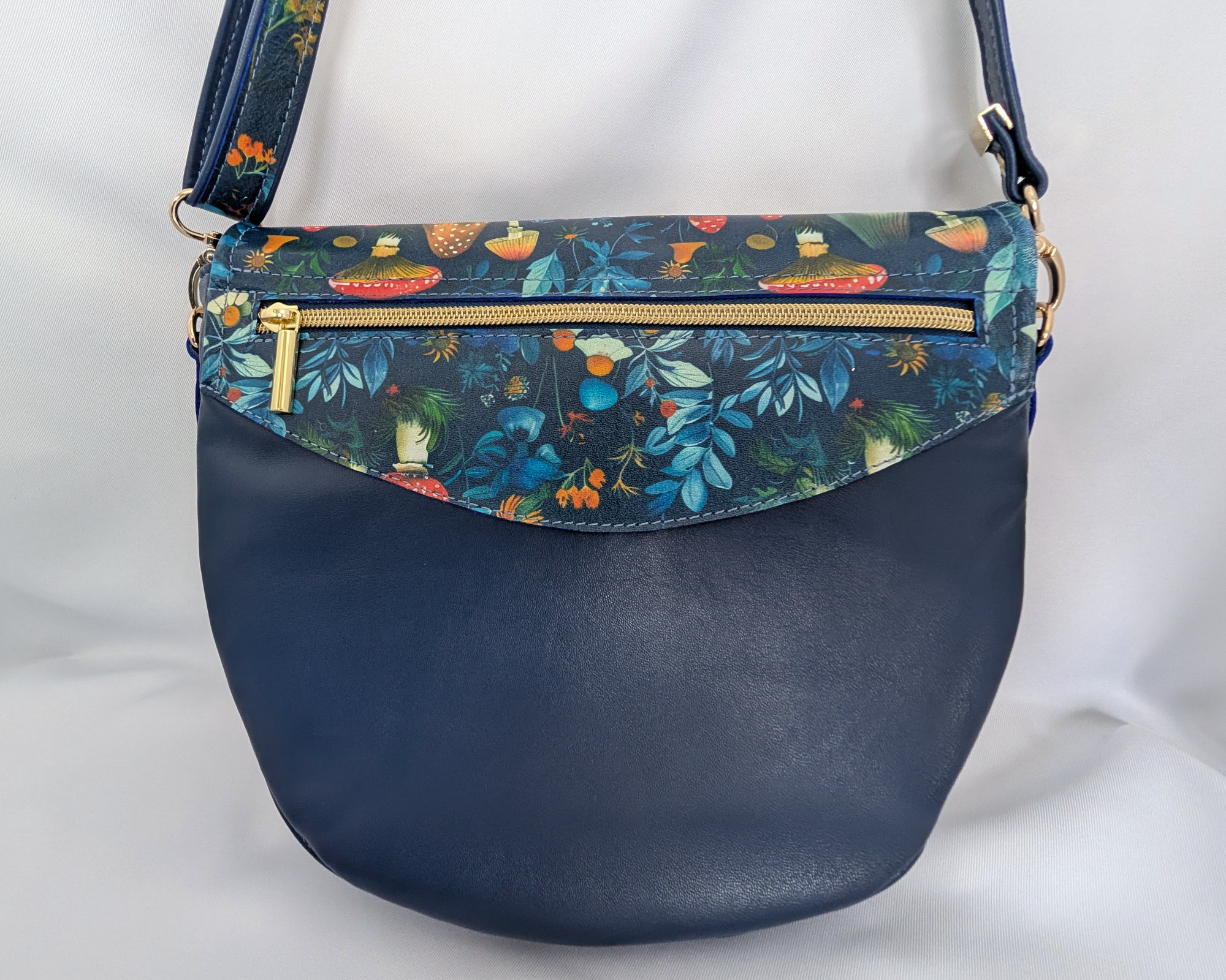 When I saw this mushroom print leather I just had to buy it to make a cute bag. This design is pleated on the bottom to add extra room without being bulky. The mushroom print flap closes with a thumb lock. It features gold hardware and is fully lined with durable waterproof canvas. It features a front slip pocket, a back zipper pocket, an inside zipper pocket and another slip pocket. The strap adjusts from 20" to 37". Wear it as a shoulder bag or a crossbody to have your hands free.