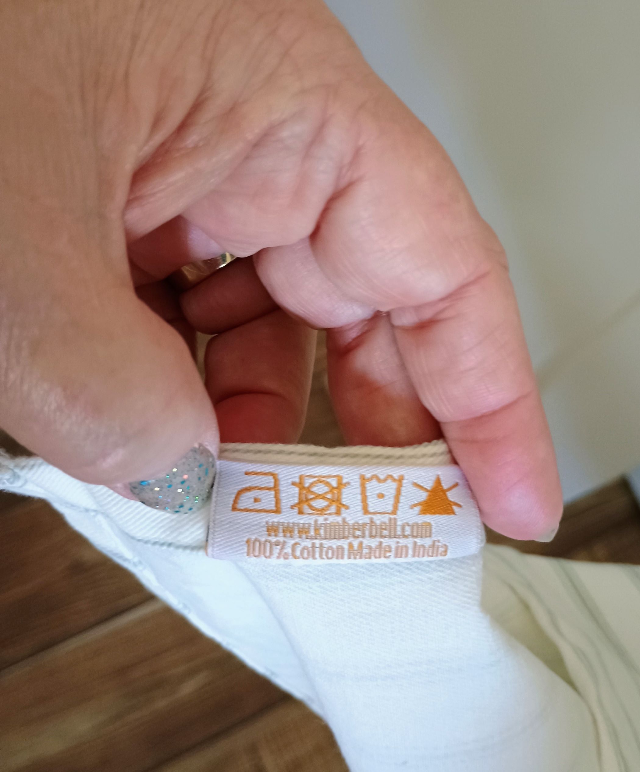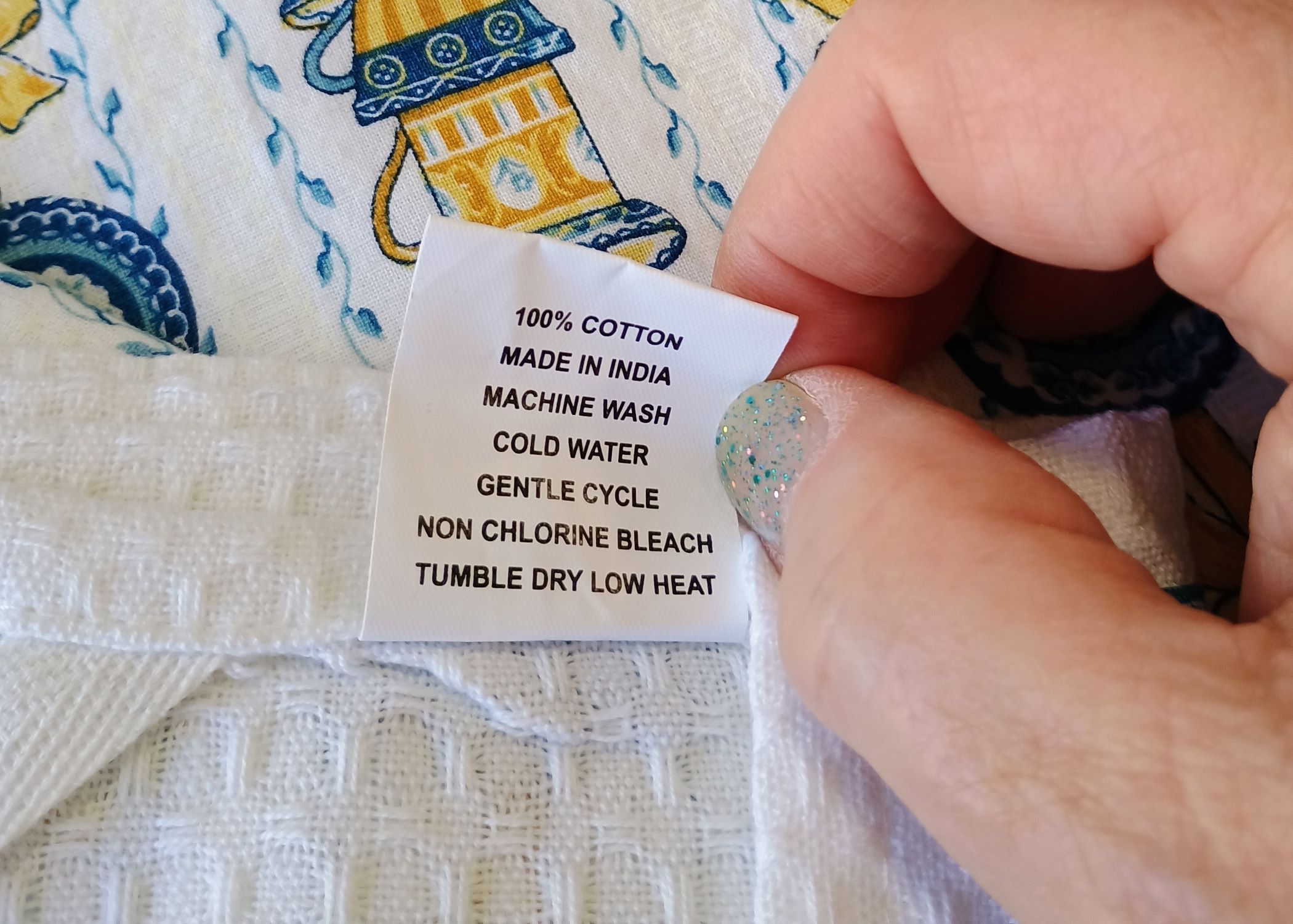 The apron is made from Cotton as shown on the tag. The pocket fabric is colorfast. The bib measures 13” across, while the apron is 30” wide at the waist ties. It is 39” long from the top of the bib to the bottom hemline. See pictures for clarification. I also have the coordinating cotton towel to make a great gift set!