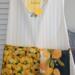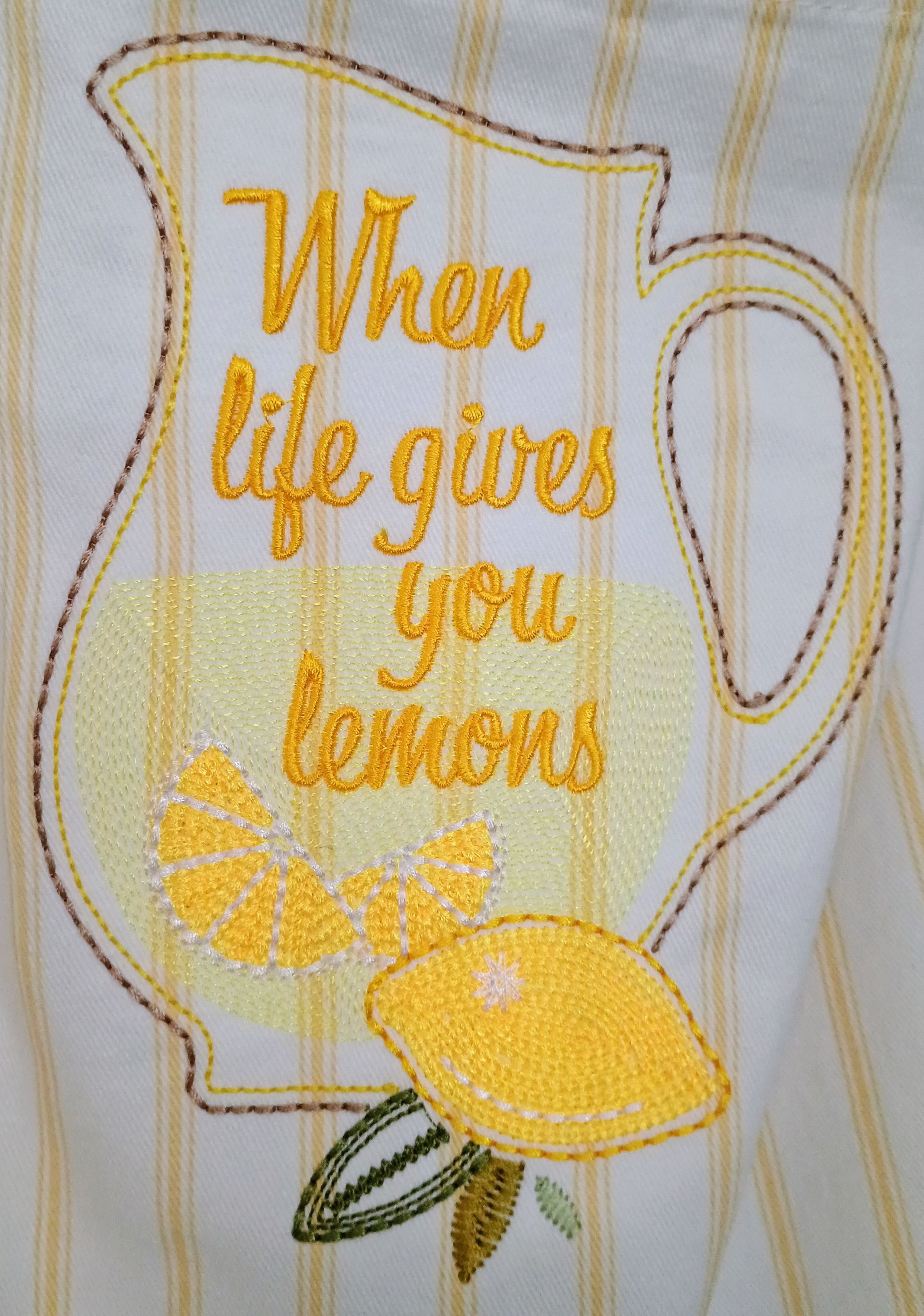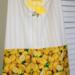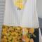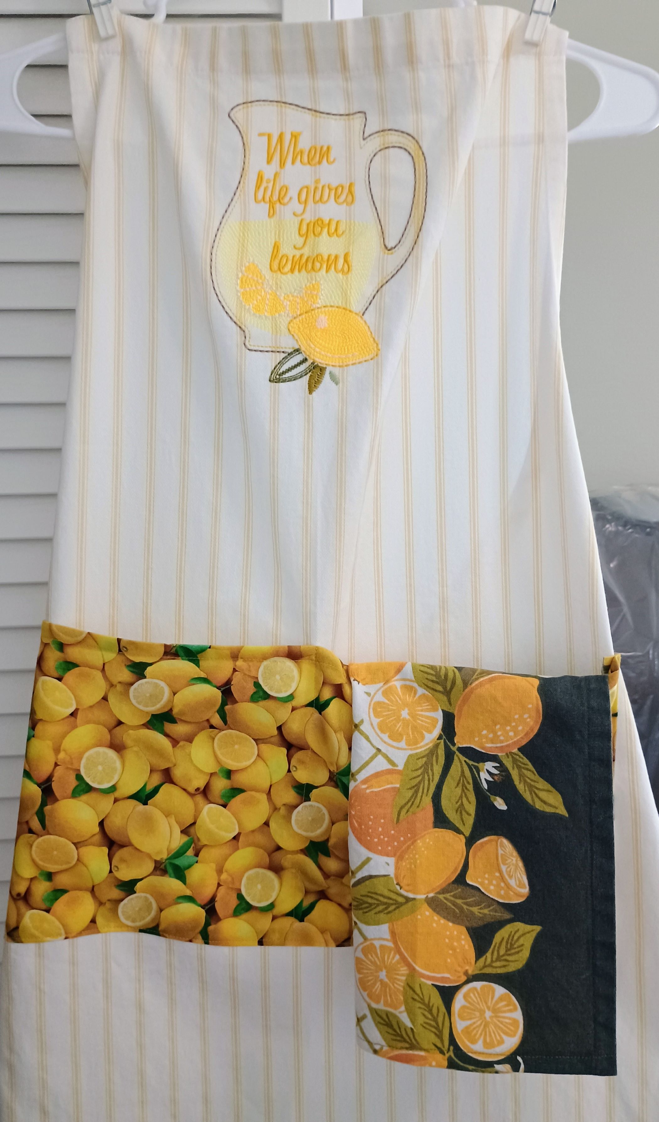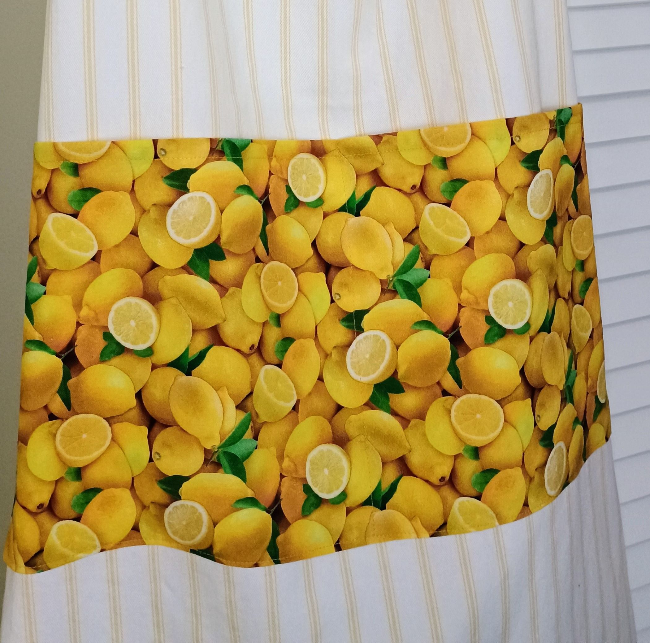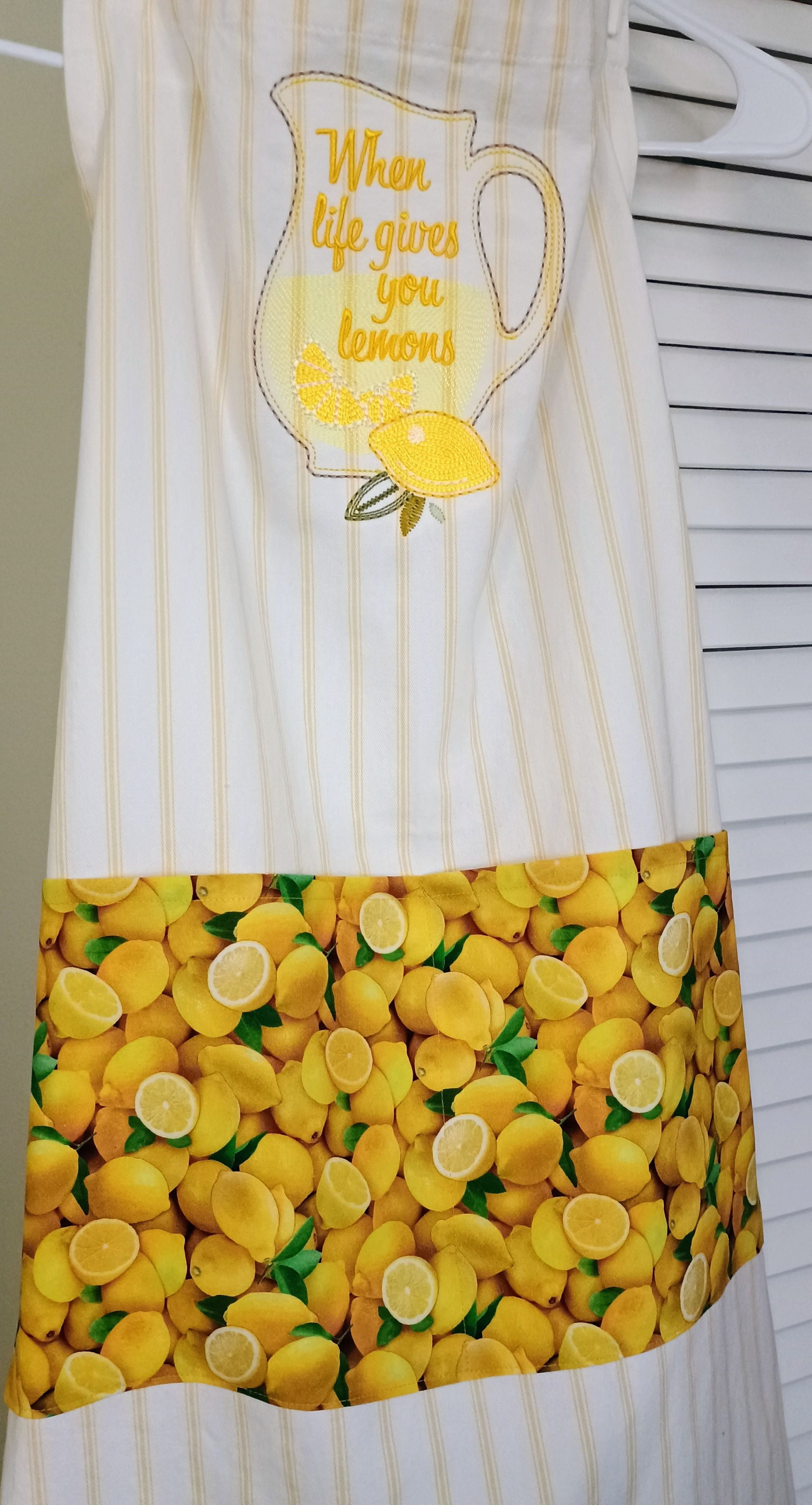 This is a full apron with adjustable neck band and waist ties. It has been embellished with embroidery that invokes feelings of spring and summer. Being 100% cotton, it is safe for machine washing and drying. It has been enhanced with a pocket (approximately 15" wide, 8" deep) along the hip line. The pocket is sewn down the middle, allowing for storage of different items. The pocket fabric is a great accent to this apron, and brings out the yellow stripe in the apron.
