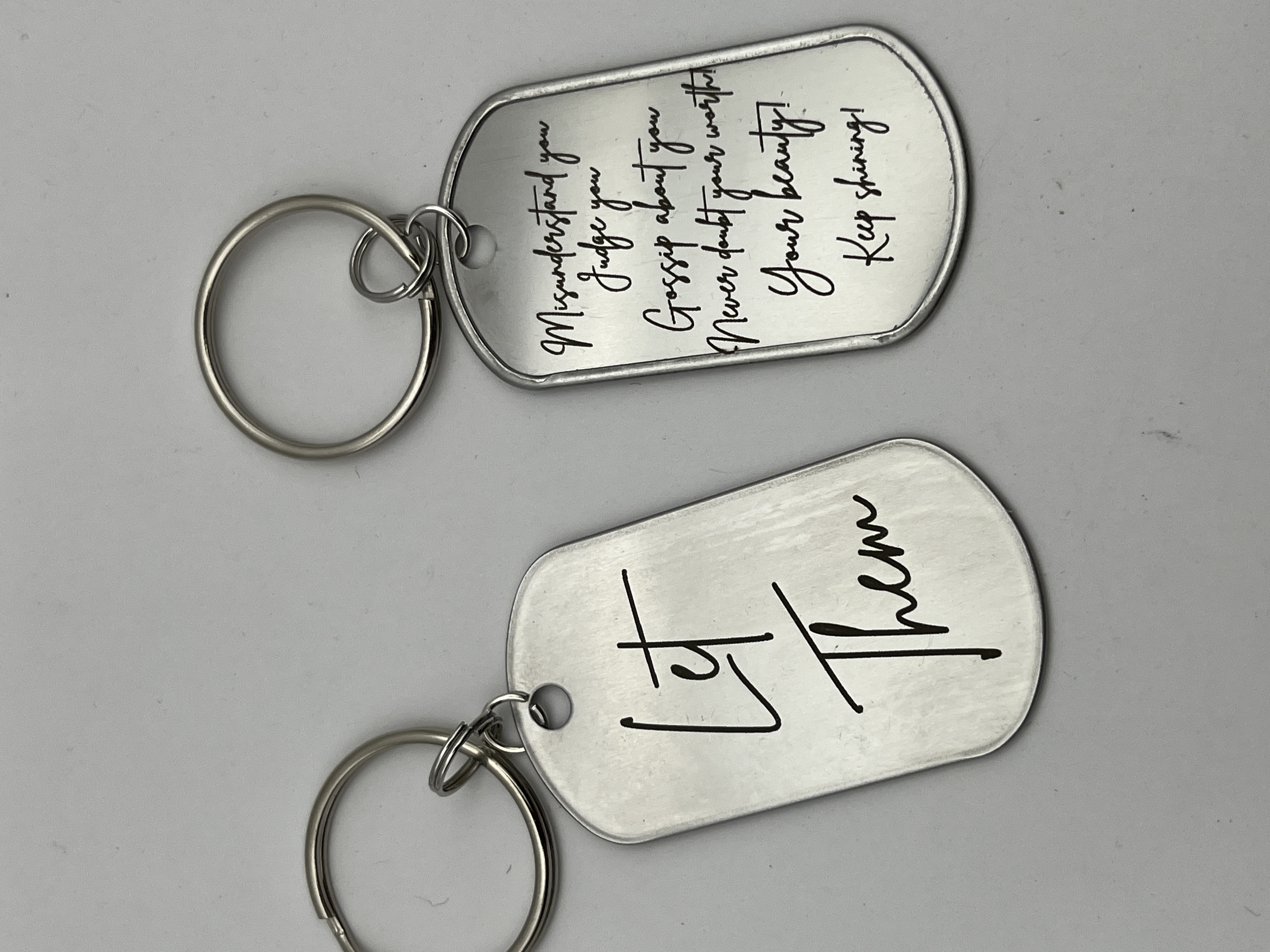 Remind yourself to "Let Them". This key chain is engraved on a stainless steel dog tag with the words "Let Them" on the front and the saying "Misunderstand you, Judge you, Gossip about you, Never doubt your worth! Your beauty! Keep shining!" on the back. This is a great reminder for anyone to let others have their opinions about you, but always be yourself!