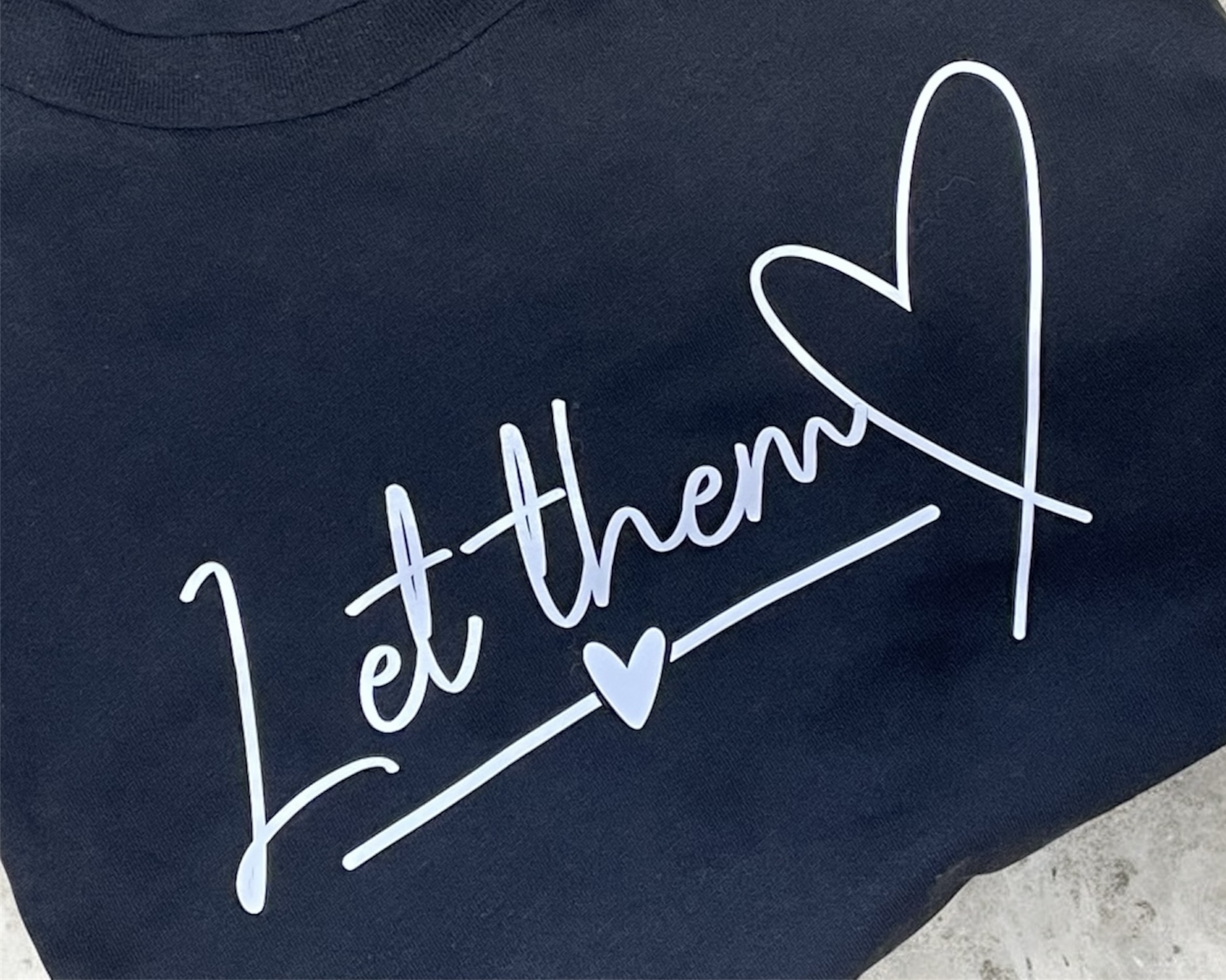 You have a simple “Let Them” phrase in the front and a full phrase on the back. This sample has been created using a Bella Canvas tee, if you prefer to use a different brand, please reach out to us before placing your order. We do carry Gildan as well, so we are happy to work with you.