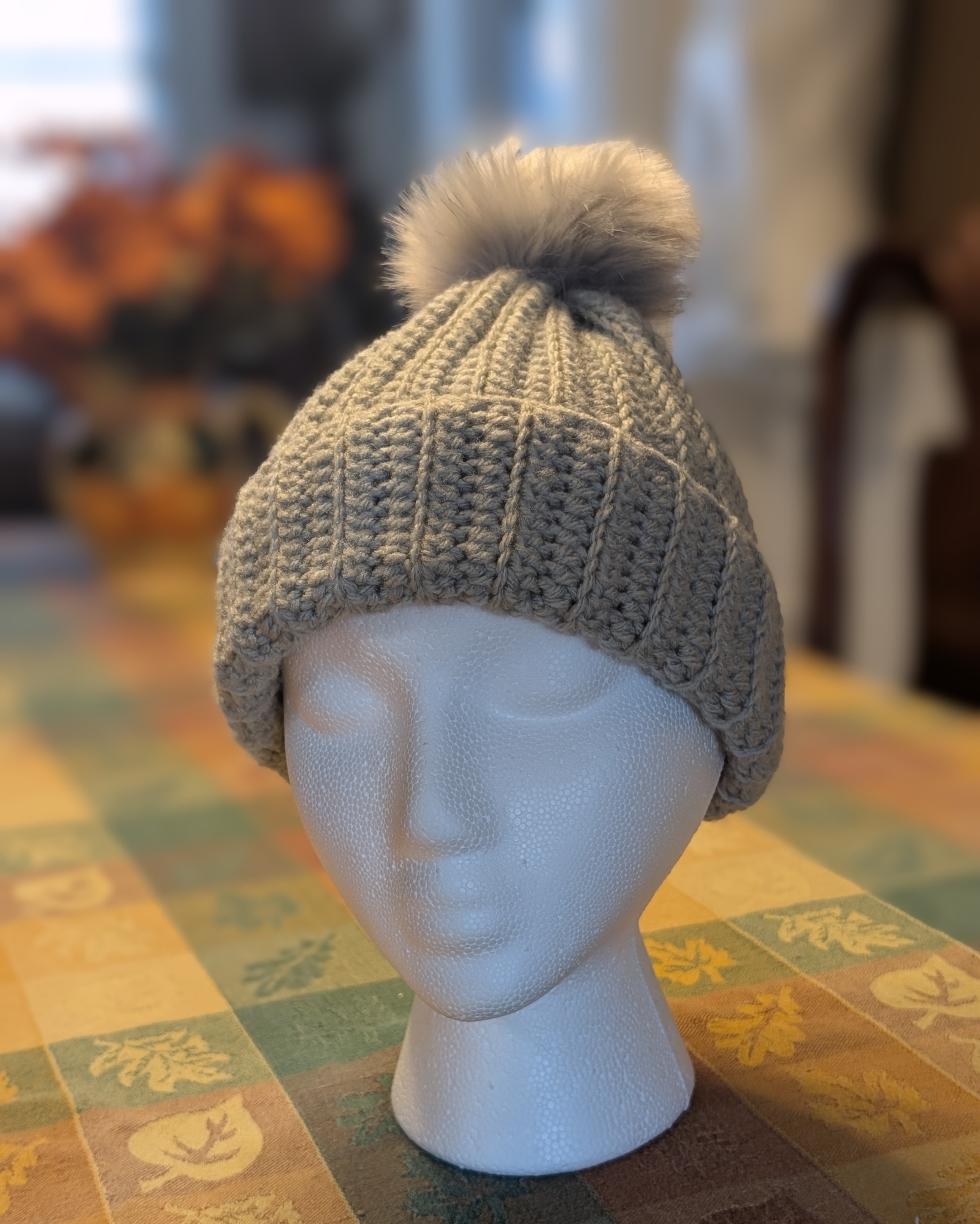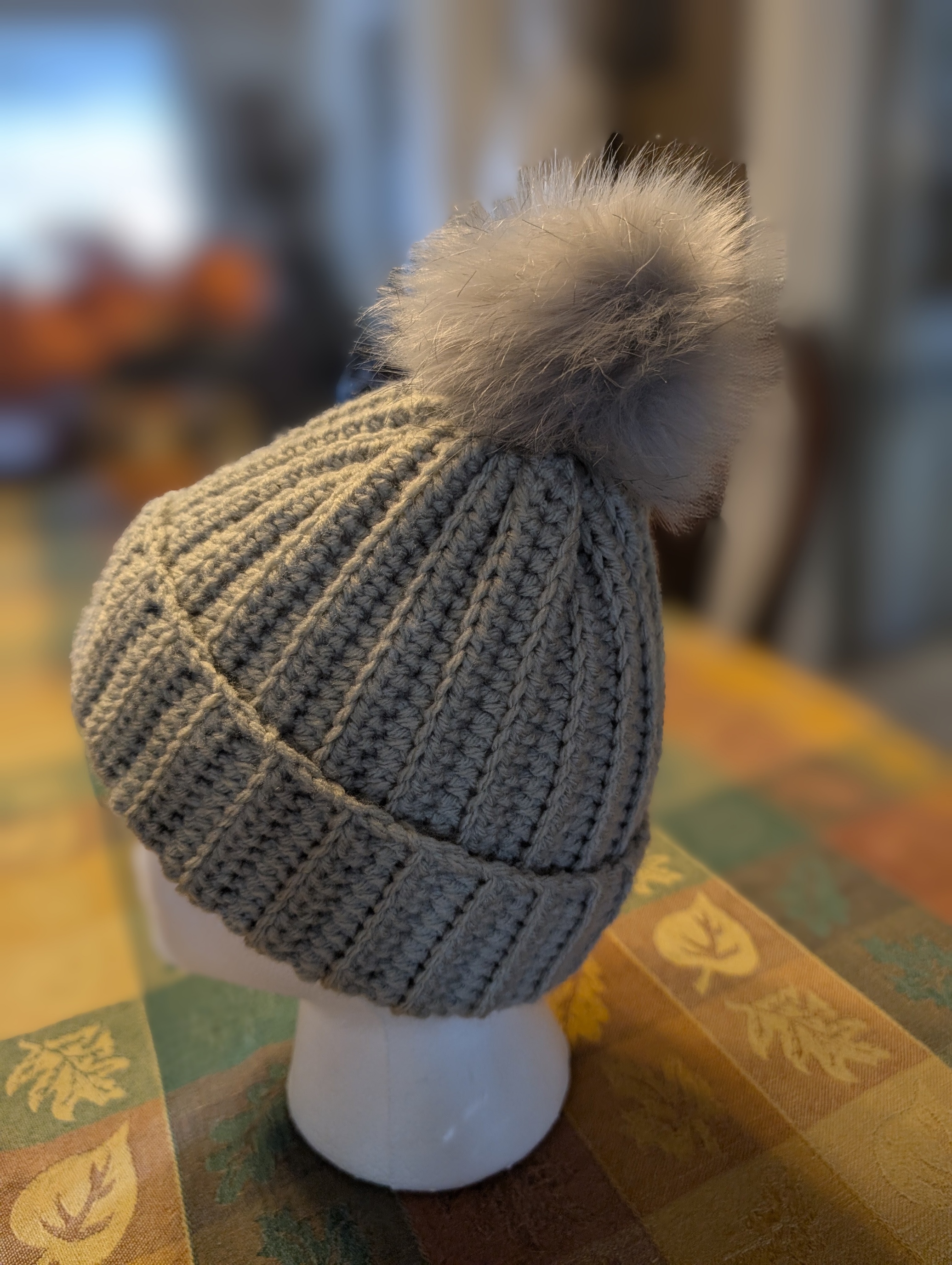 Light gray crocheted stocking cap with gray fuzzy pom pom. Experience the perfect blend of style and comfort. This hand crocheted stocking cap is more than just an accessory-its a statement of winter warmth and artisan craftsmanship. It promises to keep you snug even on the chilliest days. Made in a smoke-free home. Custom orders welcome.