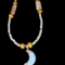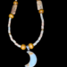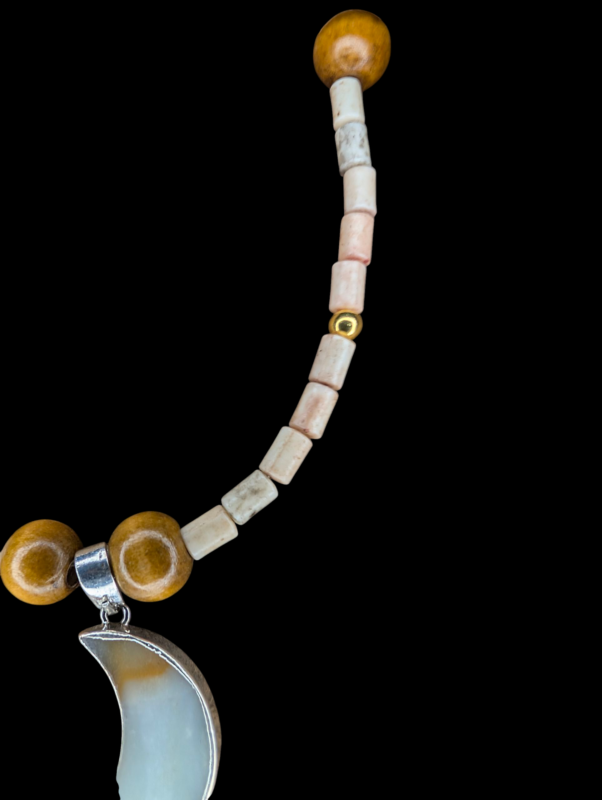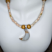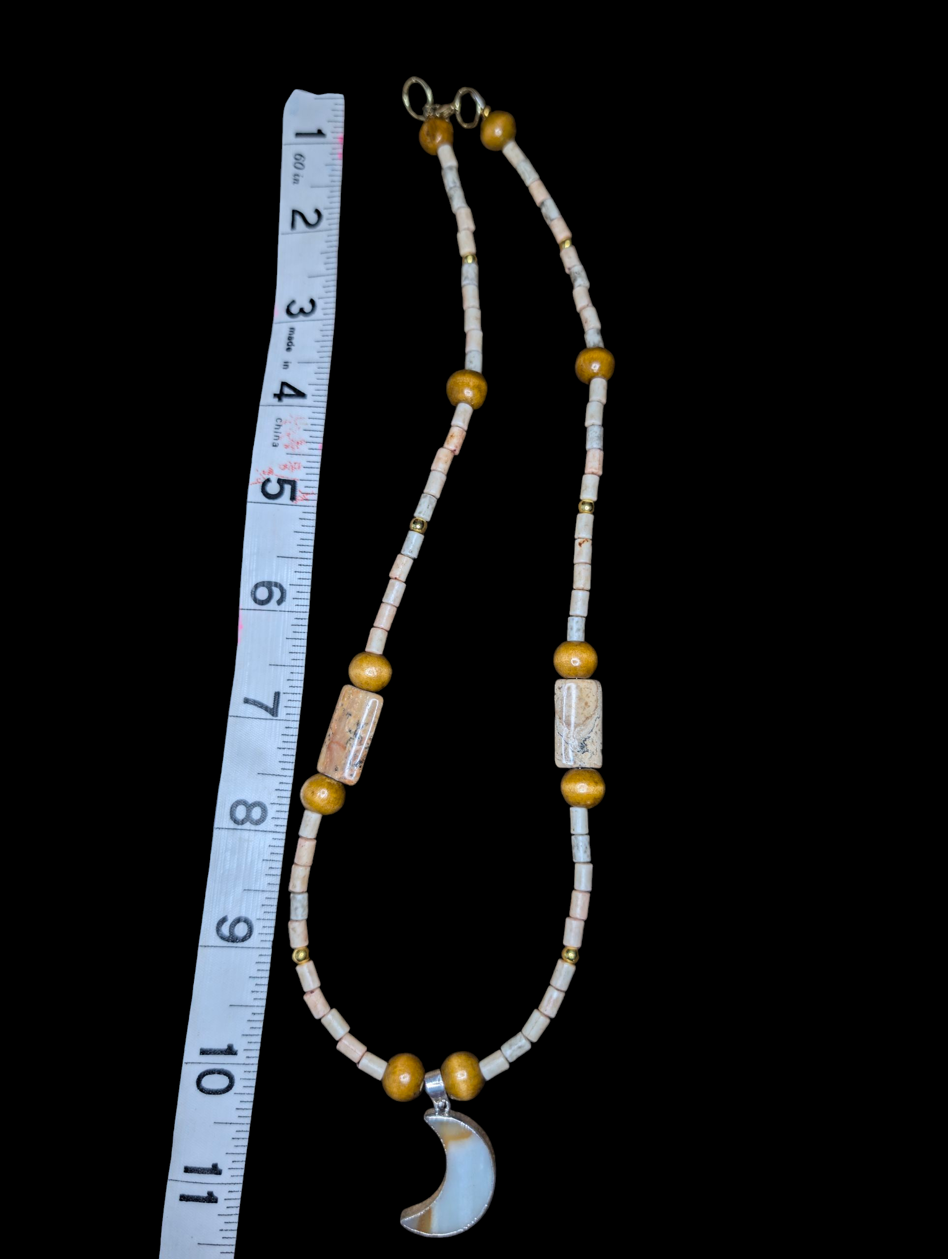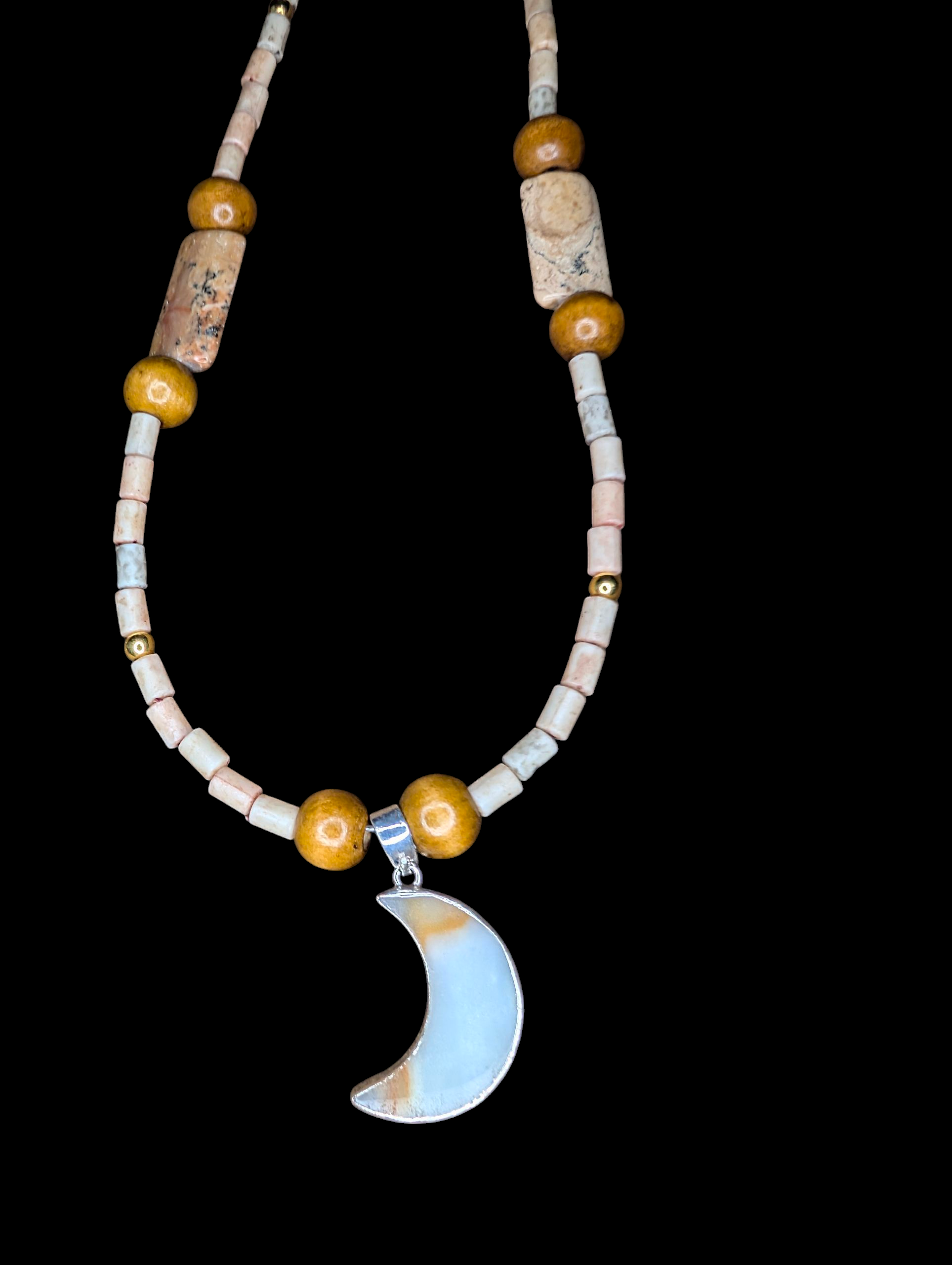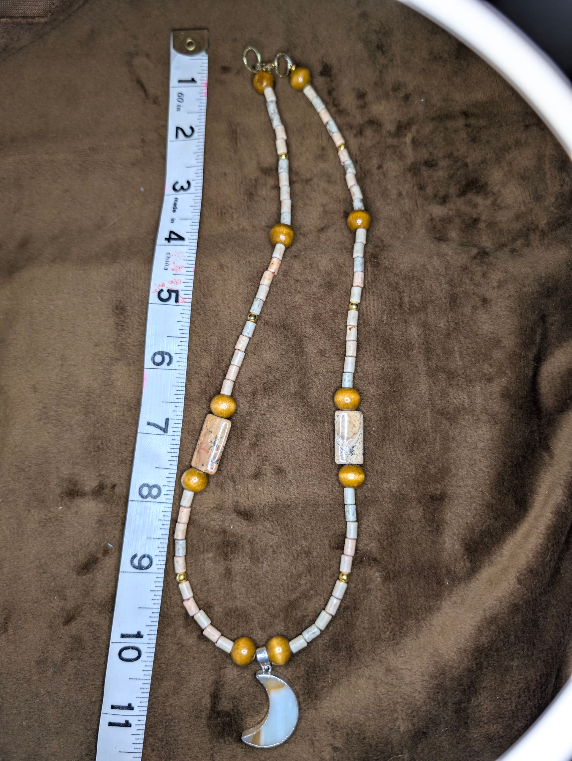 Crescent stone moon charm strung onto beading wire and surrounded with stone looking beads to match. The variety of shapes of these beads allows this piece to get the attention of everyone. Boho inspired.