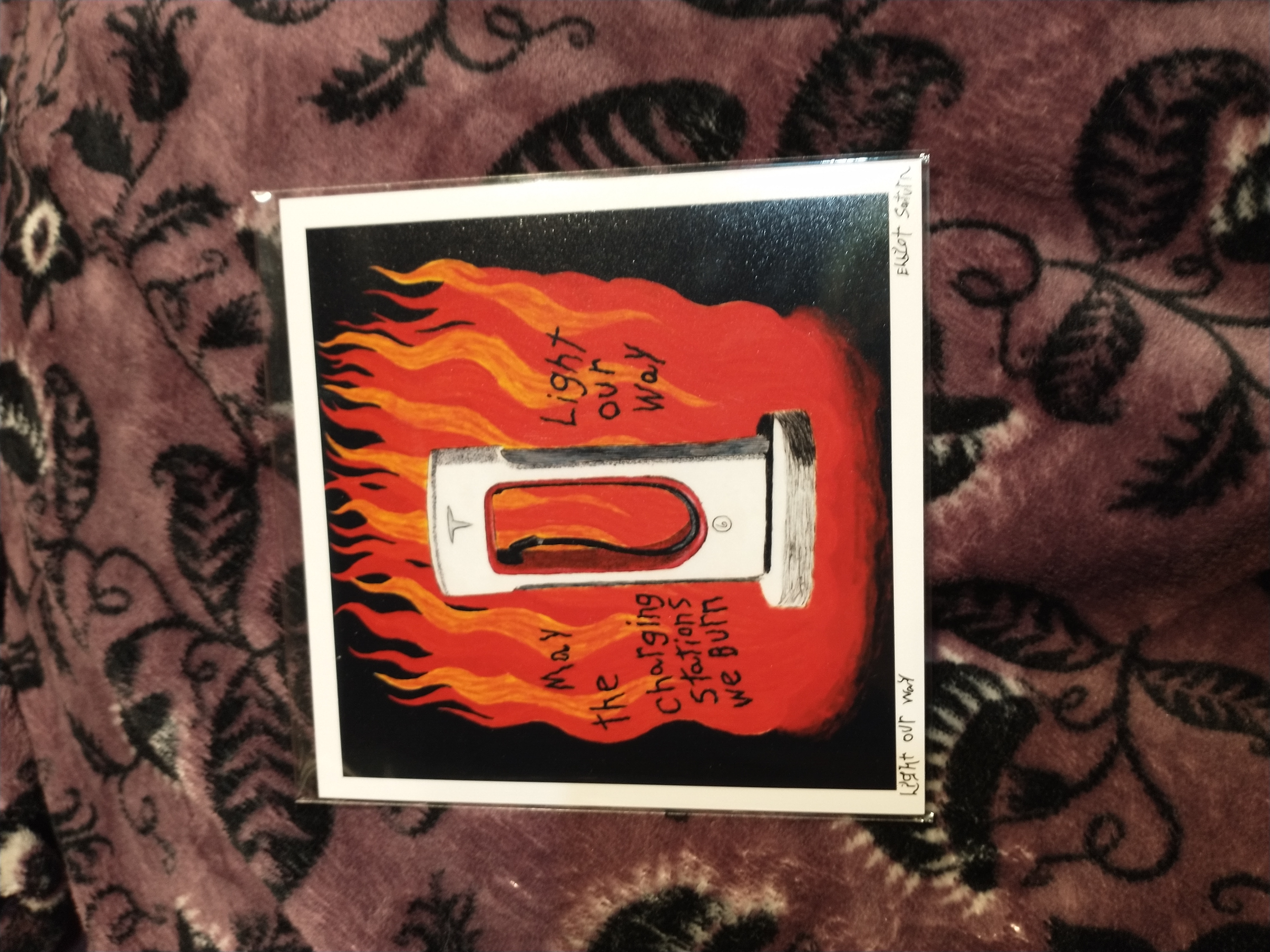 a 5 inch by 5 inch photo paper print of a watercolor painting of a Tesla charging station burning with the text "may the charging stations we burn light our way"