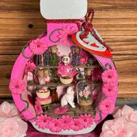 8 little roses inside a plastic cauldron, each one has a a ribbon and bow and a glow in the dark skull.