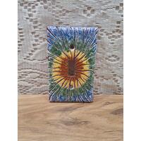 This copper enameled blue spider web light switch cover is made using vitreous powdered glass enamel. This is a standard size single toggle switch plate. The plate measures 4 1/2 x 2 3/4 inches. Clean with a damp cloth, do not use any abrasive cleaners.