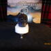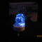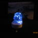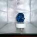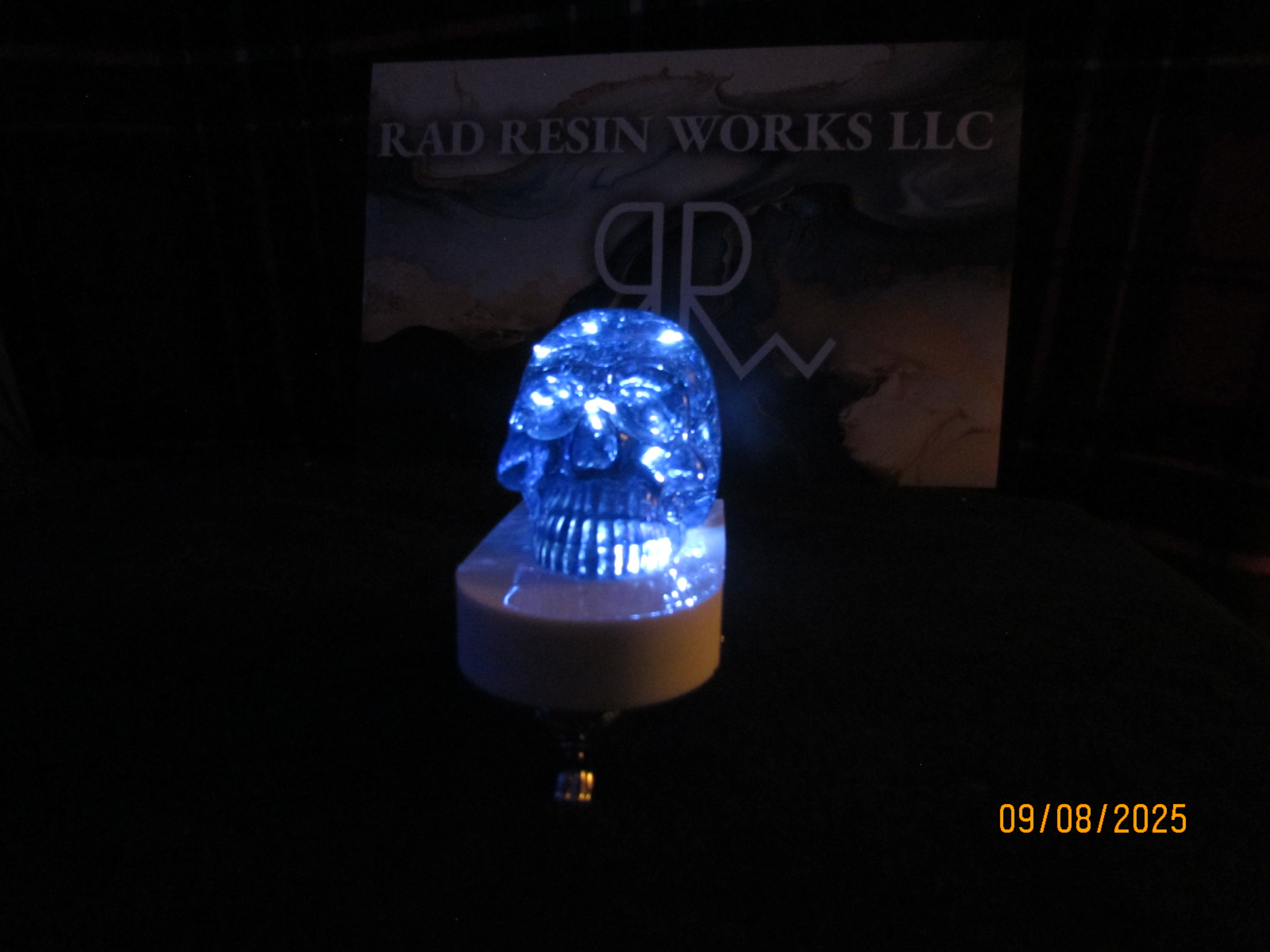 resin is colored blue. there are white lights inside the skull. battery operated. has a white tombstone base.