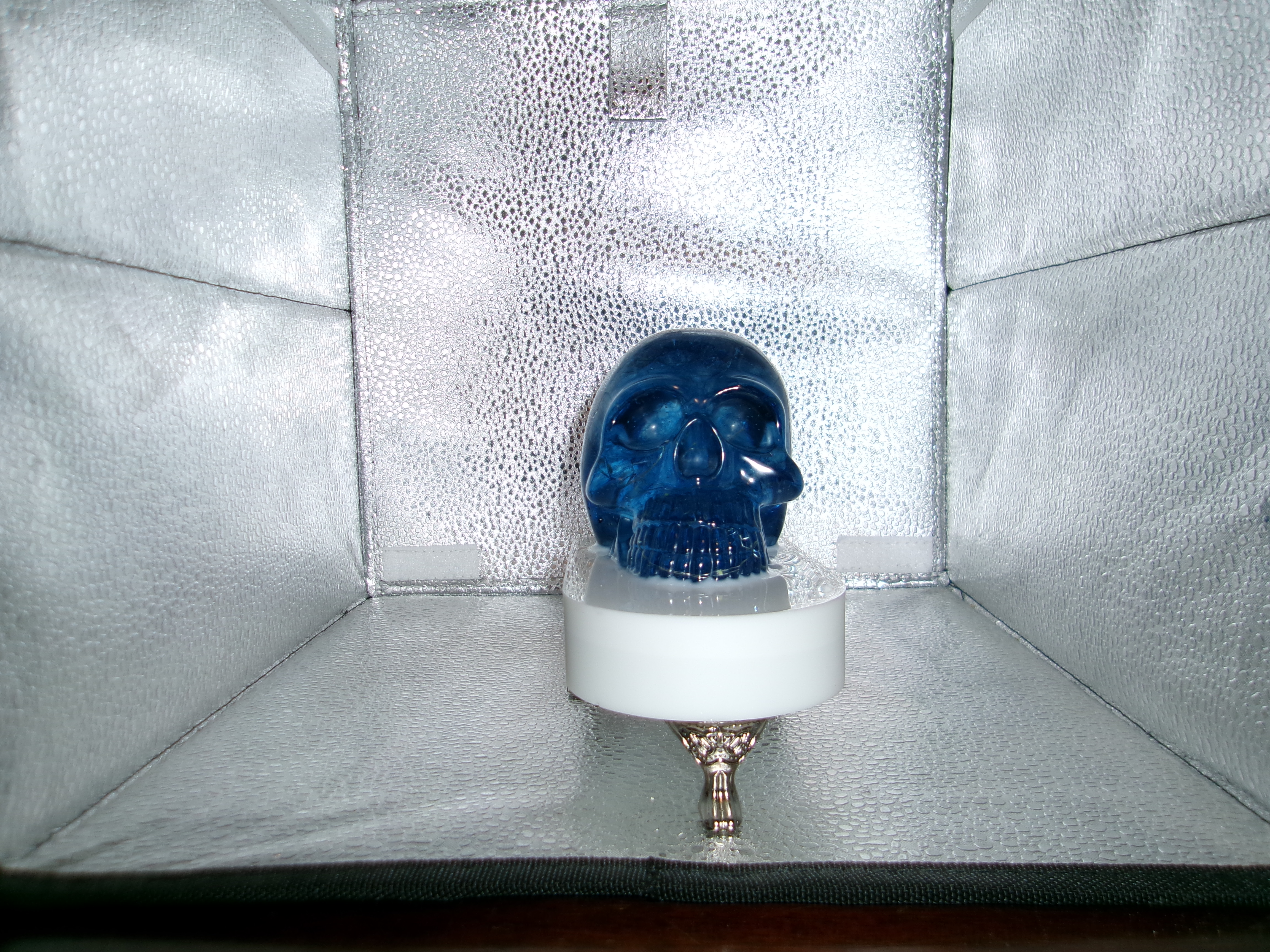 acrylic diamond crystals inside, with battery powered white lights inside the skull.