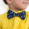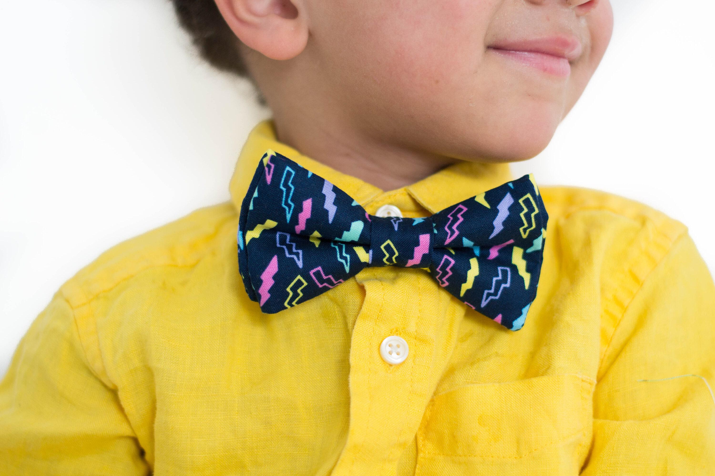An electrically colorful lightning bow tie! This design is unique and fun, with yellow, purple, mint, pink and blue bolts on a dark navy blue background. Great for your bow tie loving kids and pets, too!