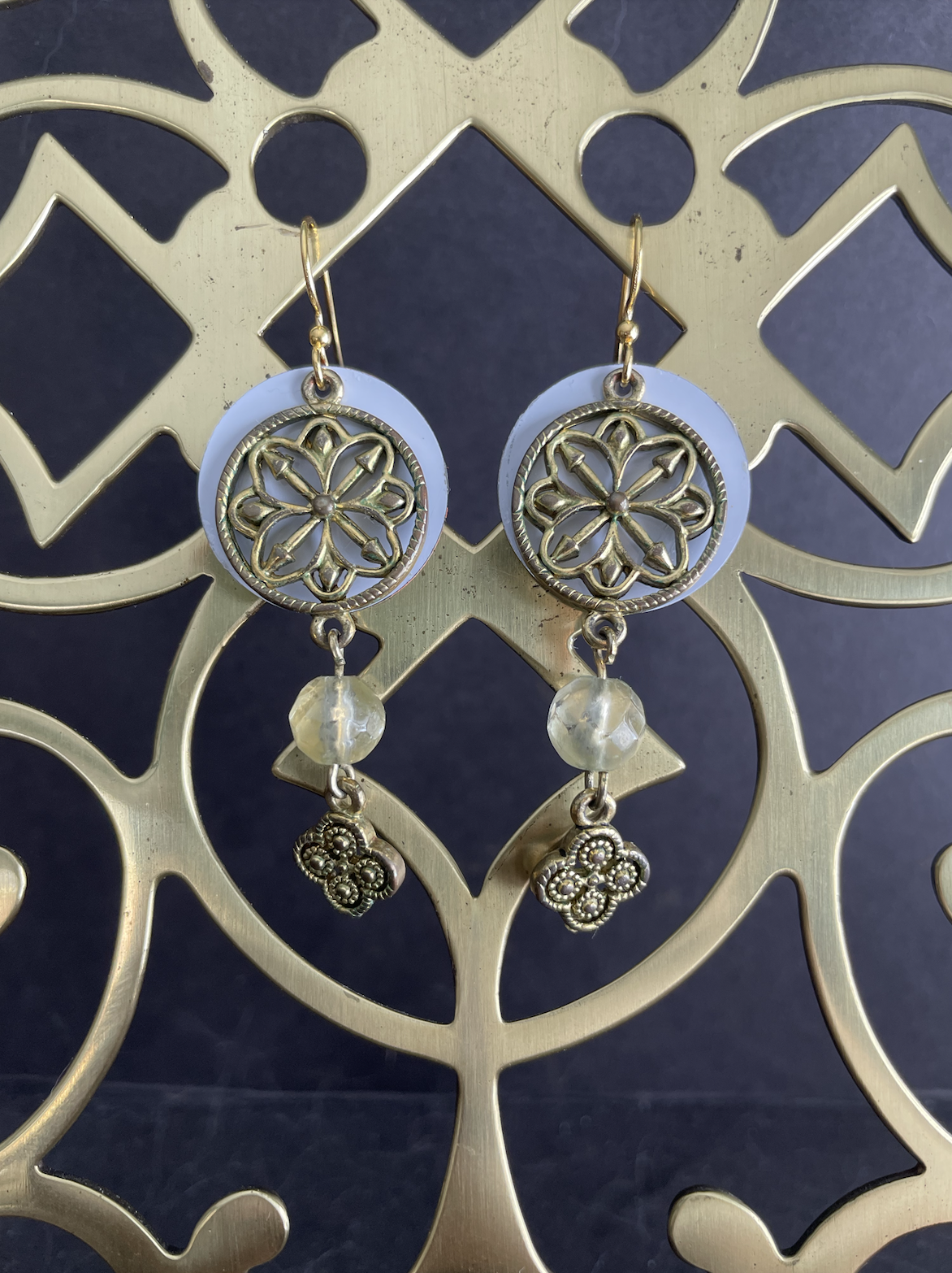 Tins are very light making them ideal for earrings as they don't weigh down your ears as the day goes on. Did you know the proper term for working with tin is "tinkering"? That made me really happy. I literally tinker in my art studio! I use old cookie tins, tea tins, and the like, break them down, and hand cut them into shapes and hand-hammer them into the 3-D shape I want them to be, finish and polish them, before putting them together like any other jewelry.