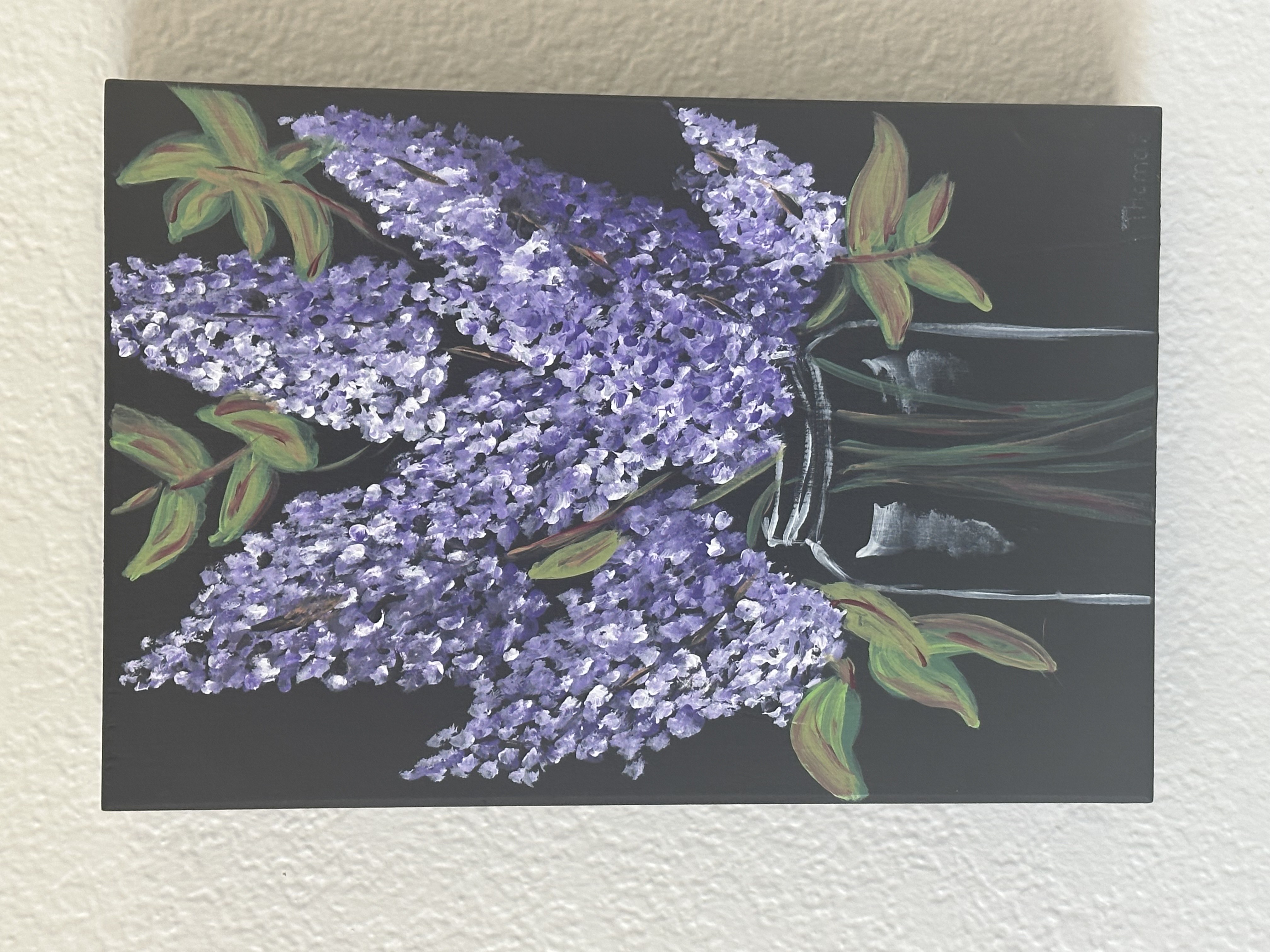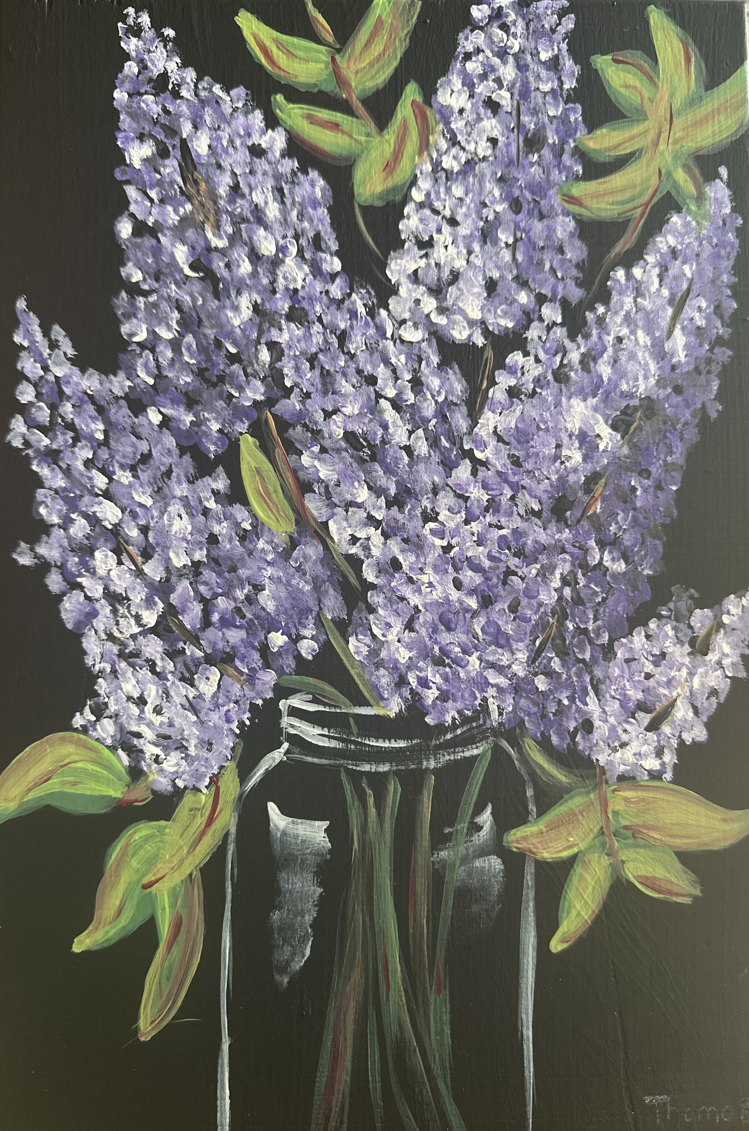 Beautiful purple and white lilac nestled in a mason jar for the whole house to smell like spring. Lilac always remind me of spring in the Upper Peninsula of Michigan. They don't last long in nature, but this painting will remind you of the fresh smell of lilacs all year long.
