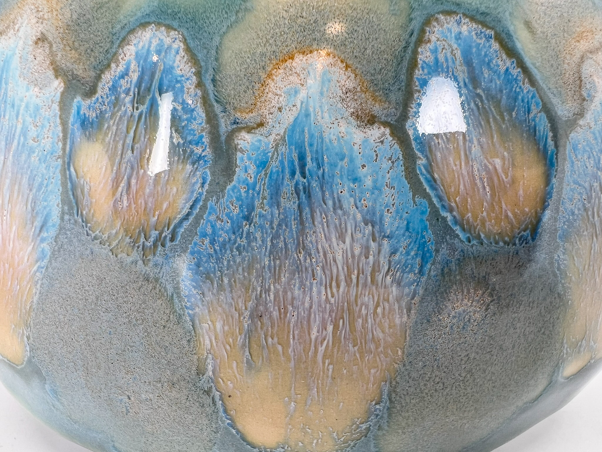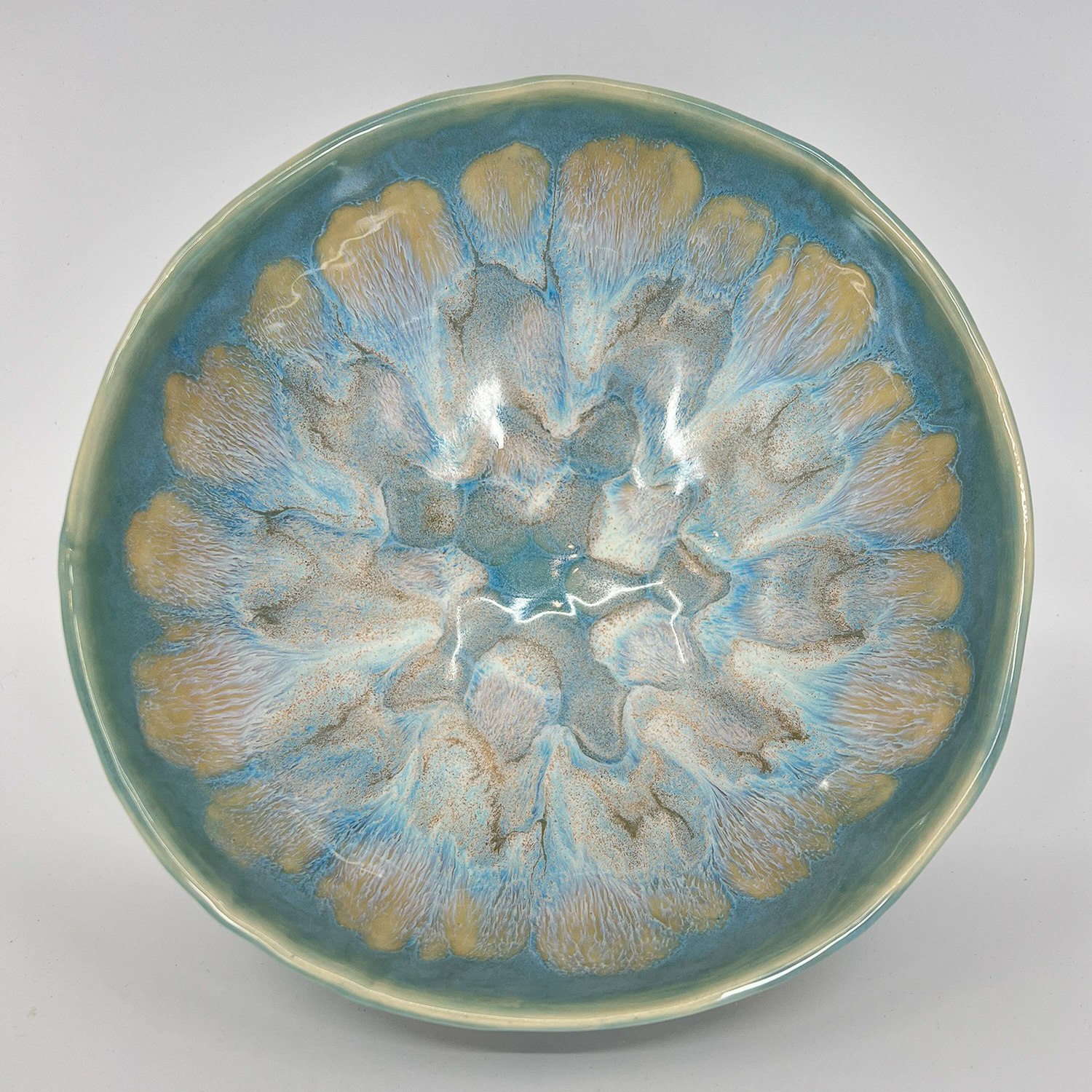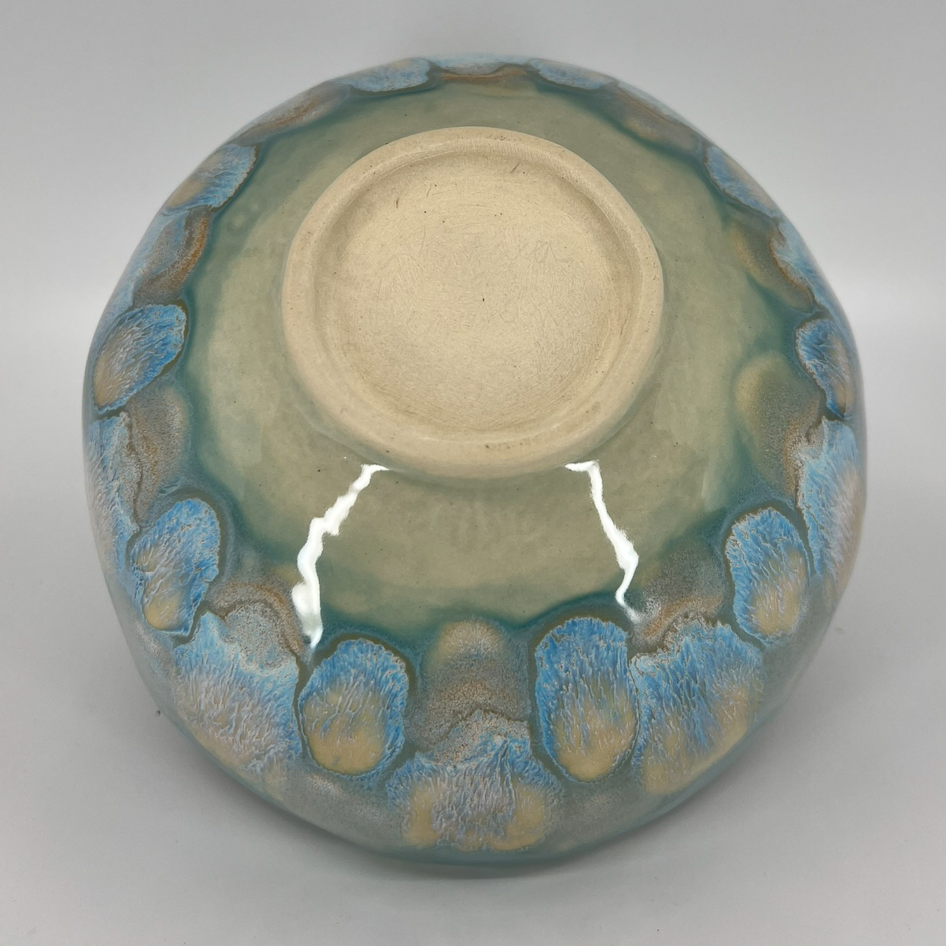 Soft layers of pastel blue and green glaze melt across this hand-built bowl, creating an interior that appears quietly floral with petals suggested in color and movement rather than form. Subtle hints of yellow, pink, and brown emerge where the reactive glaze meets the surface, giving depth and warmth to the pastel base. The bowl’s organic shape is a reminder of the handmade nature of the work and the touch of the maker’s hand, while the layered glazes create a natural harmony of tone and texture. Functional yet decorative, this bowl offers calm color to your decor. Beautiful for serving, or simply to display.