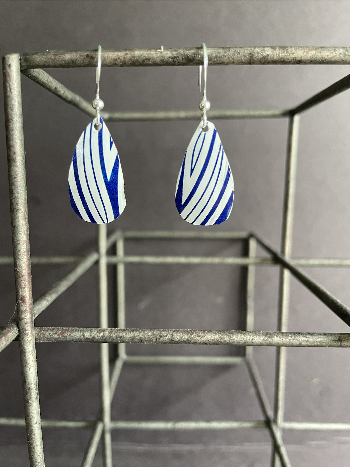 Tins are very light making them ideal for earrings as they don't weigh down your ears as the day goes on. Did you know the proper term for working with tin is "tinkering"? That made me really happy. I literally tinker in my art studio! I use old cookie tins, tea tins, and the like, break them down, and hand cut them into shapes and hand-hammer them into the 3-D shape I want them to be, finish and polish them, before putting them together like any other jewelry.