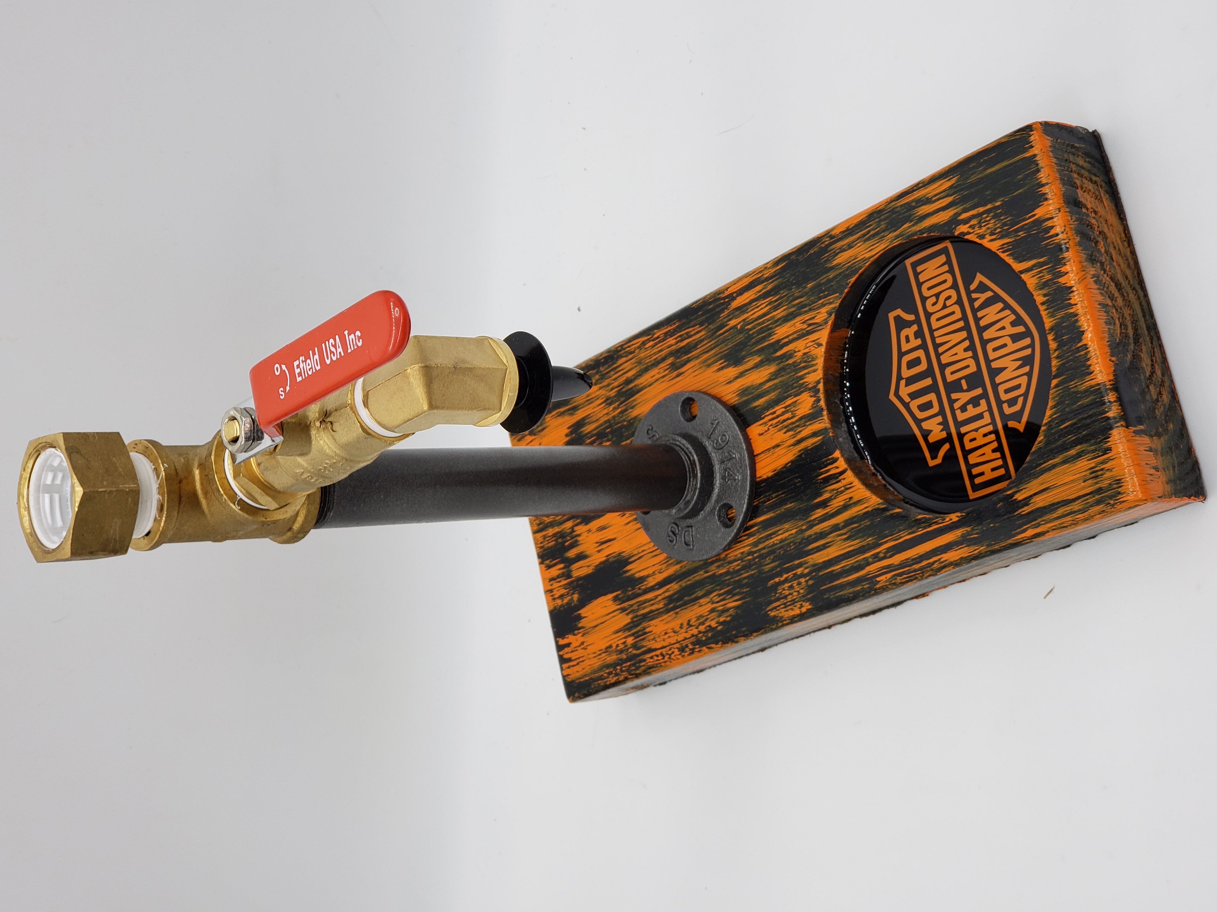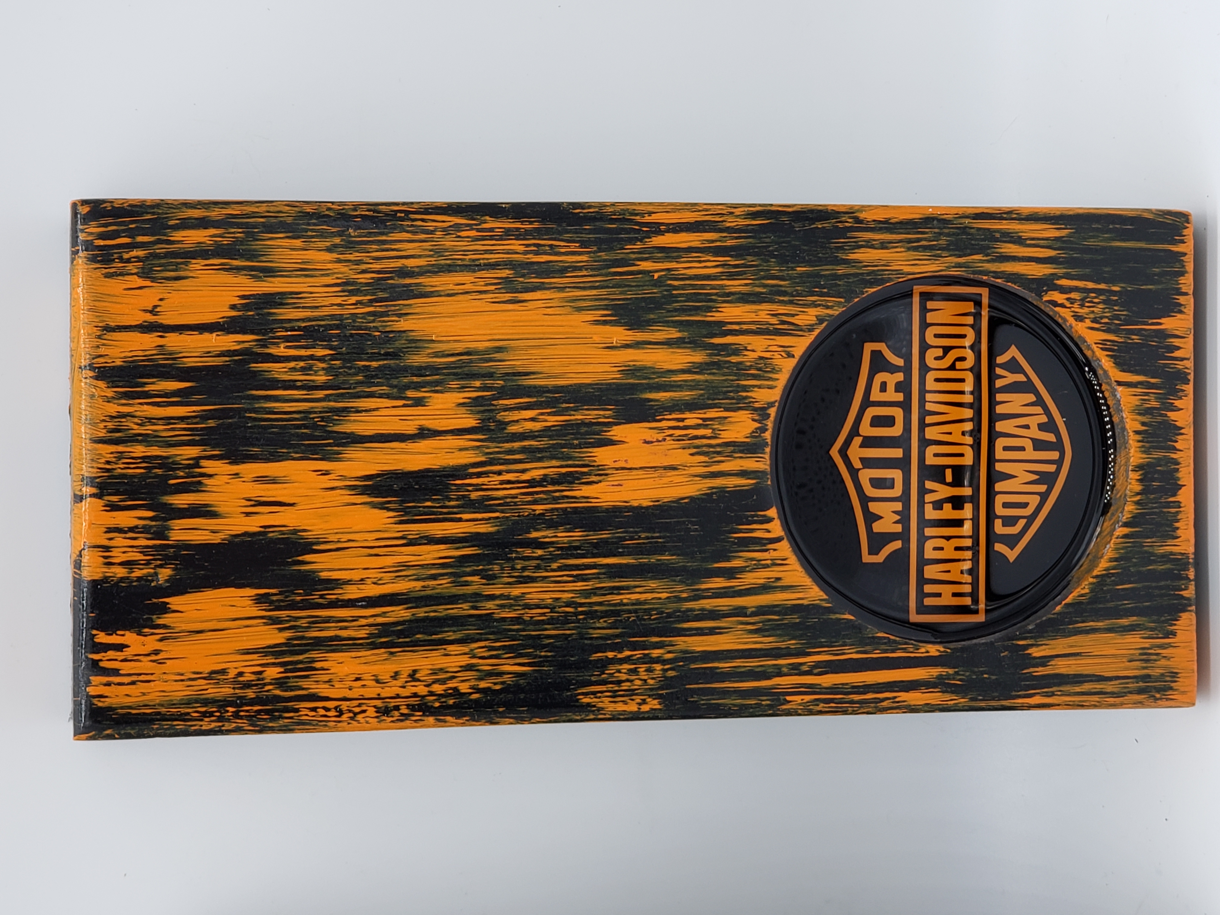 Hand painted wood and metal drink dispensers with Harley Davidsonin resin cup holder. They can hold most liquor bottles with a screw on cap. We can also make coasters to match.
