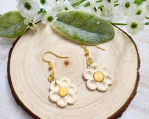 Petite Daisy Dangle Earrings - Cream & Gold Floral Clay Jewel...