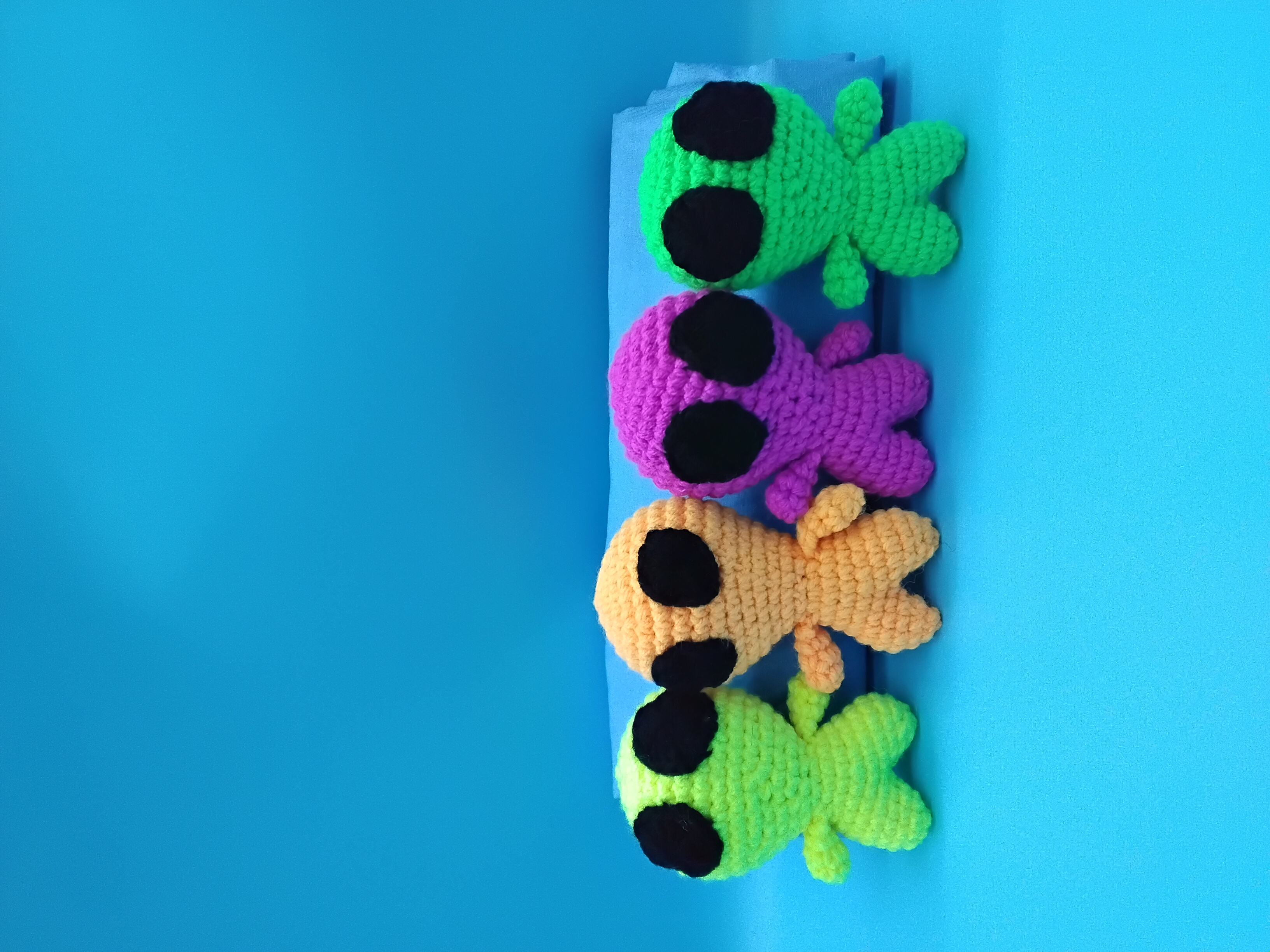 These quirky extraterrestrials have landed—and they’re here to bring color, curiosity, and a whole lot of handmade charm. Each alien is crocheted with neon acrylic yarn , giving them a vibrant personality that pops against any backdrop. Their oversized black eyes and big rounded heads make them irresistibly cute and just a little mysterious.