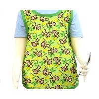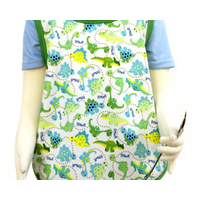Easy on and off - slips over the child's head and snaps under the arms to fully cover both the front and back of the child.