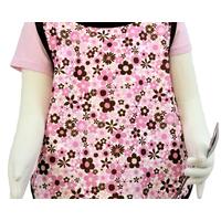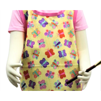 Bibs and play smocks are made from water resistant polyurethane laminated fabric (PUL) by Babyville. The edges are trimmed with a color-coordinated fold-over-elastic (FOE). Plastic snaps are added under the arms to secure it on the child. Shoulder seams are double stitched for durability and clean edges (see pictures below).