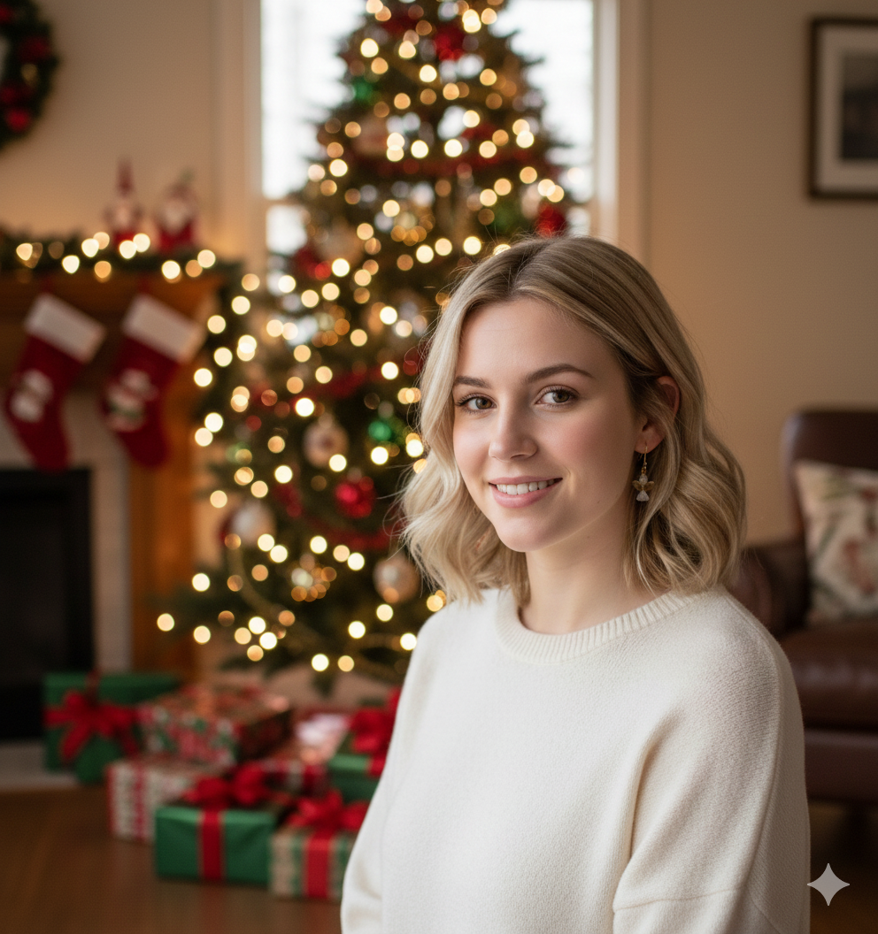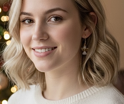 These Little Christmas angel earrings are made from a white Czech flower glass bead for the gown, a Czech glass Angel wing bead for the wings, a 5mm moonstone bead for the head, and a 4mm gold sparkly spacer for the halo.