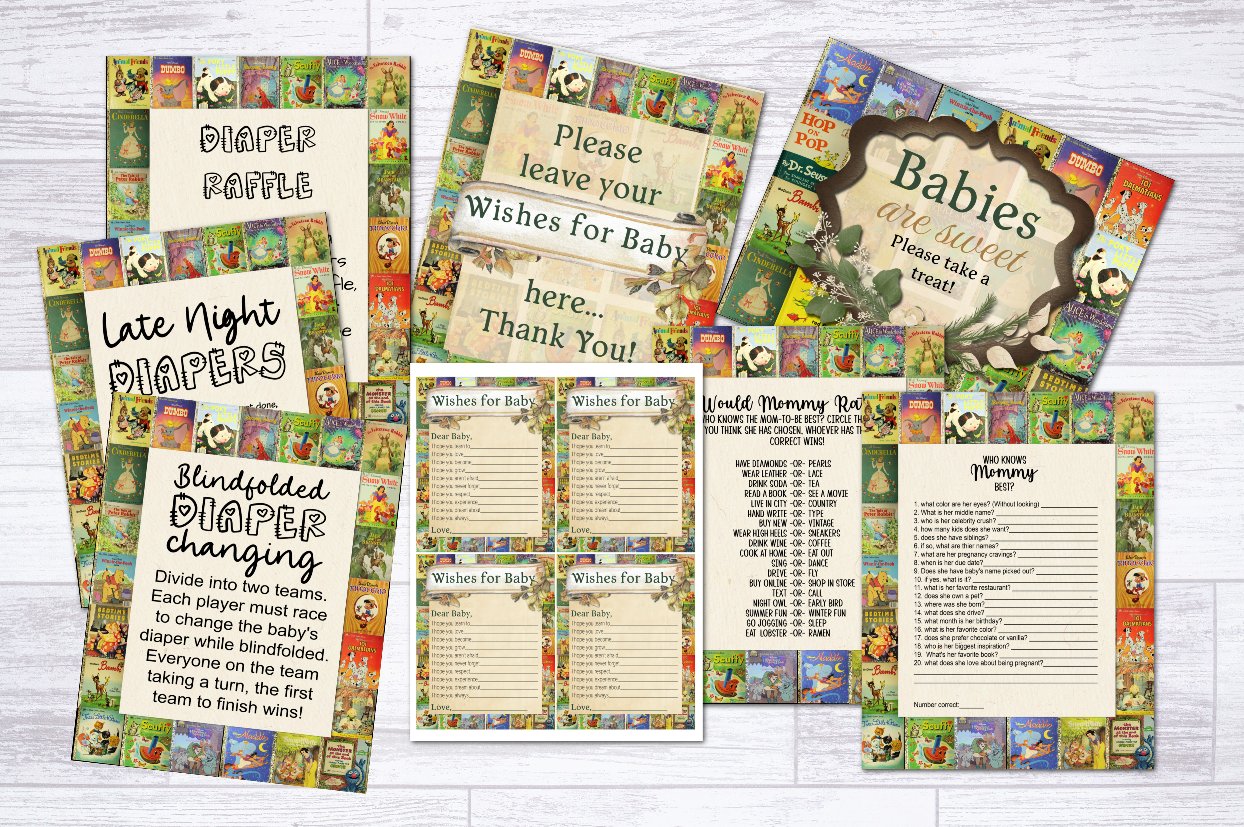 This set includes games and signs for your "Little Golden Book" baby shower! I photographed each book myself so expect flaws from the real vintage books that adds to the charm. *PLEASE NOTE* This is a digital download product, and no physical item will be shipped to you. Simply purchase, download and print. You can print at home or at a print shop. Images are 300dpi. For best results print on 8.5x11 semi-gloss cardstock.
