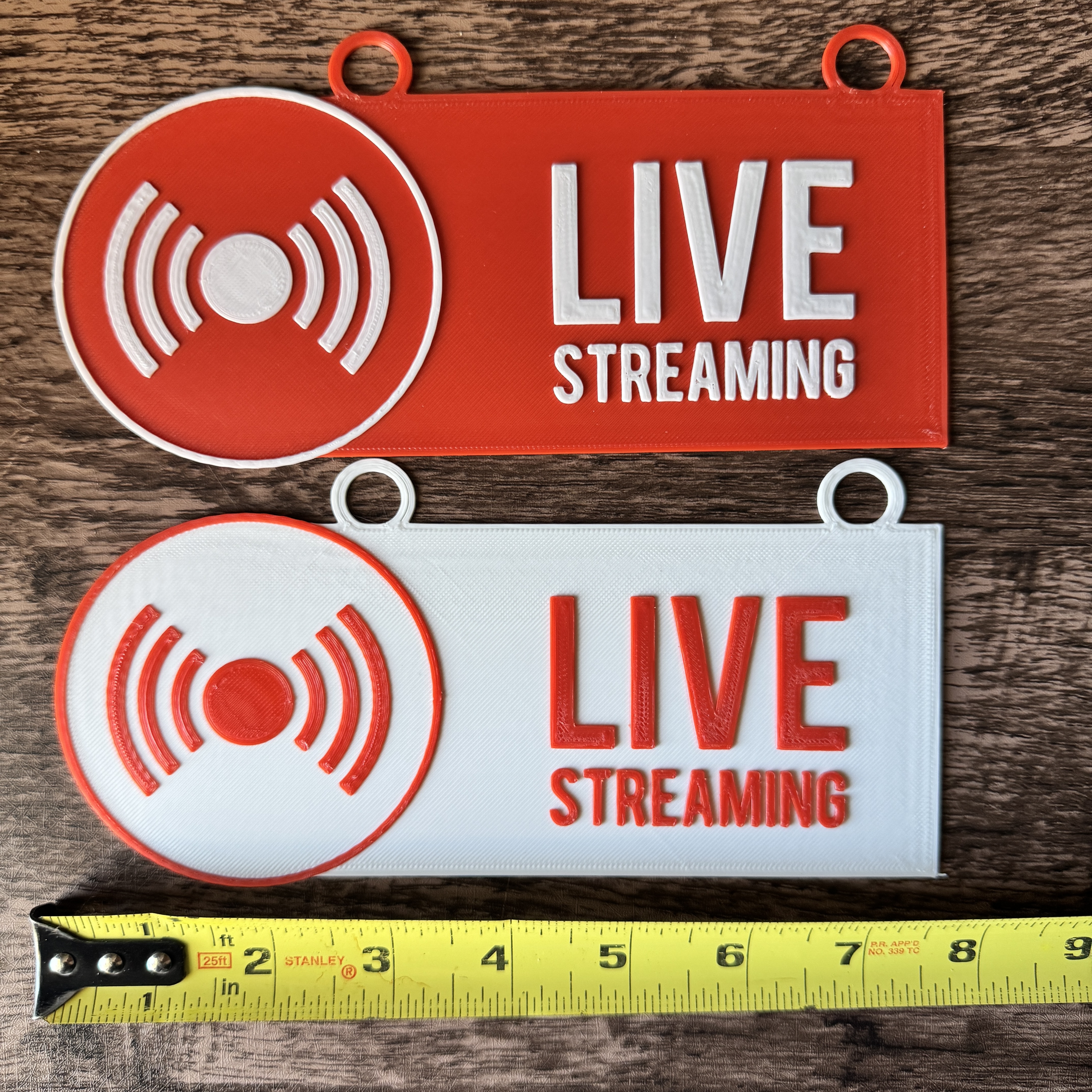 Two-color Live Streaming fence hanger is is ~8"x4"