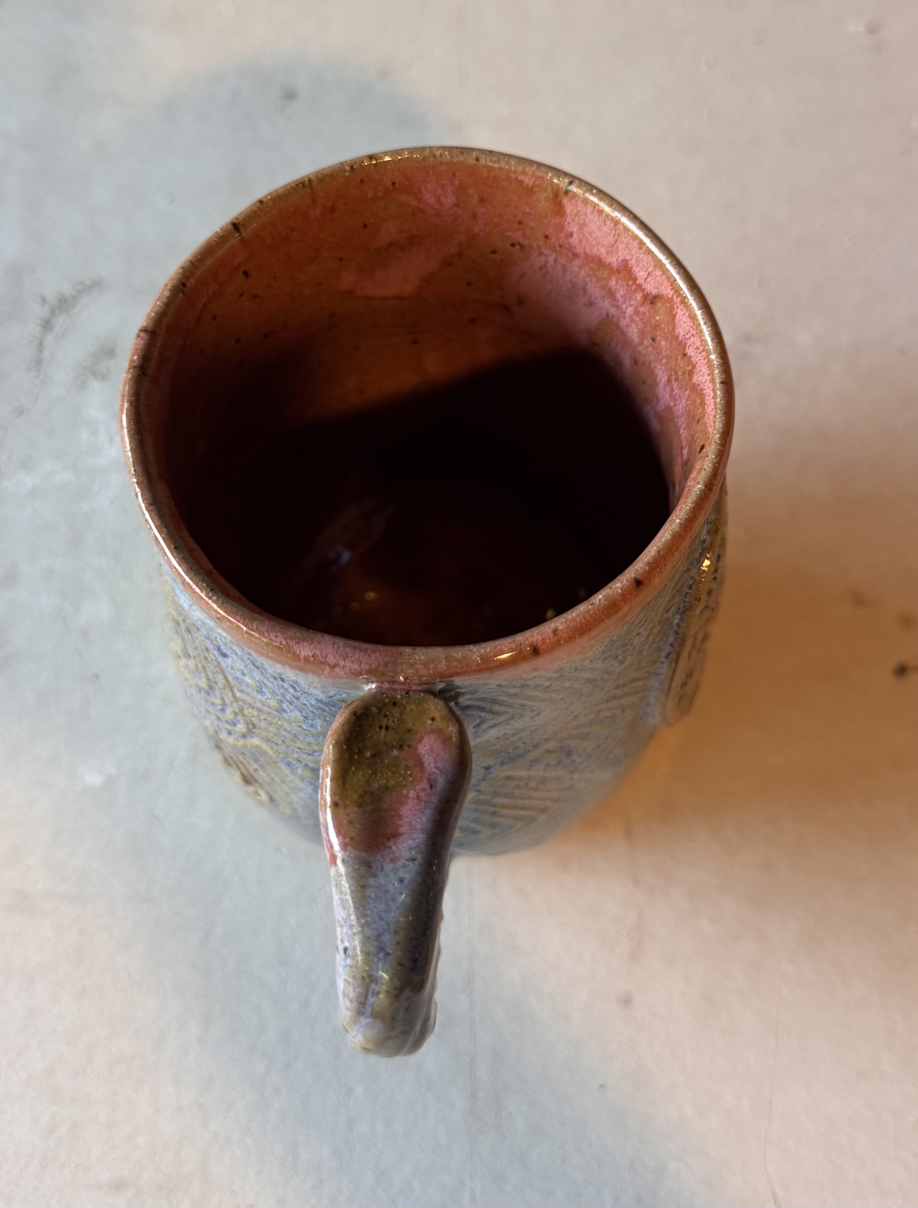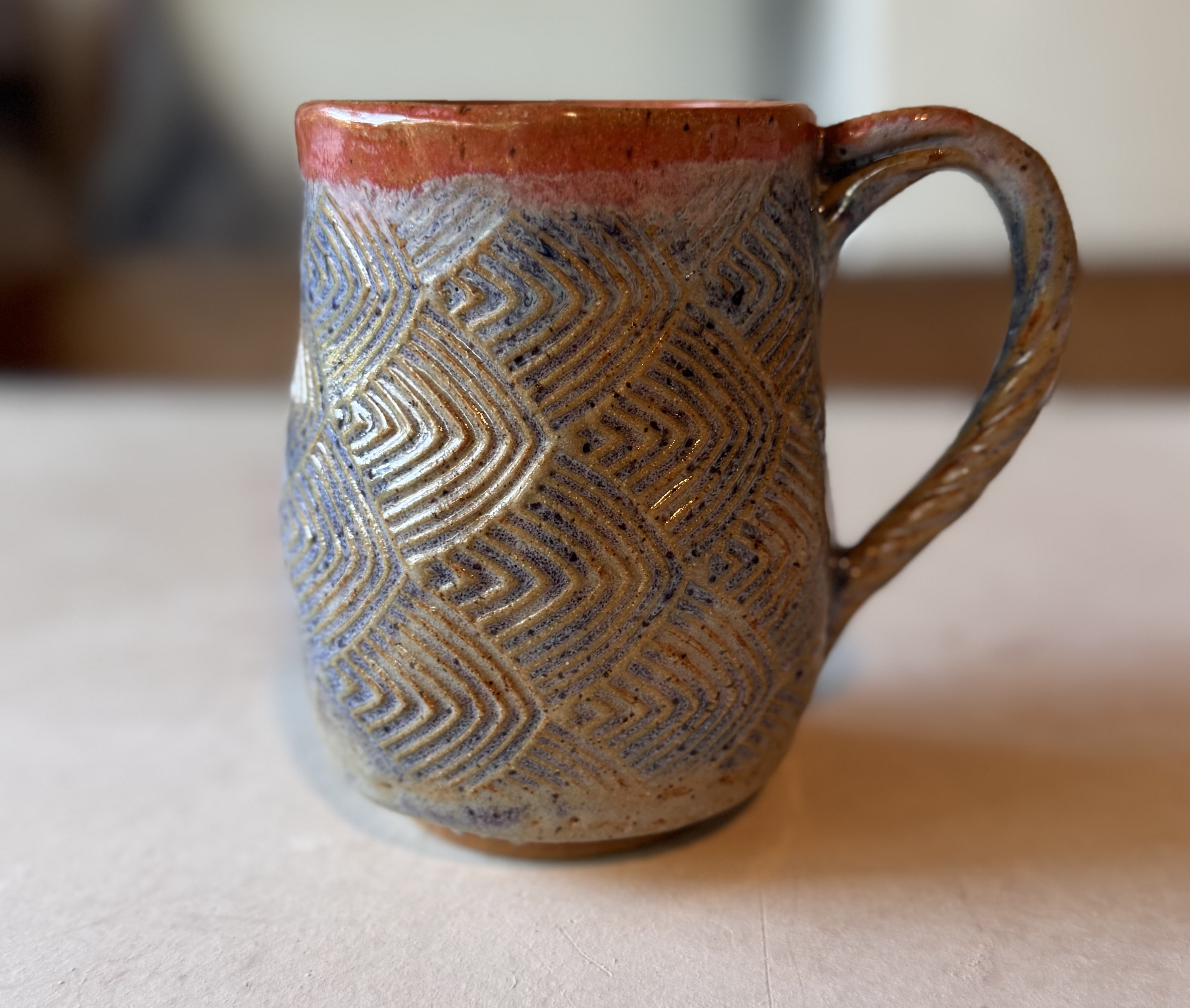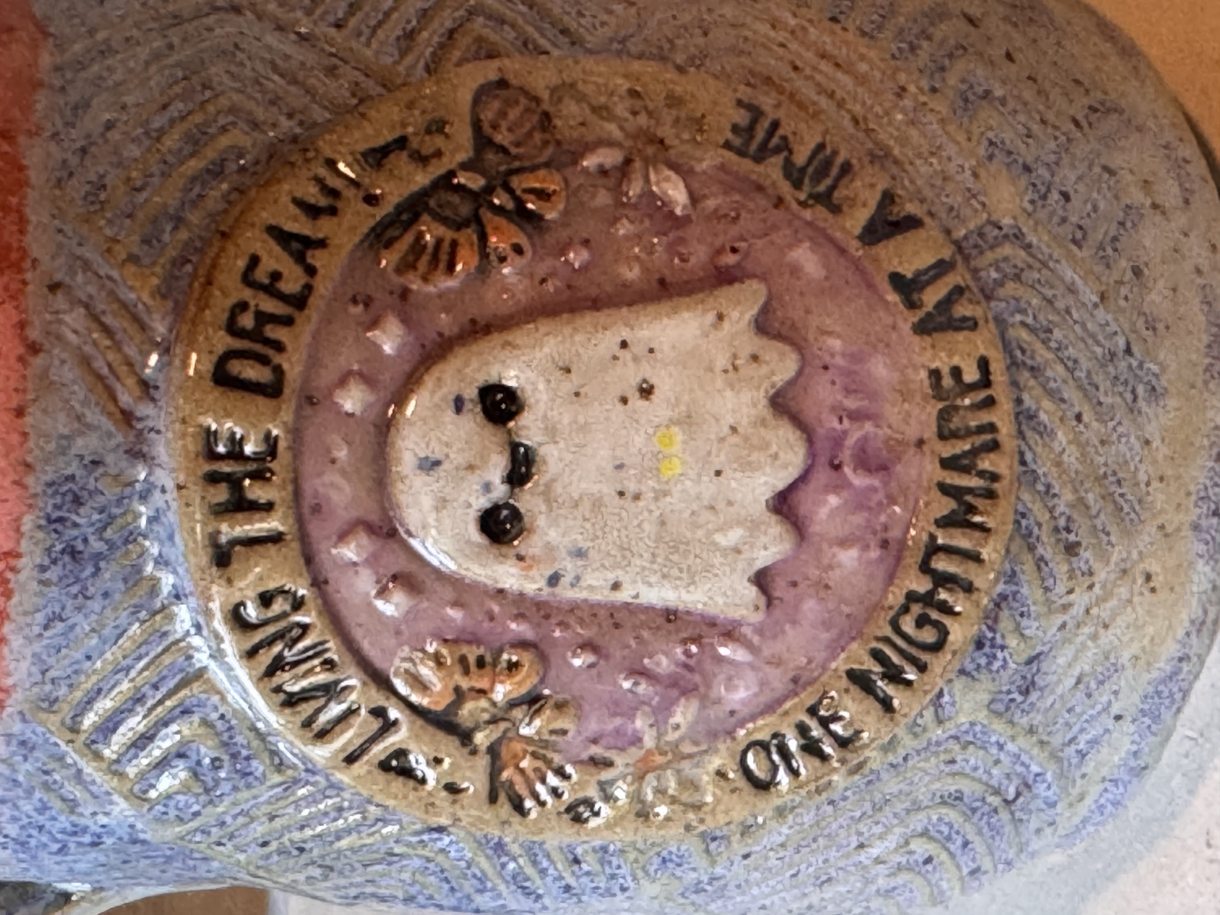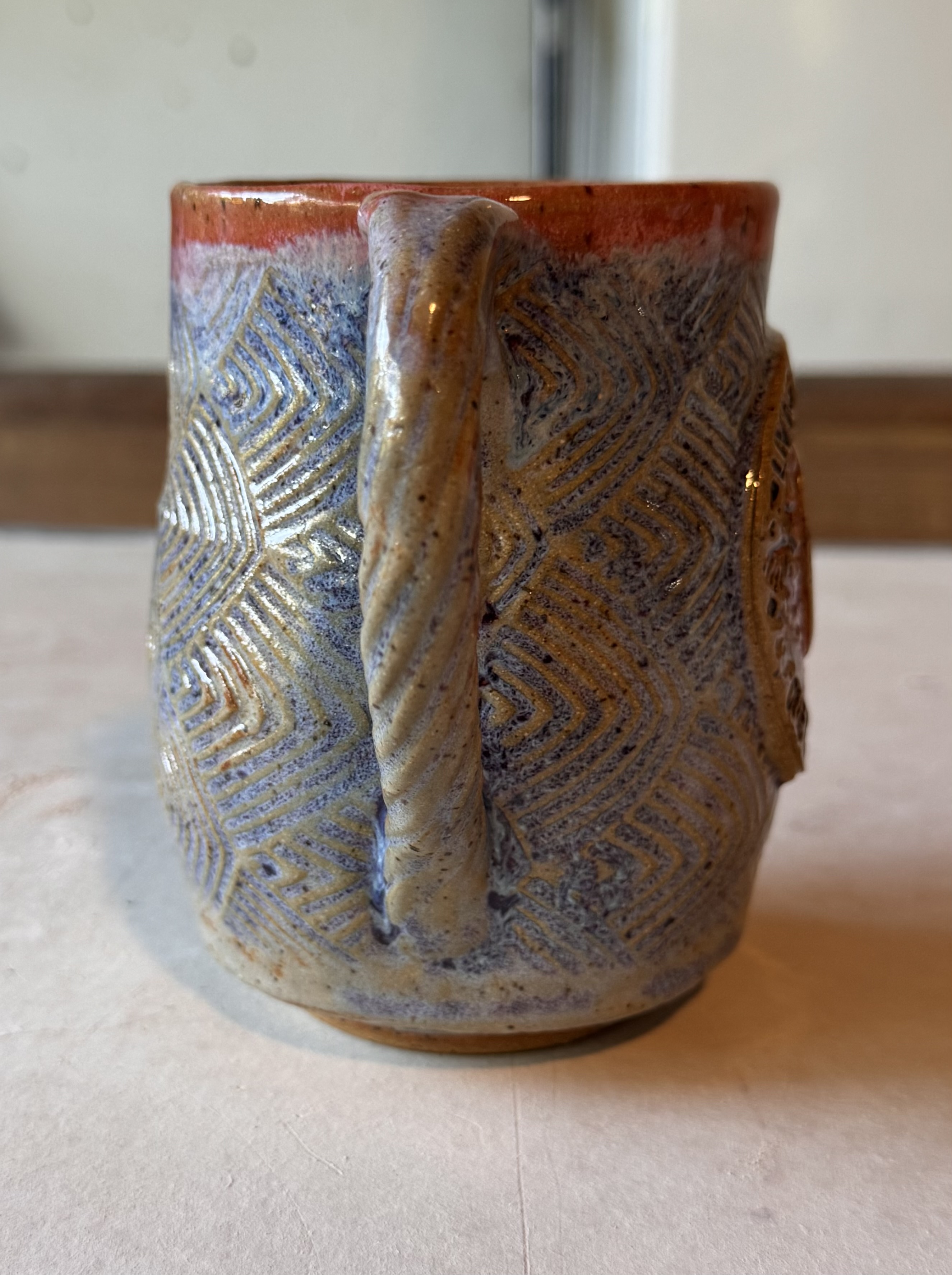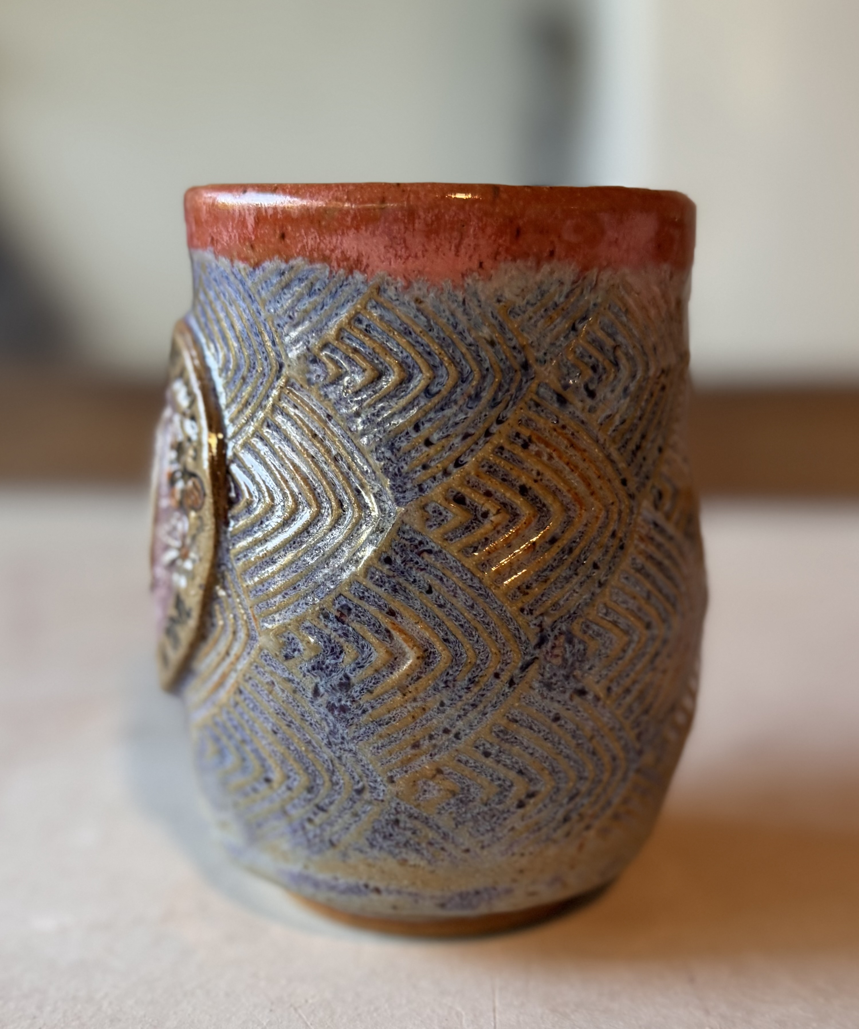 Each mug is hand-built from clay slabs, impressed with textured rollers to create the patterned background. The ghost medallion is sculpted separately, then carefully attached and detailed with carved features and layered underglazes for depth and character. After drying, the mug is bisque-fired, glazed with multiple colors, and then fired again to over 2300°F. The result is a durable, microwave-safe, dishwasher-safe piece of art that’s meant for everyday enjoyment.