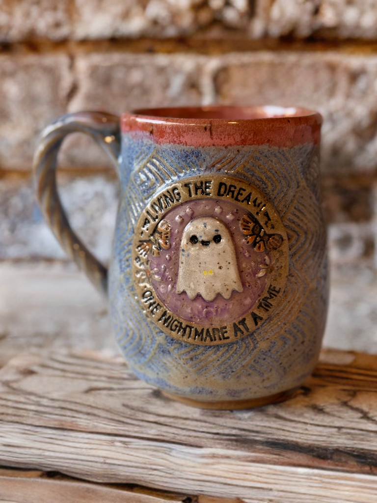 Meet your new favorite spooky sidekick! This hand-built ghost mug features a cheerful little ghost framed with the words “Living the dream… one nightmare at a time.” With its playful spirit and cozy charm, it’s perfect for sipping your morning coffee, evening tea, or even a midnight hot cocoa while you haunt the house. The textured background and warm glaze tones give it a rustic yet whimsical feel—making it both a functional piece and a conversation starter.