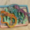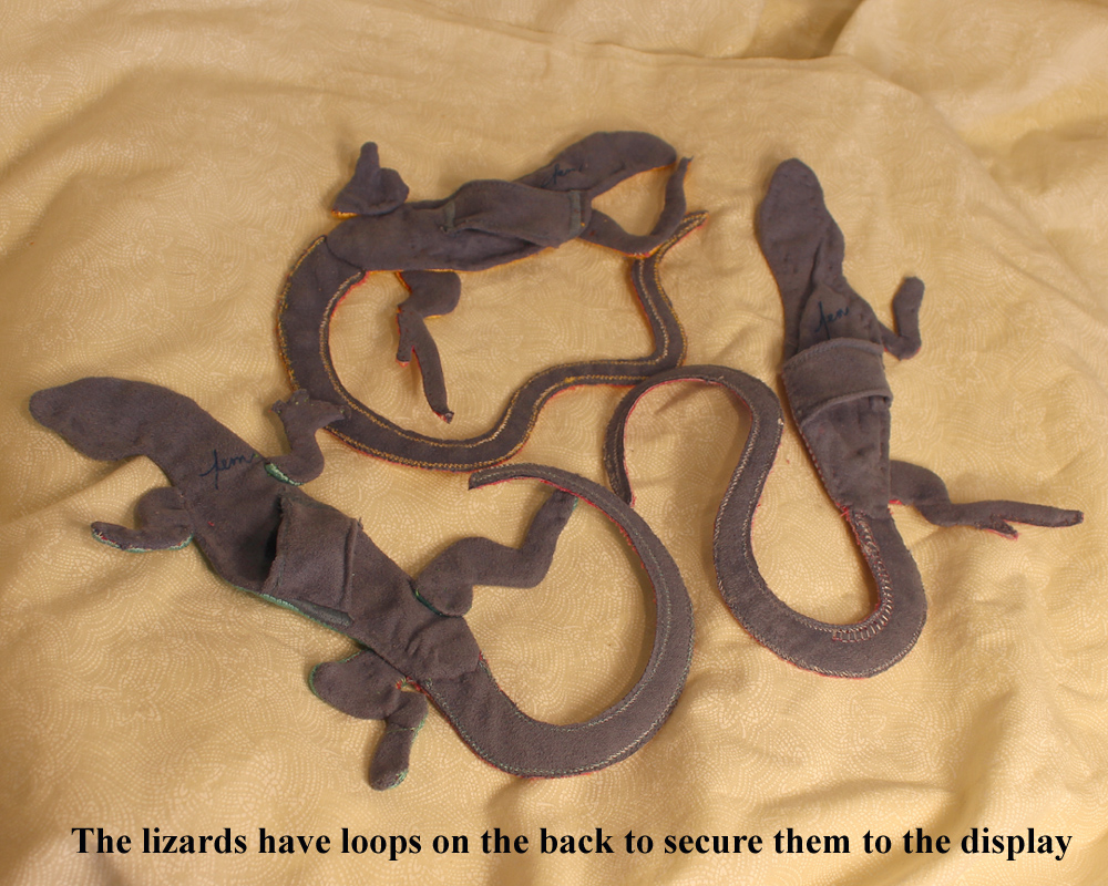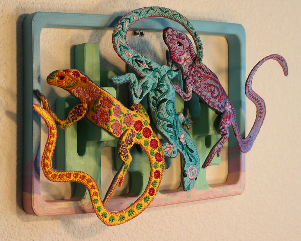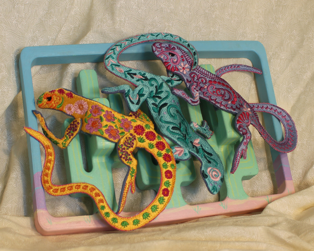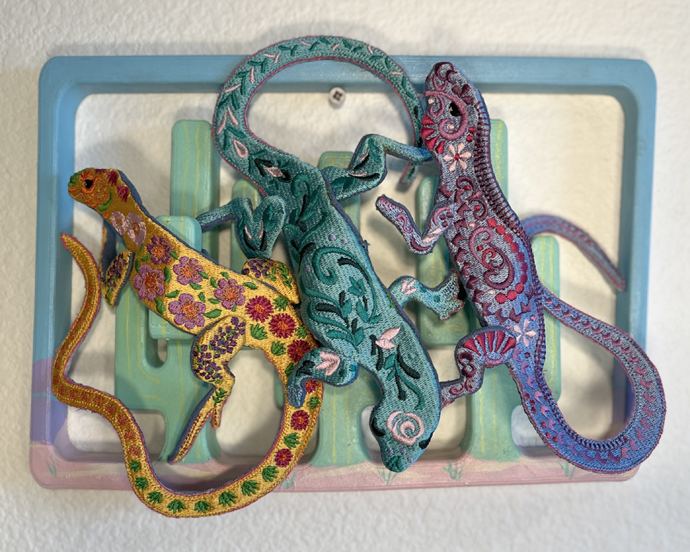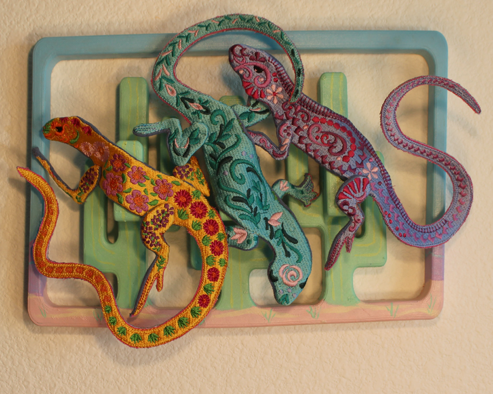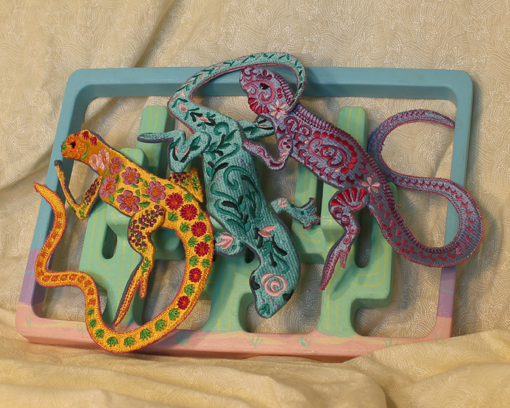 These three lizards were individually machine embroidered from designs that I created. The embroidered pieces are then machine sewn and hand stitched to complete it. Each lizard is lined with a soft fabric with a loop to hold the piece onto the saguaro stand. The saguaro stand is 3D printed in my home and hand painted.