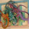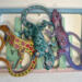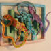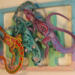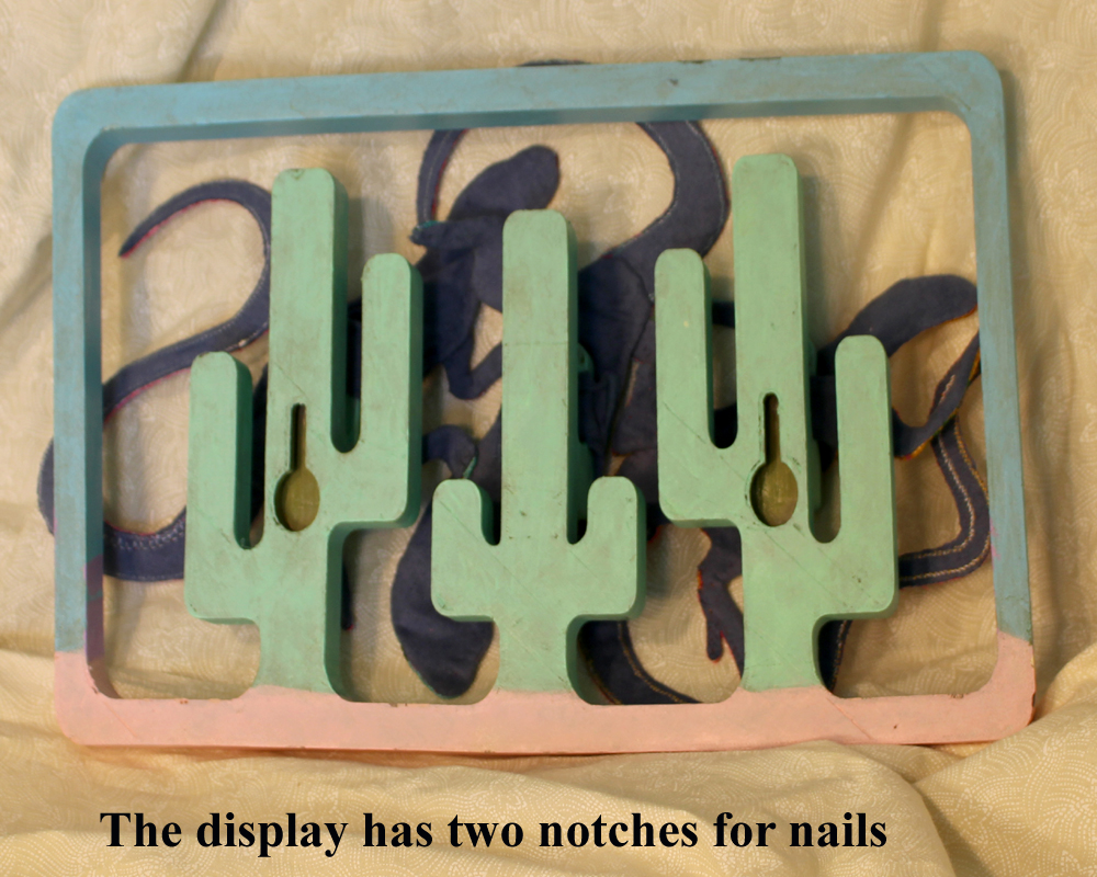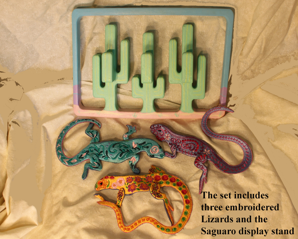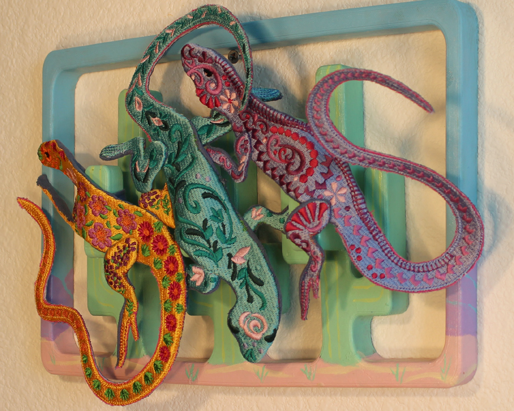 This dramatic embroidered piece was inspired by the variety of beautiful and colorful lizards often seen sunning themselves in the Sonoran Desert and around my home in Why, AZ. Each lizard has a unique design in bright colors. “Good Day Sunshine” includes the three lizards and the saguaro display piece and would be a dramatic and colorful display on your wall.