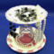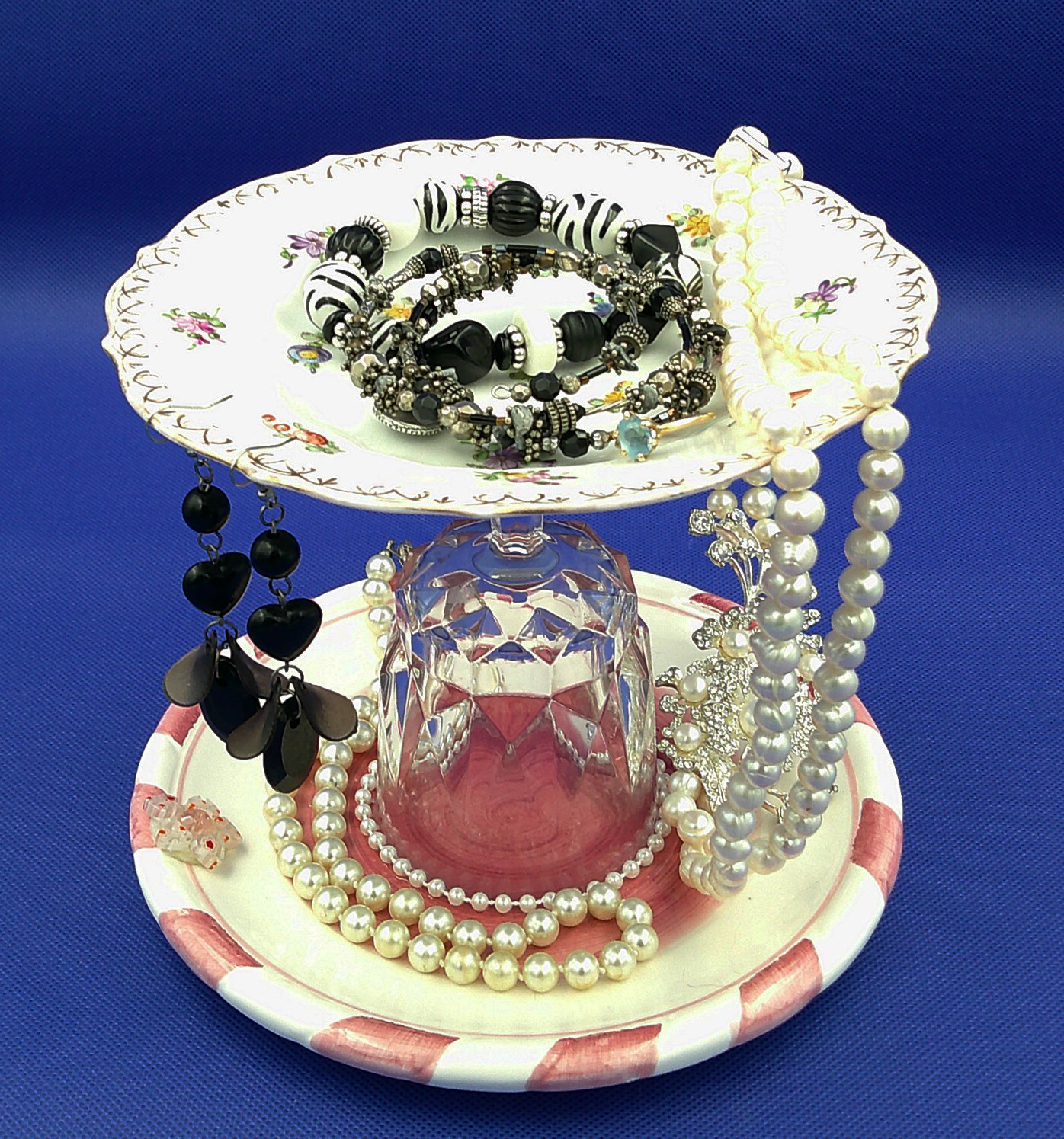 When I first saw the bottom dish of this piece, I immediately thought of a giant lollypop. I saw the nick and knew that I could give it something to add to the idea of a lollypop. So, I created the flower button out of a button and beads. It is small and I was challenged to make it work. All of my pieces are done over time allowing for research and drying. Once I got the flower button made and set in place, I added the crystal goblet. After that set up, then I added the flower plate. After it set up, I decided that pearls would be the right touch to set off the crystal on the plate to become the Lollypop Jewelry dish.