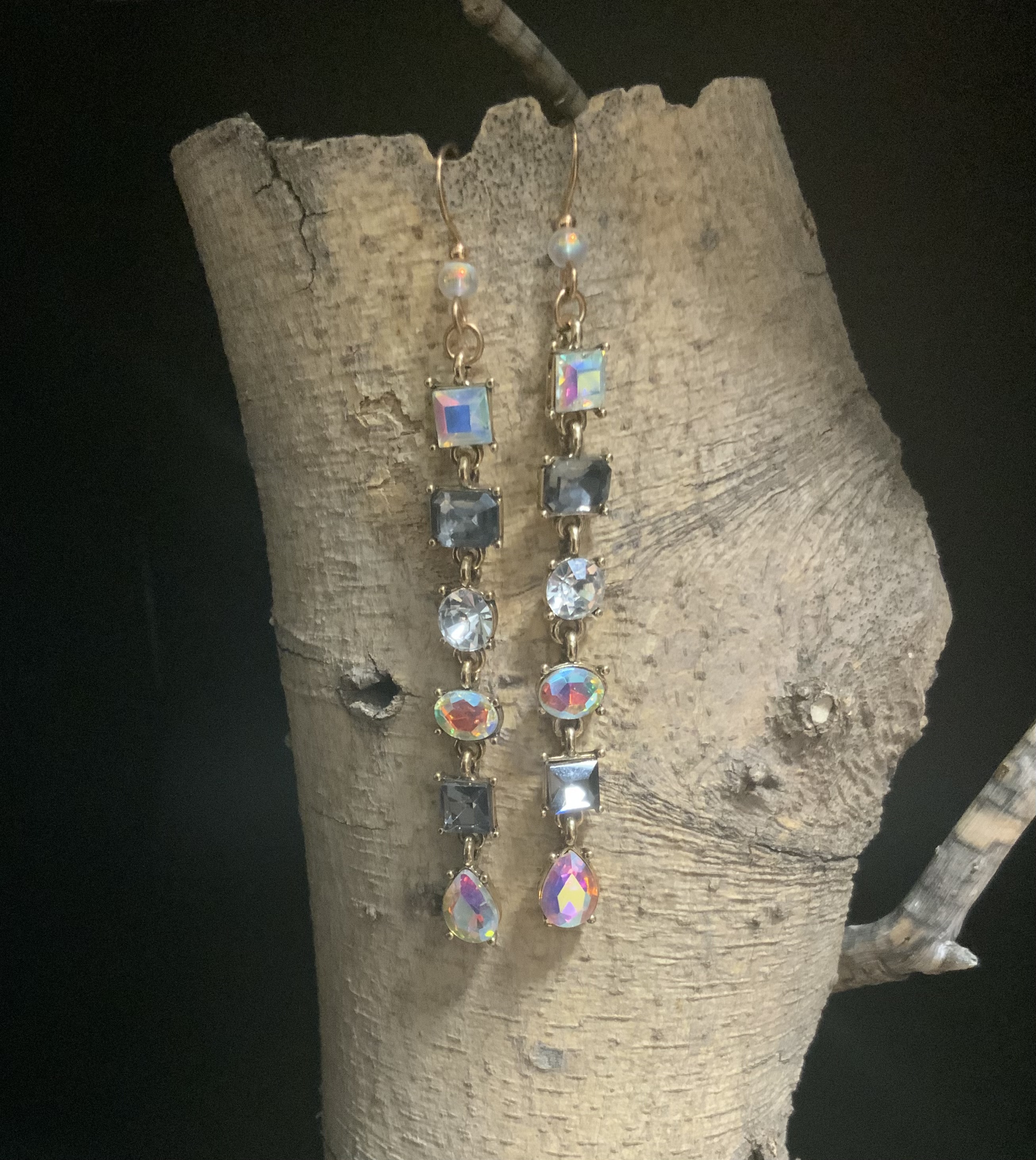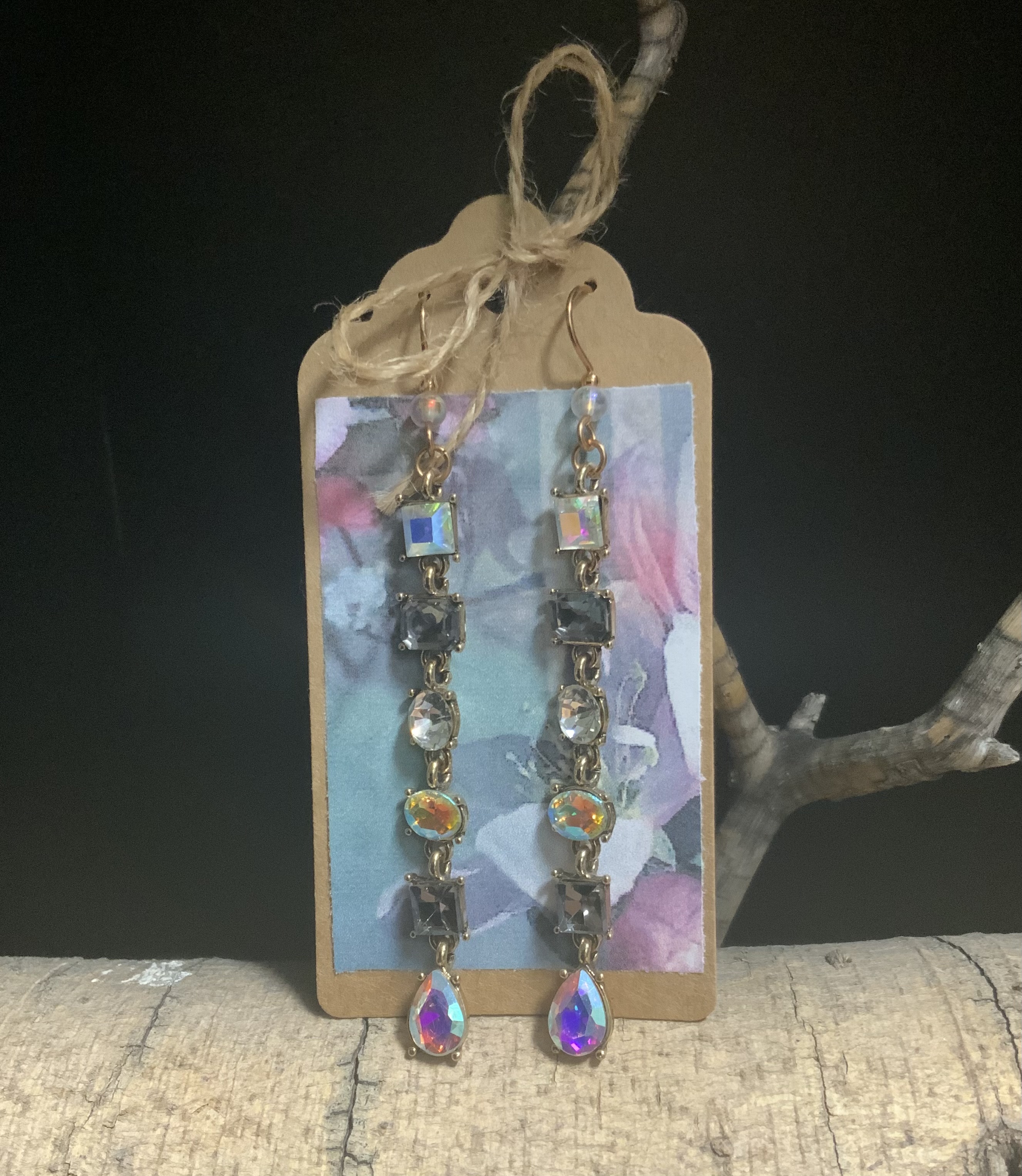 These long rhinestone earrings have handmade bronze ear wires with 4mm multi-color glass beads. The long dangles have a selection of different shaped rhinestones in colors from multi, clear, to gray. Giving them that elegant look. Each pair of earrings comes displayed on a handmade card.