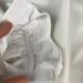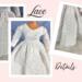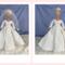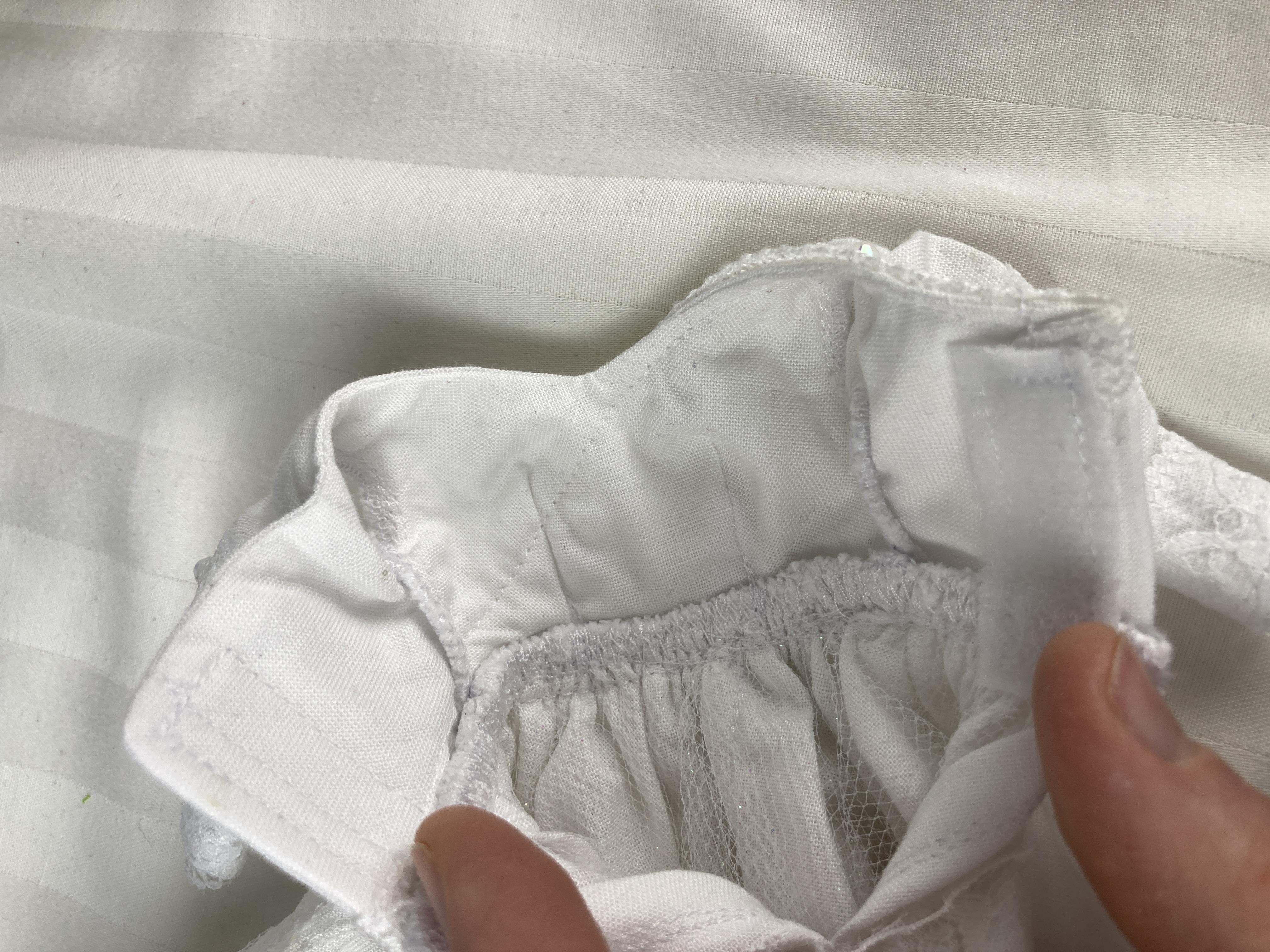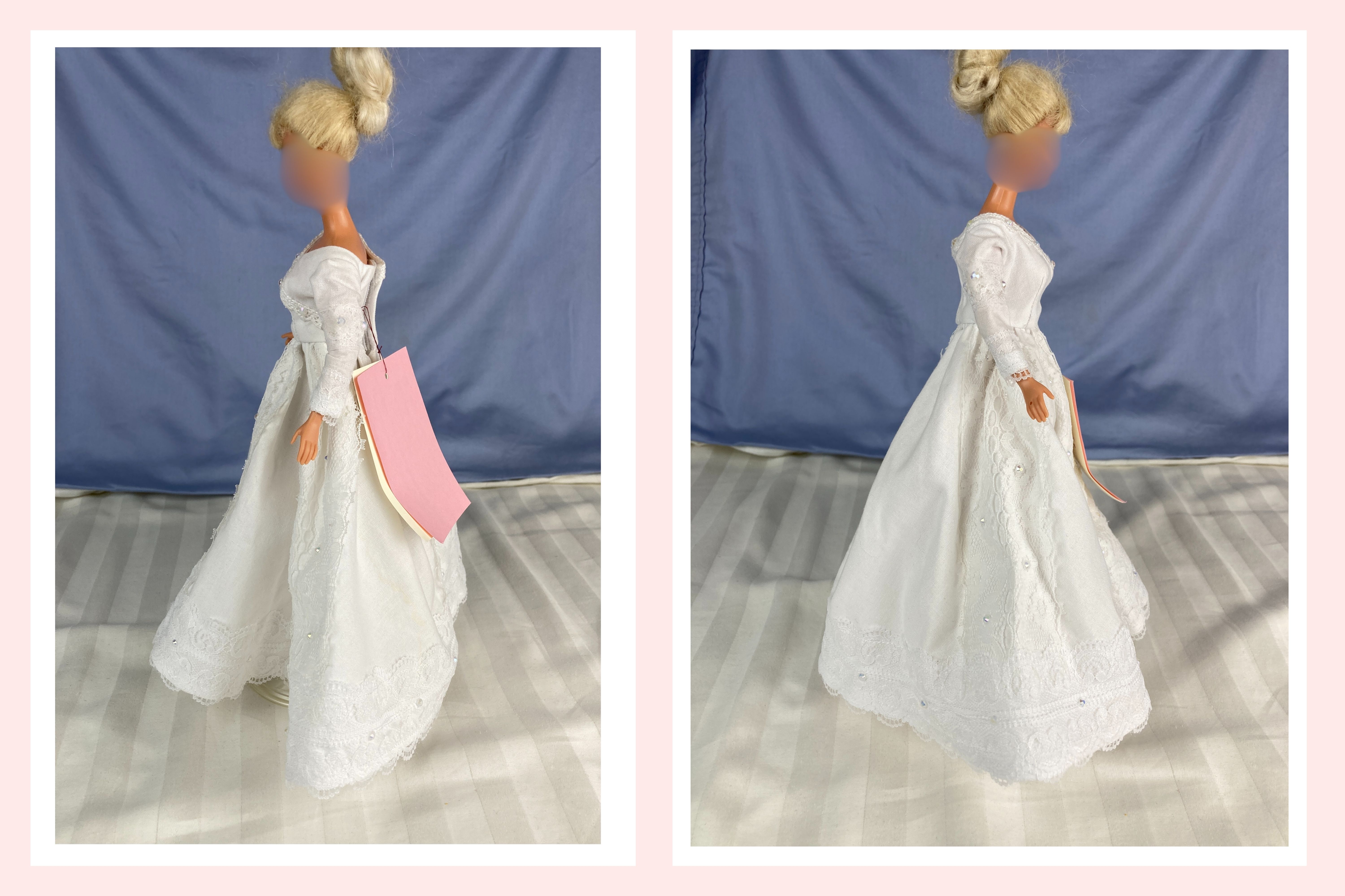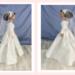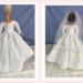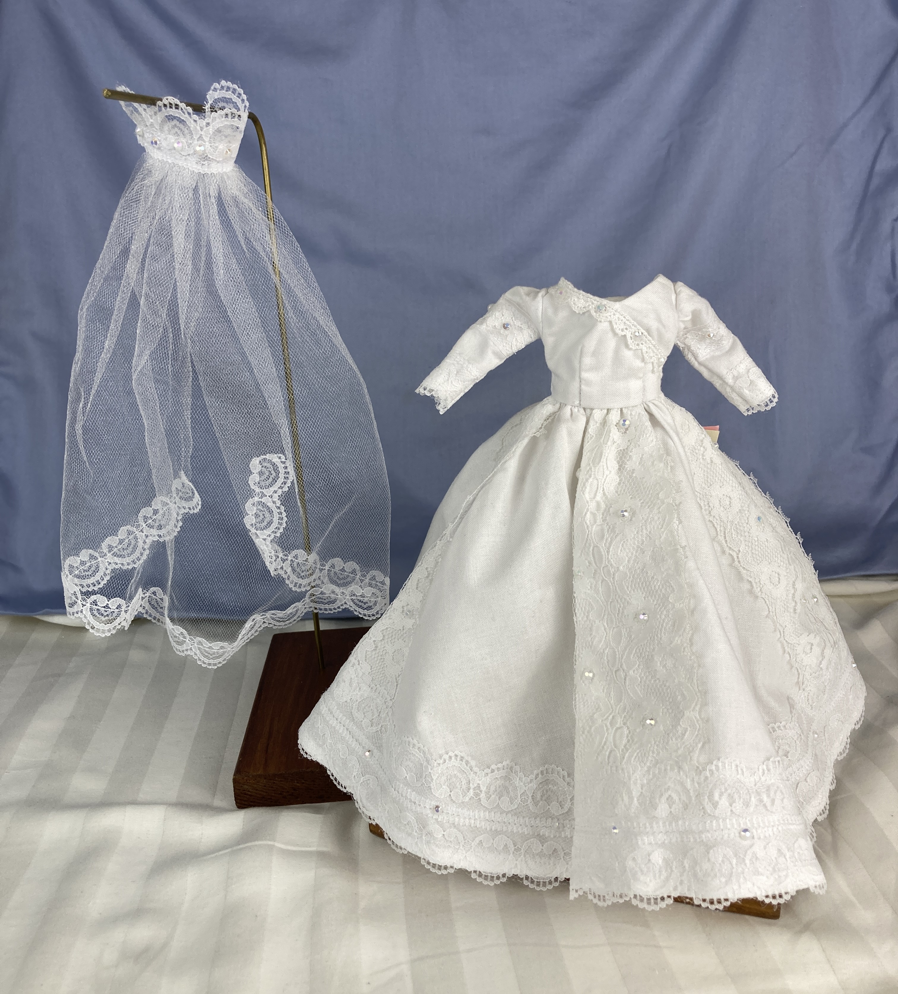 Care Instructions: For removing dust and small particles from the dress and veil use some packing taped rolled up, sticky side out, and gently dab at the dust and particles to carefully remove them. For small dirt spots use a clean wash cloth or rag and rub the spot out with lukewarm soapy water. Iron dress on low setting if desired, watching out for lace, tulle, and trims that might melt.
