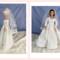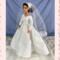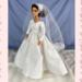 This classic romantic wedding dress in the ballgown style is fit for royalty! Made from a white cotton fabric this dress has a v-neckline and long sleeves accented in lace on the upper arm and the wrists. White lace, starting at the back of the neckline and crossing over the front, creates a "wrap" effect on the bodice; both the sleeves and bodice have beautiful gem detailing. The skirt is very full and gathered and features a one layer attached tulle underskirt. The skirt has beautiful vertical wide lace detailing down the front, back, and sides of the skirt and deep horizontal lace detailing along the hemline. The same gems found on the bodice are found on the lace detailing of the skirt. The dress has a hook and loop back closure. The knee-length veil is made from a soft, almost pearlescent white tulle that attaches onto a lace headband that features elastic. The headband is crowned with more of the gems. The bottom of the veil is edged in the same heart styled lace as the headband. This veil has a very nice lay as shown in the pictures and gives the feel of a modified mantilla veil.