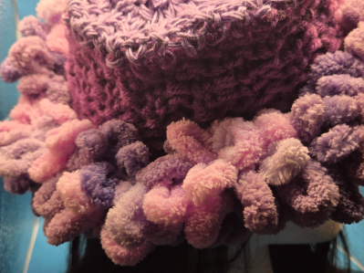 Looping Soda my way with Grape Soda colored bucket type hat.. You will be Unique and stylish in this off the hook loop yarn. Multicolored grape hues is one of my favorite colors. 100 % Chenille loop yarn. 100 % polyester yarn. Machine washable