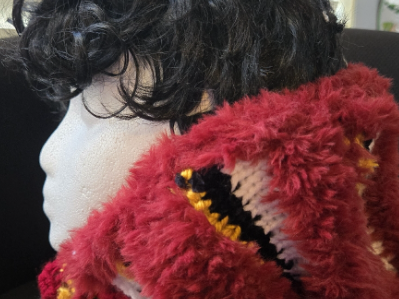 Team spirit faux fur trimmed in burgundy yarn .Loom knitted hoodie hats made wirh faux fur yarn and mixed burgundy ,gold and black polyester yarn for body of hat. Machine washable in cold water. One size fits all. Hoodie made with neck cowl to keep head and neck warm.You can buy or try with pattern on request.