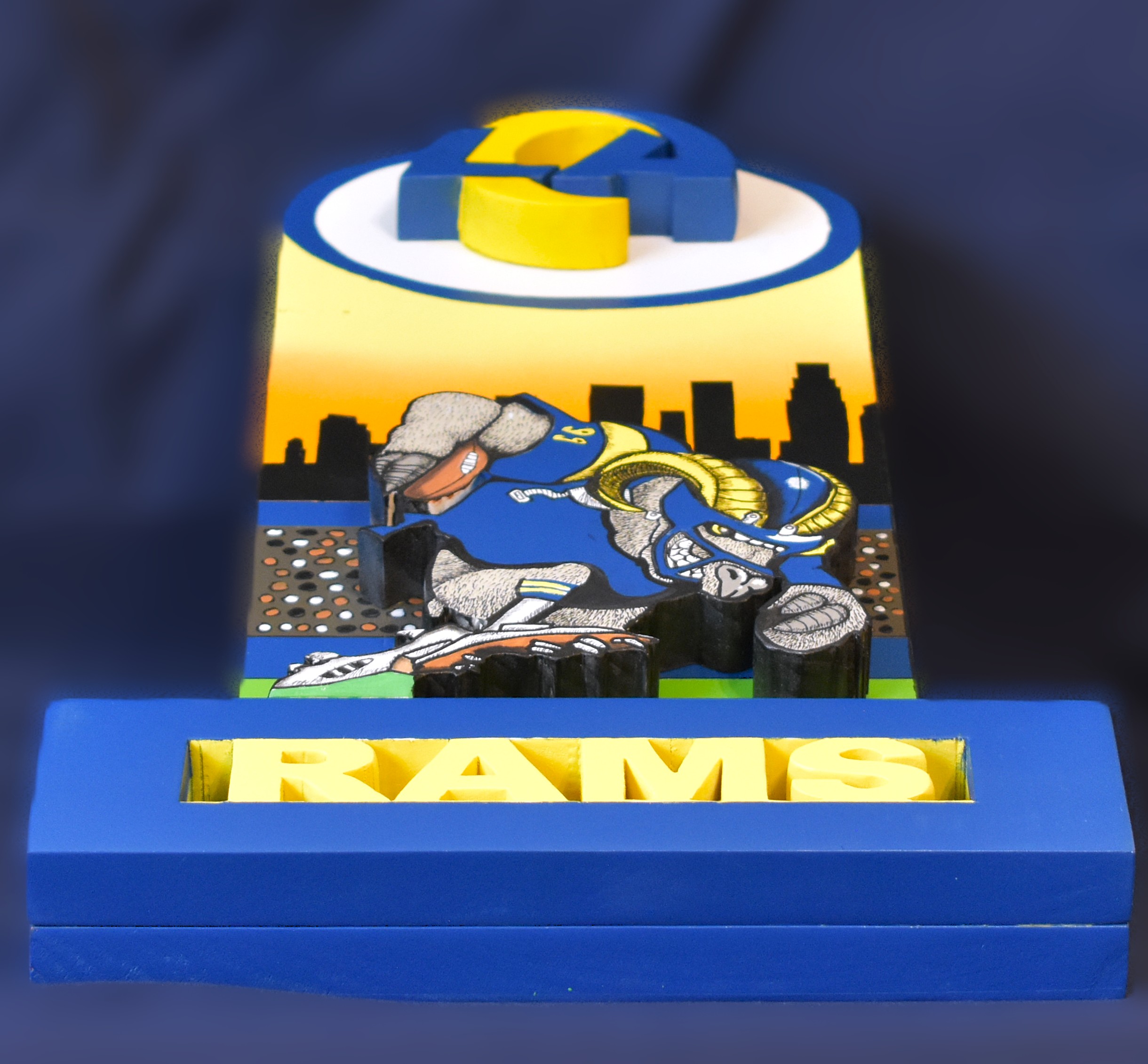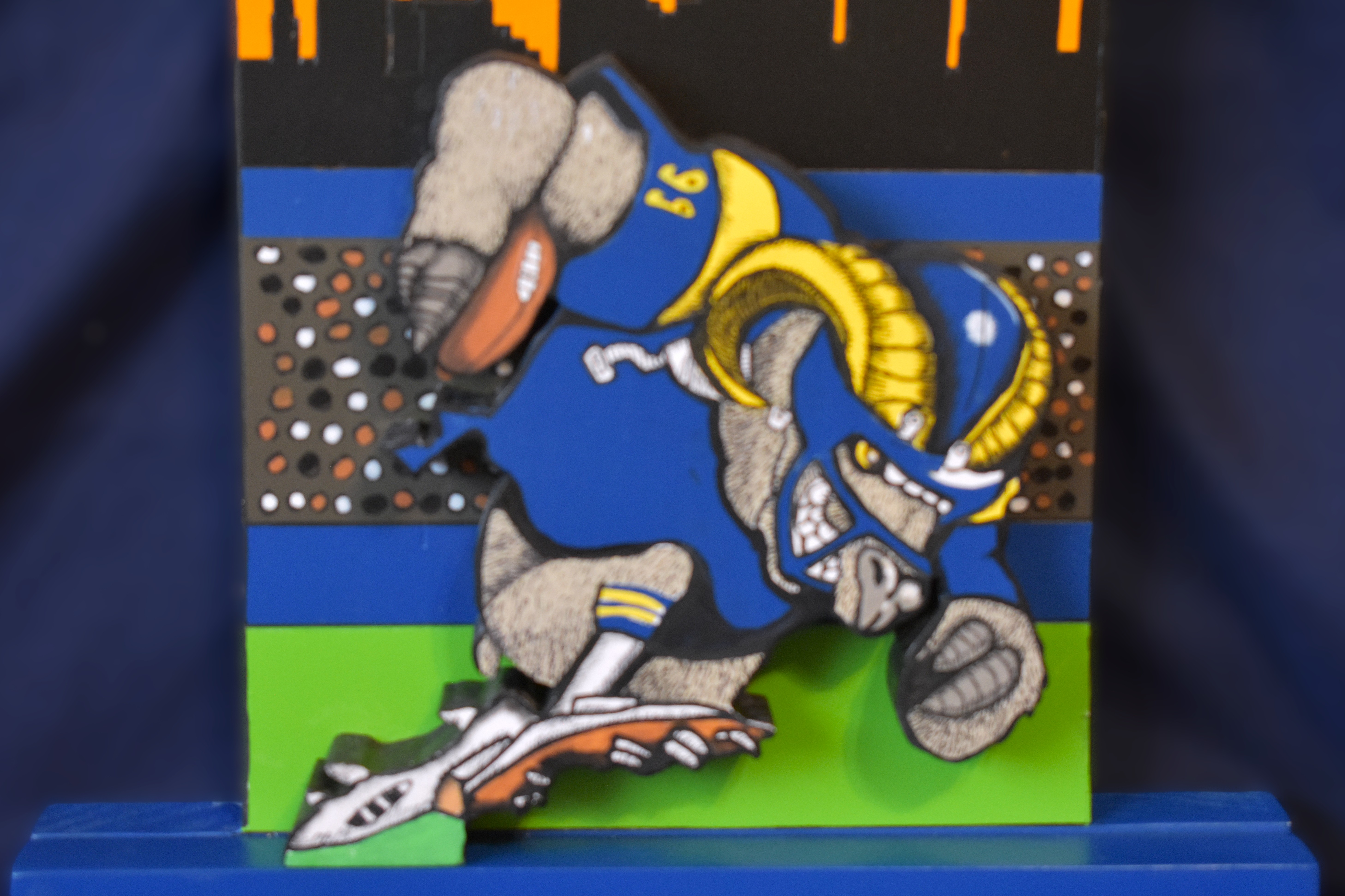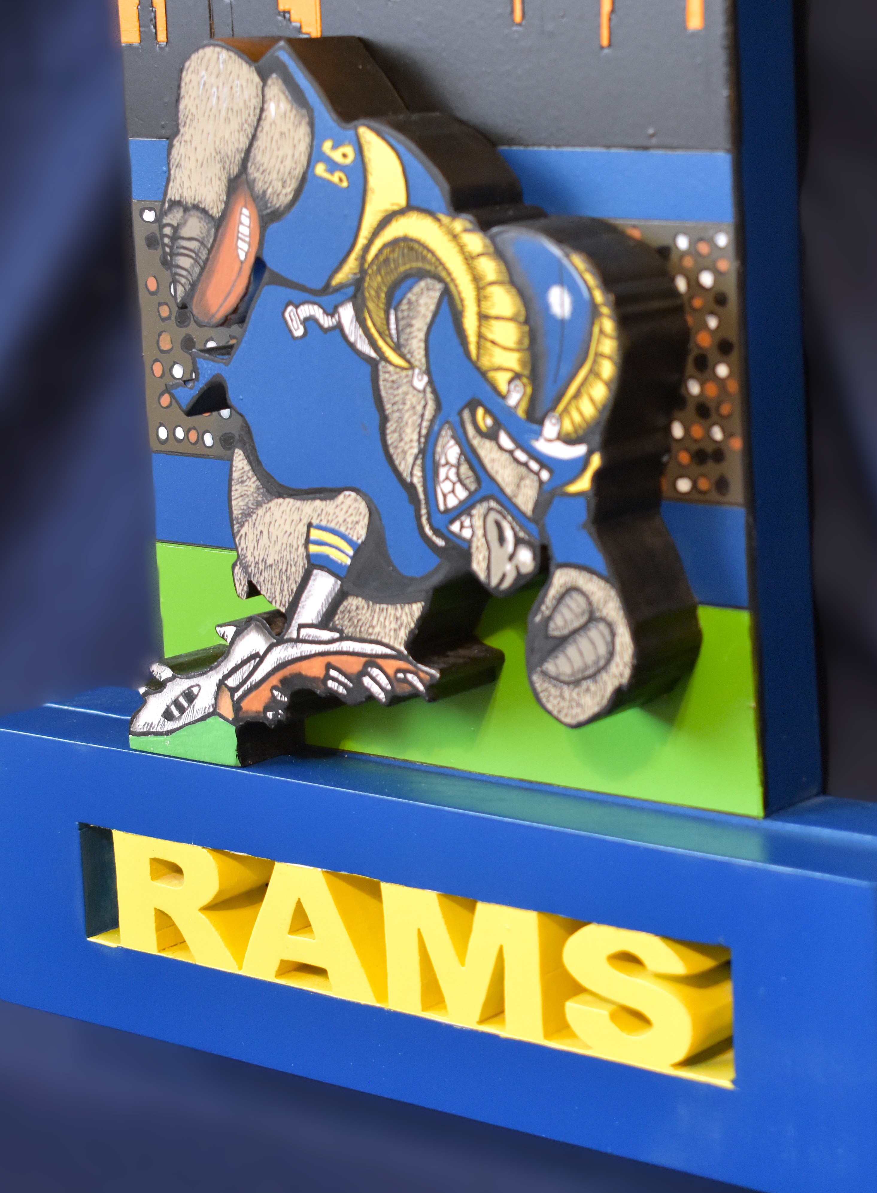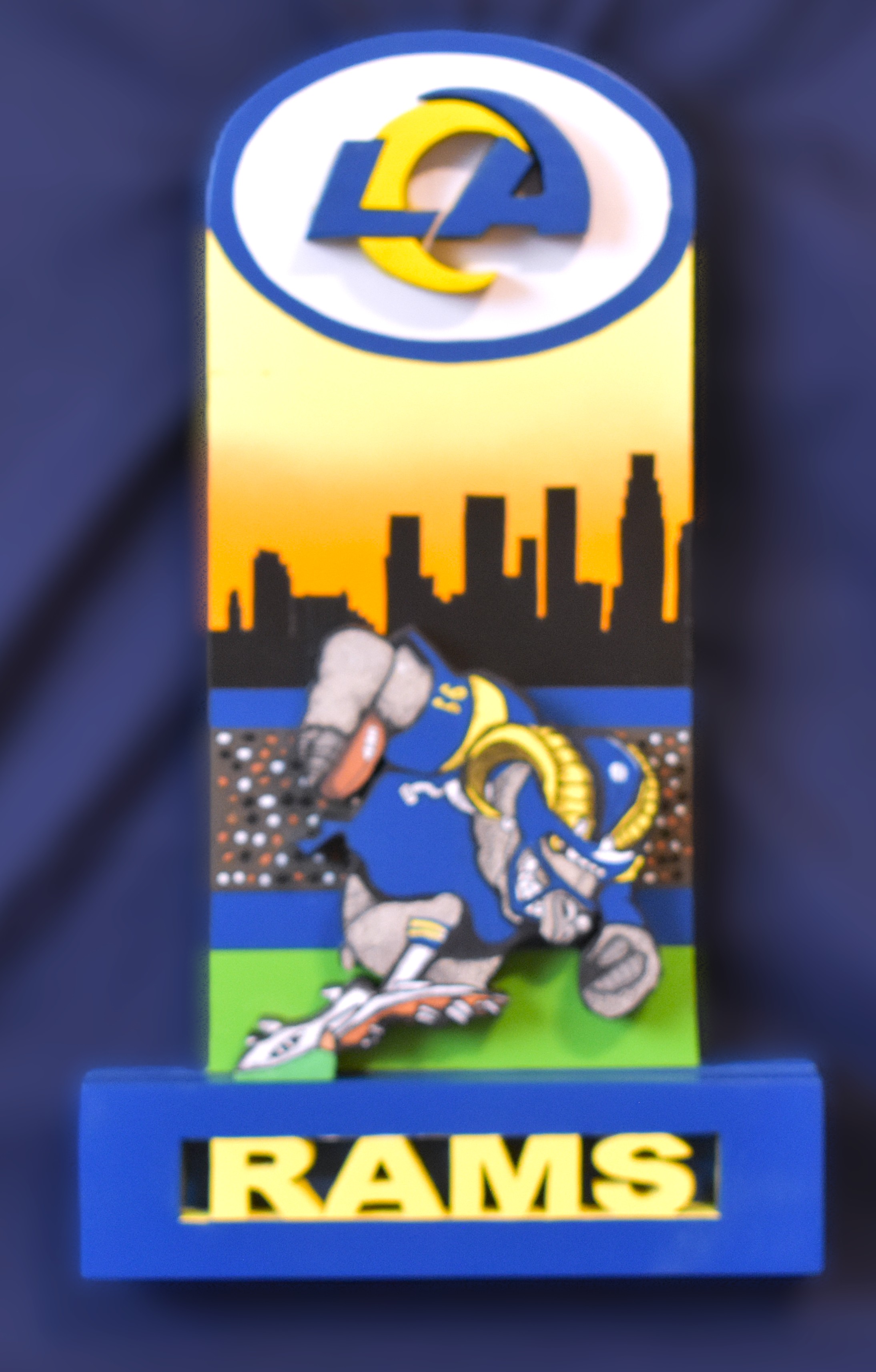 Elevate your home or office décor with our stunning Los Angeles Rams 3D Wooden Diorama. Measuring 9 ¼ inches in Length and 15 inches in height, this handcrafted piece is made from high-quality poplar board wood, ensuring durability and a premium finish. Featuring a charming cartoon-style Ram sprinting across the field, with the iconic city Skyline Silhouette in the background. this hand-painted Diorama captures the spirit of the game and makes a perfect gift for any Rams fan. Hang it proudly to showcase your team loyalty and add a touch of whimsy to your space. The exclusive design features a convenient sawtooth hanger on the back, allowing for effortless Wall mounting and display. This one-of-a-kind Diorama is not mass-produced, making it a distinctive addition to your space. For a detailed view of its intricate features, please enlarge the accompanying photos.