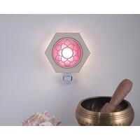 Lasered Wood and Glass Night Lights. Hexagon shaped wood with opaque colored glass insert and night light base. Handmade in the USA.