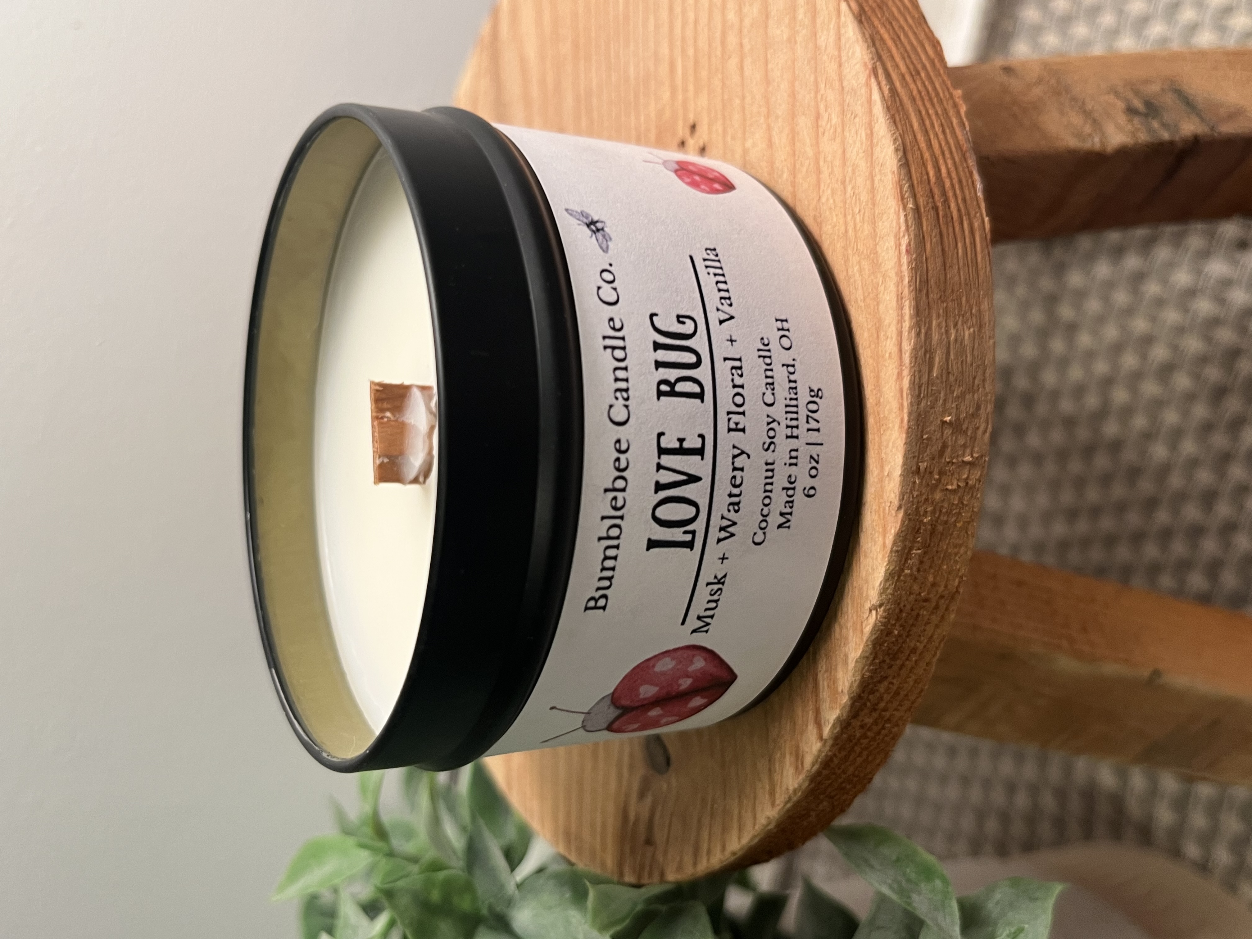 Each Tin candle is filled with coconut soy wax, clean fragrance oil and crackling wood wick! 6 oz |170g has rubber dots on the bottom of candle to protect all surfaces. Container can be re-purposed once the wax melts down! Makes a great gift or keep for yourself!