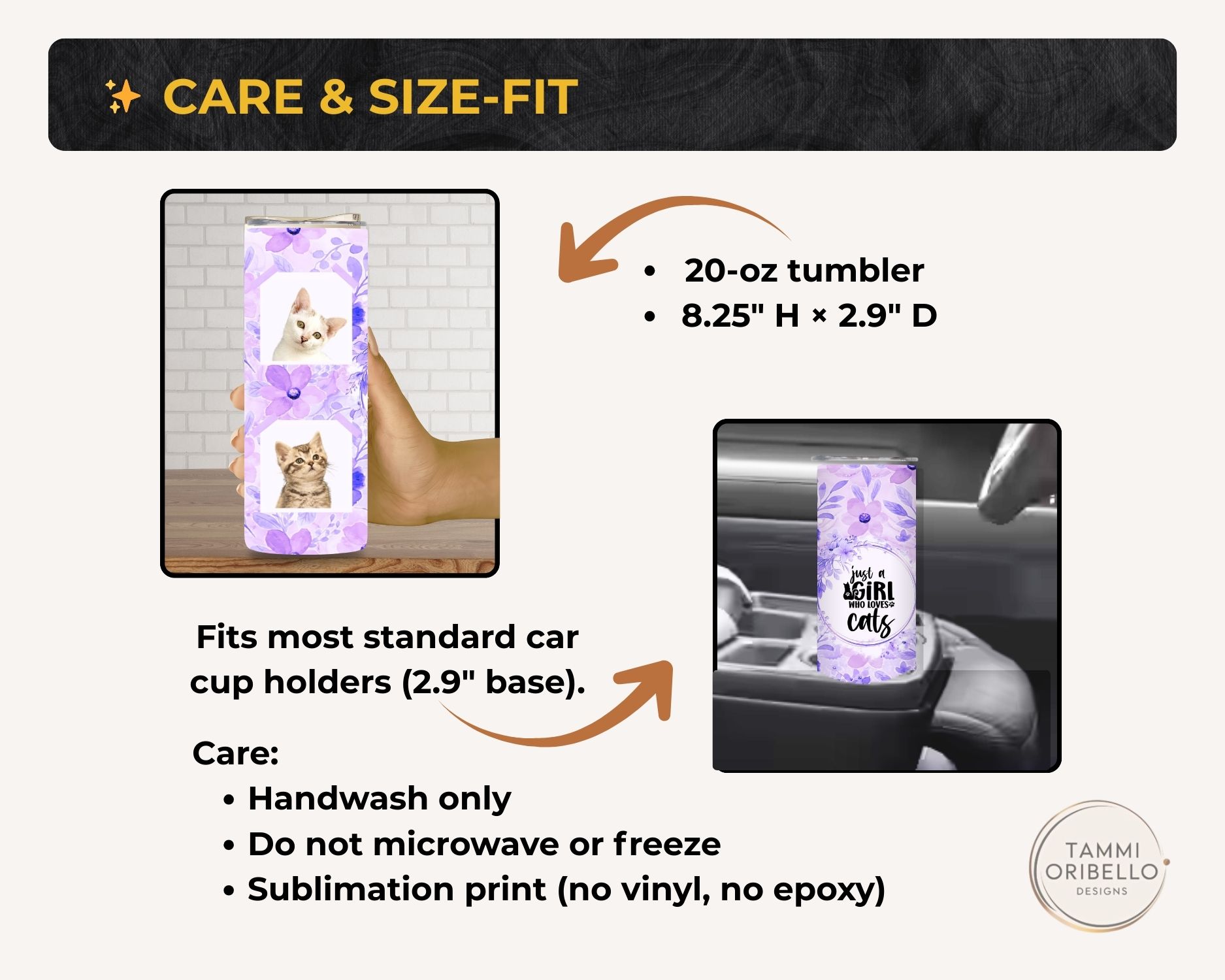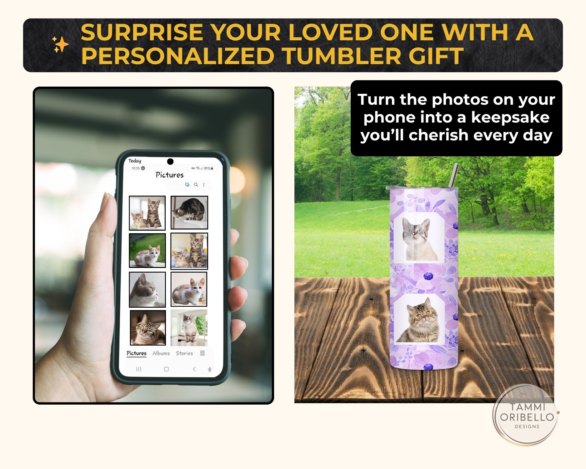 Cats steal our hearts in the sweetest way. This custom tumbler lets you take your favorite whiskered faces everywhere you go. Whether you're sipping at home, working, or on the road, this daily companion turns your cat’s personality into a keepsake you’ll smile at every time you pick it up. It’s thoughtful, personal, and made just for you—not something pulled off a warehouse shelf.