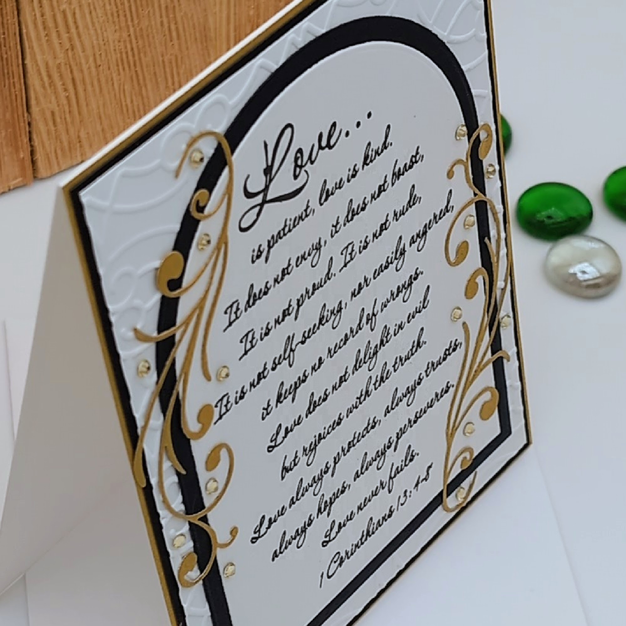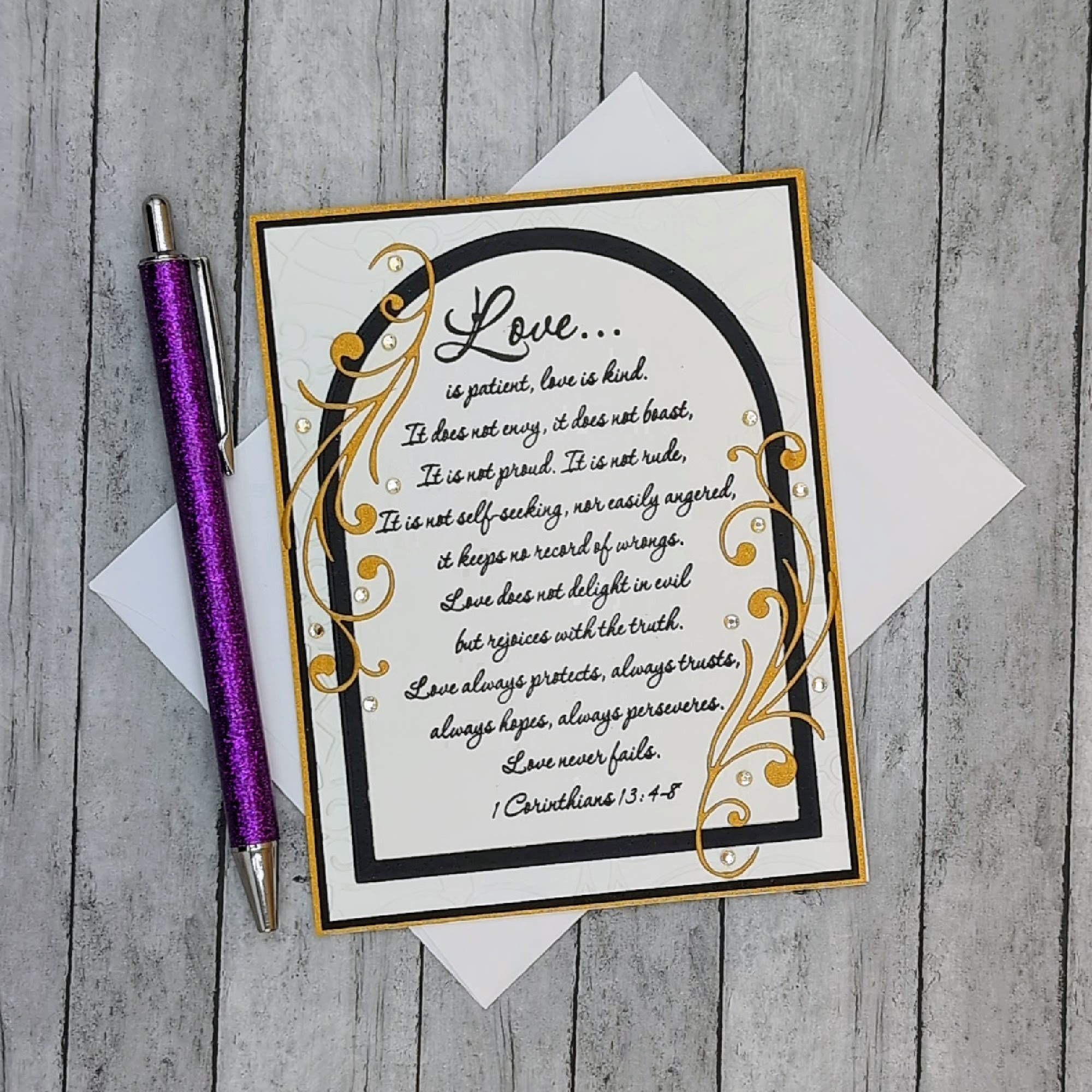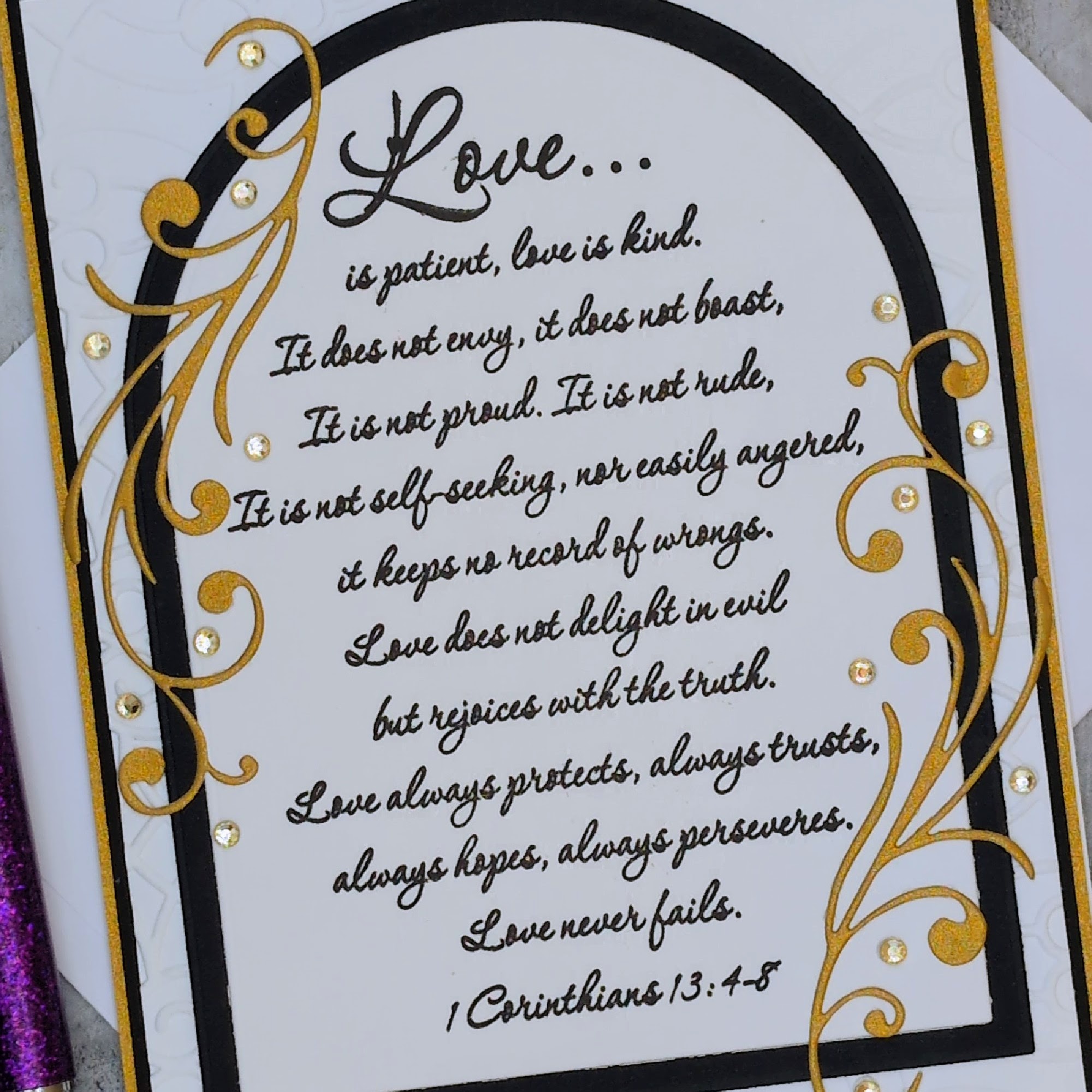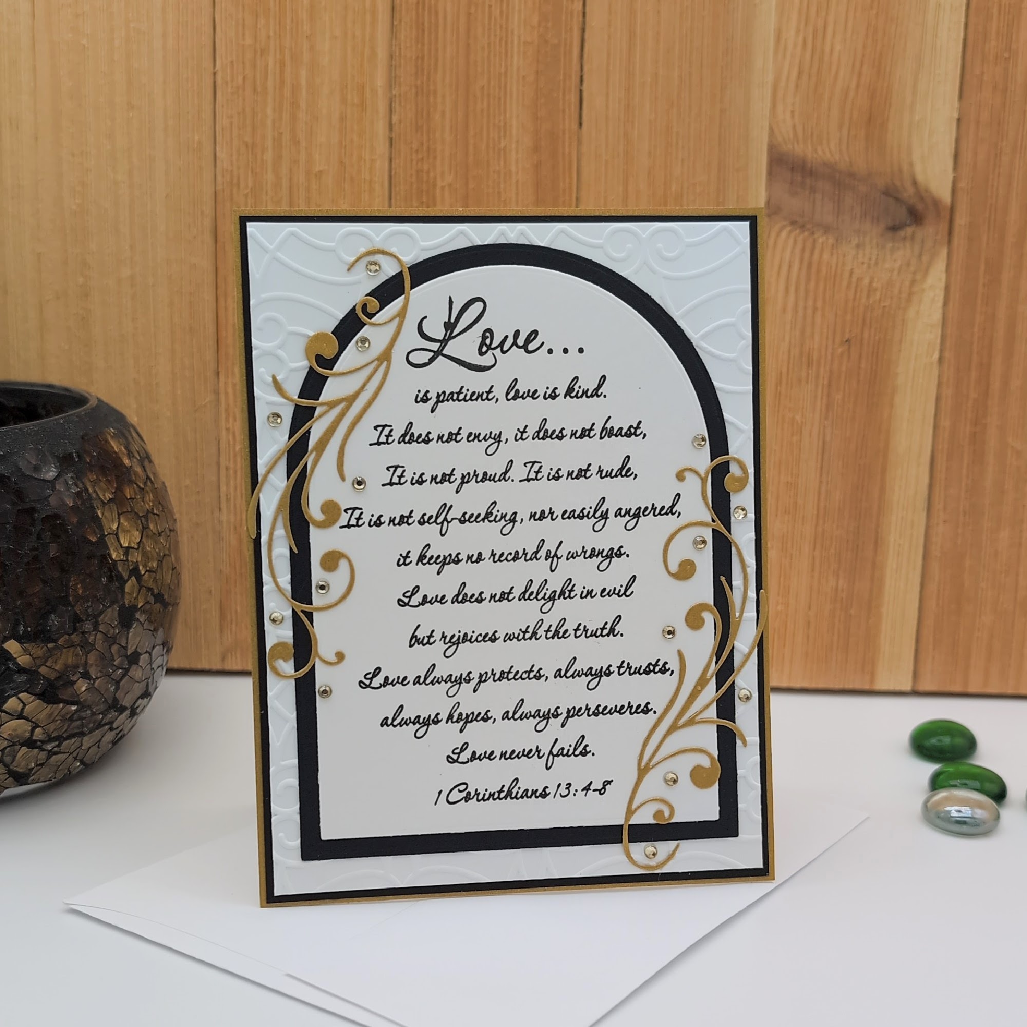 Celebrate enduring love with this handcrafted card featuring the timeless passage from 1 Corinthians 13:4–8. Embellished with ornate gold and black accents, embossed textures, and rhinestone details, the front showcases “Love is patient, love is kind…” in elegant script. Blank inside for your personal message, this card is perfect for weddings, anniversaries, encouragement, or sharing faith-filled inspiration. A meaningful keepsake for any occasion rooted in love.