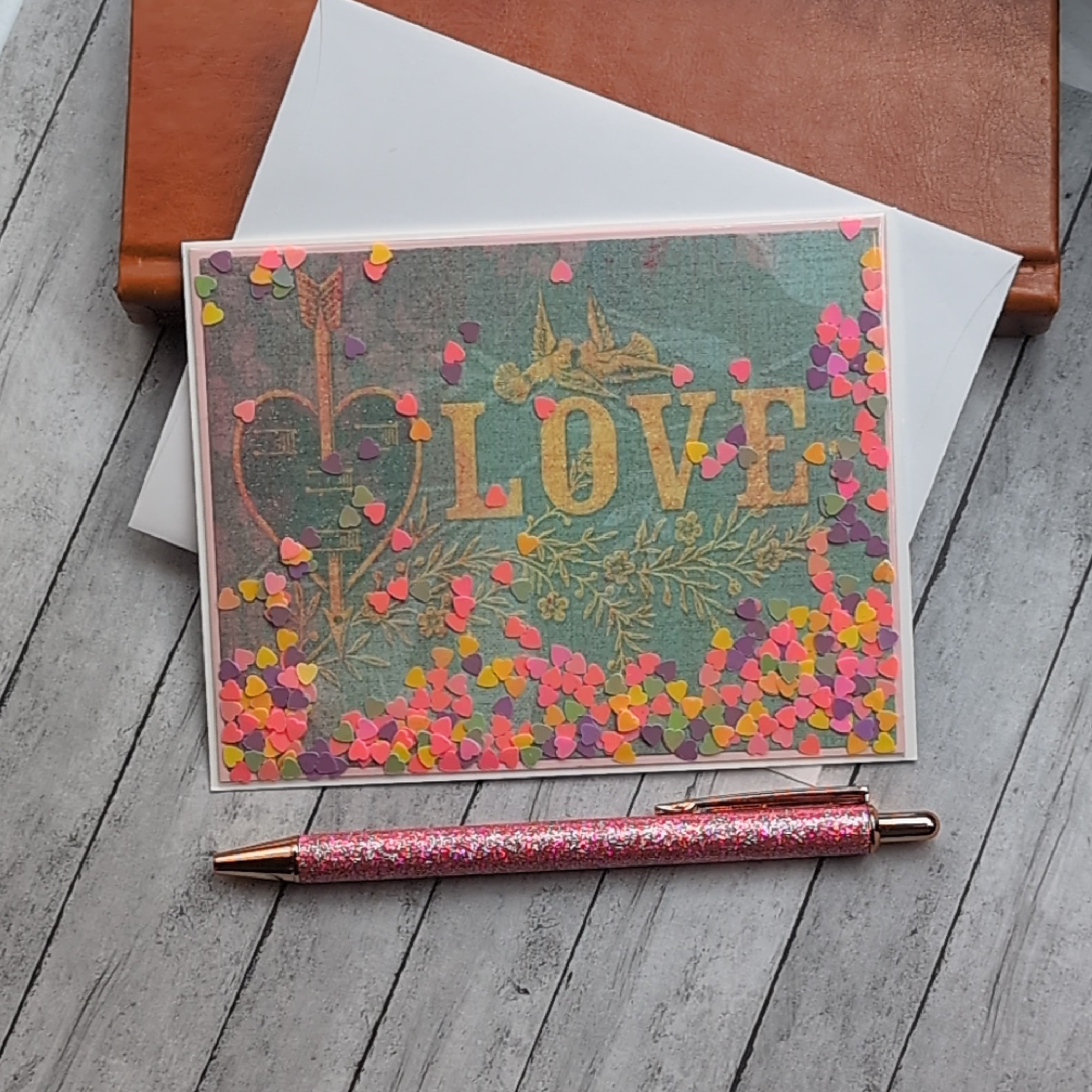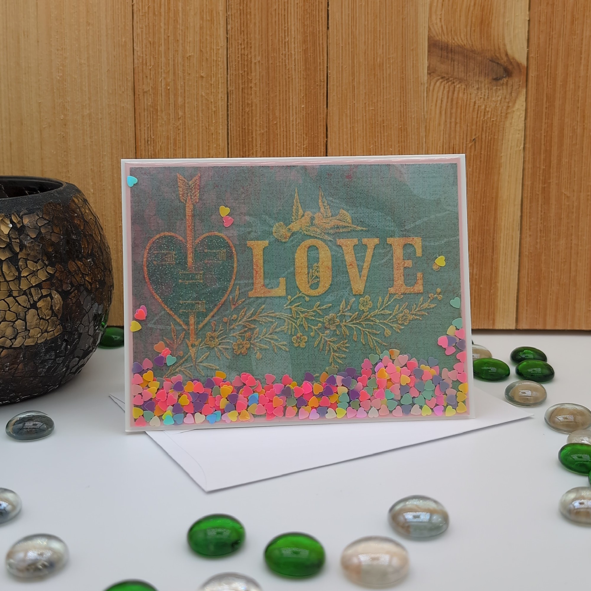 This handcrafted shaker card is a vibrant celebration of love. Featuring gold lettering, romantic bird and floral illustrations, and colorful heart-shaped confetti, it’s a joyful keepsake for Valentine’s Day, anniversaries, or everyday romance. Blank inside for your personal message, this card blends elegance and playfulness in a design that speaks straight to the heart.