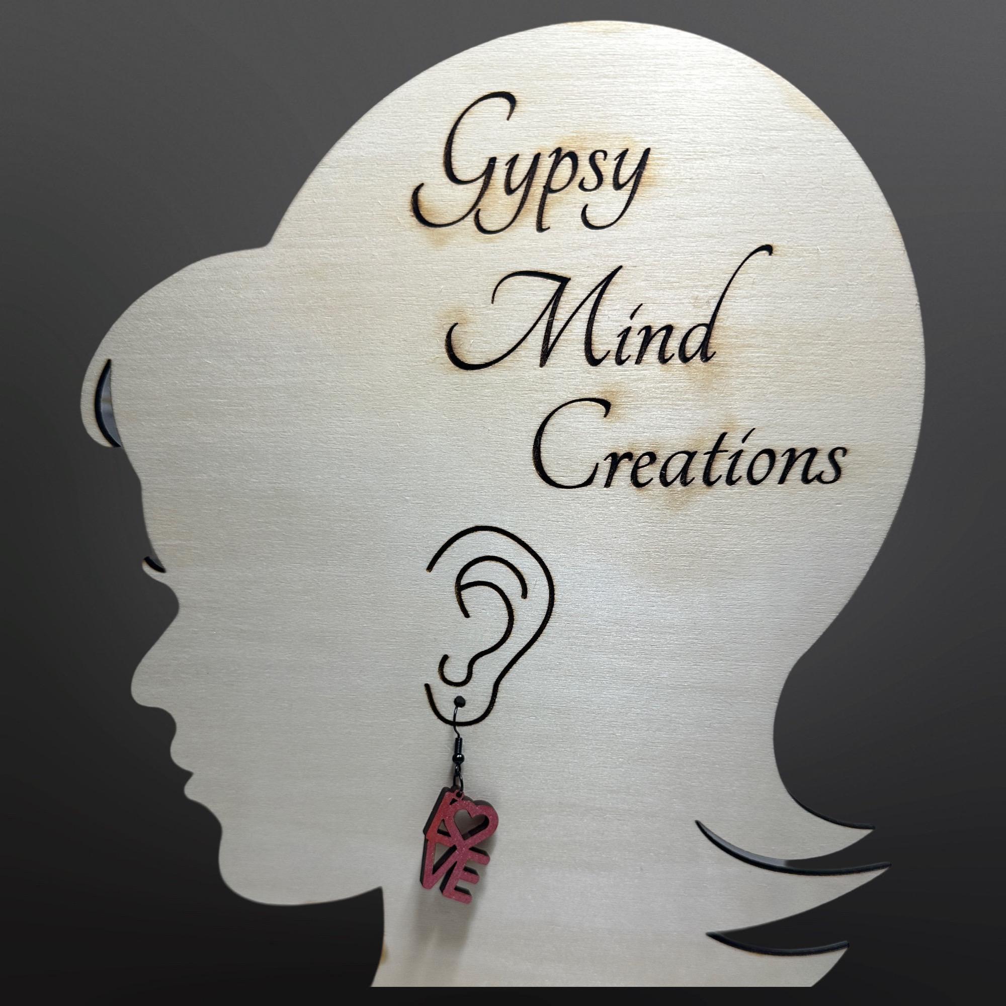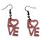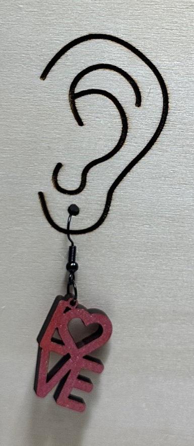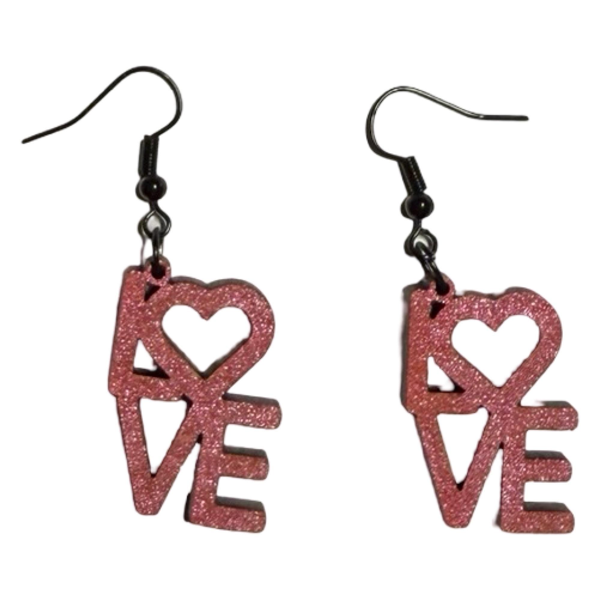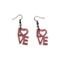 These are a pair of laser cut lightweight love word hand painted wood dangle earrings. They are made from 1/8 in thick medium draftboard and are painted with red glitter acrylic paint. The back is also painted. They are not sealed with any clear coat or anything. They are on ear wires. All metal components are silver, gold, or brass plated, or black alloy, nickel & lead free, and hypoallergenic. They are approx. 1” in long. Backs not included but available upon request.