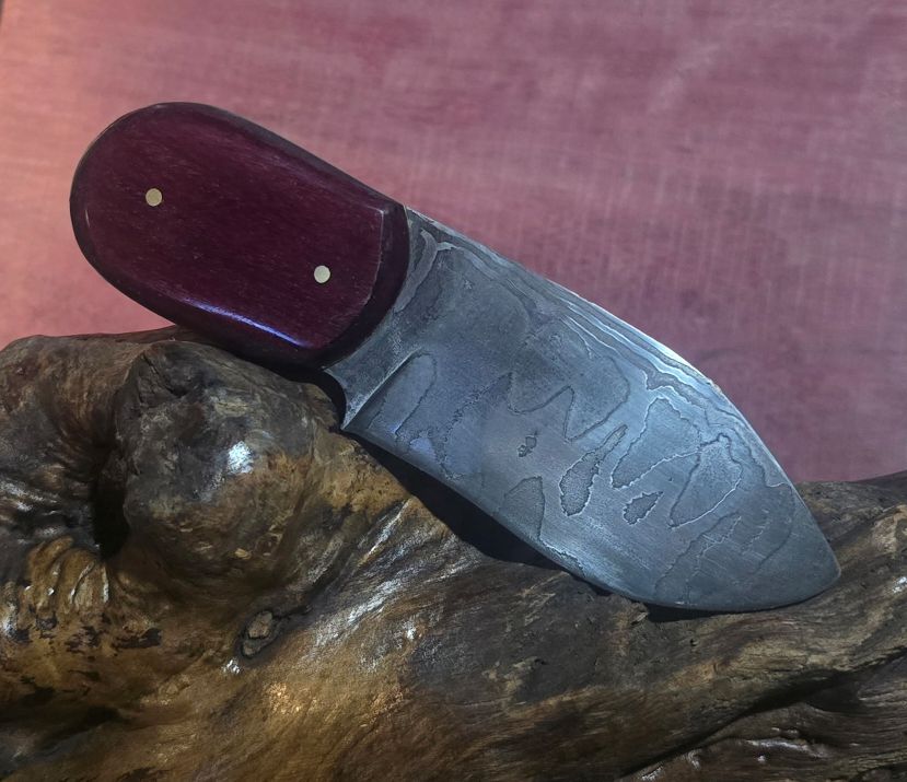 Hand forged pattern welded 1095 and 15N20 high carbon steel. Low layer to give a unique one-of-a-kind pattern. Brass liners and brass pins. The handle is made from the same stabilized purple heart I sell in my shop.